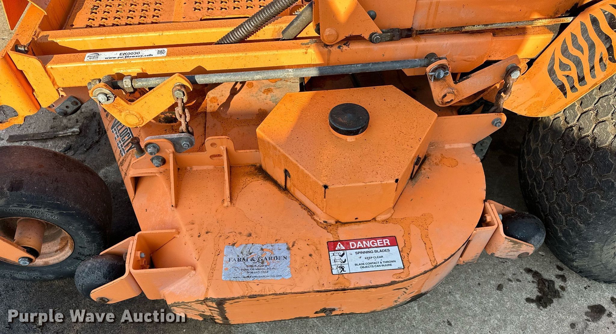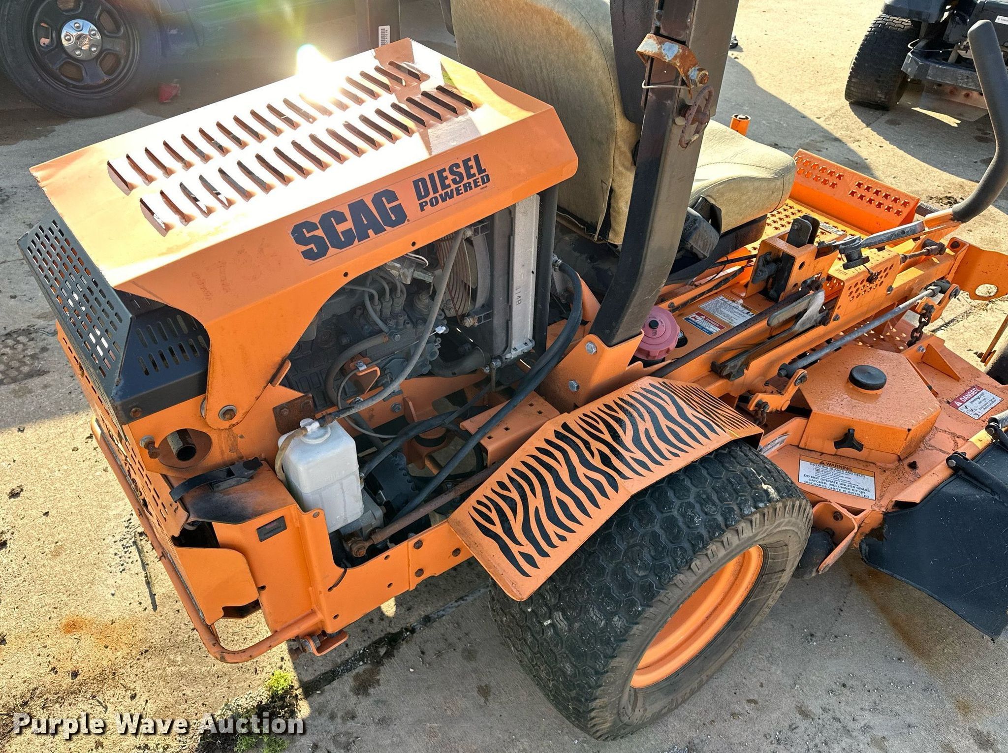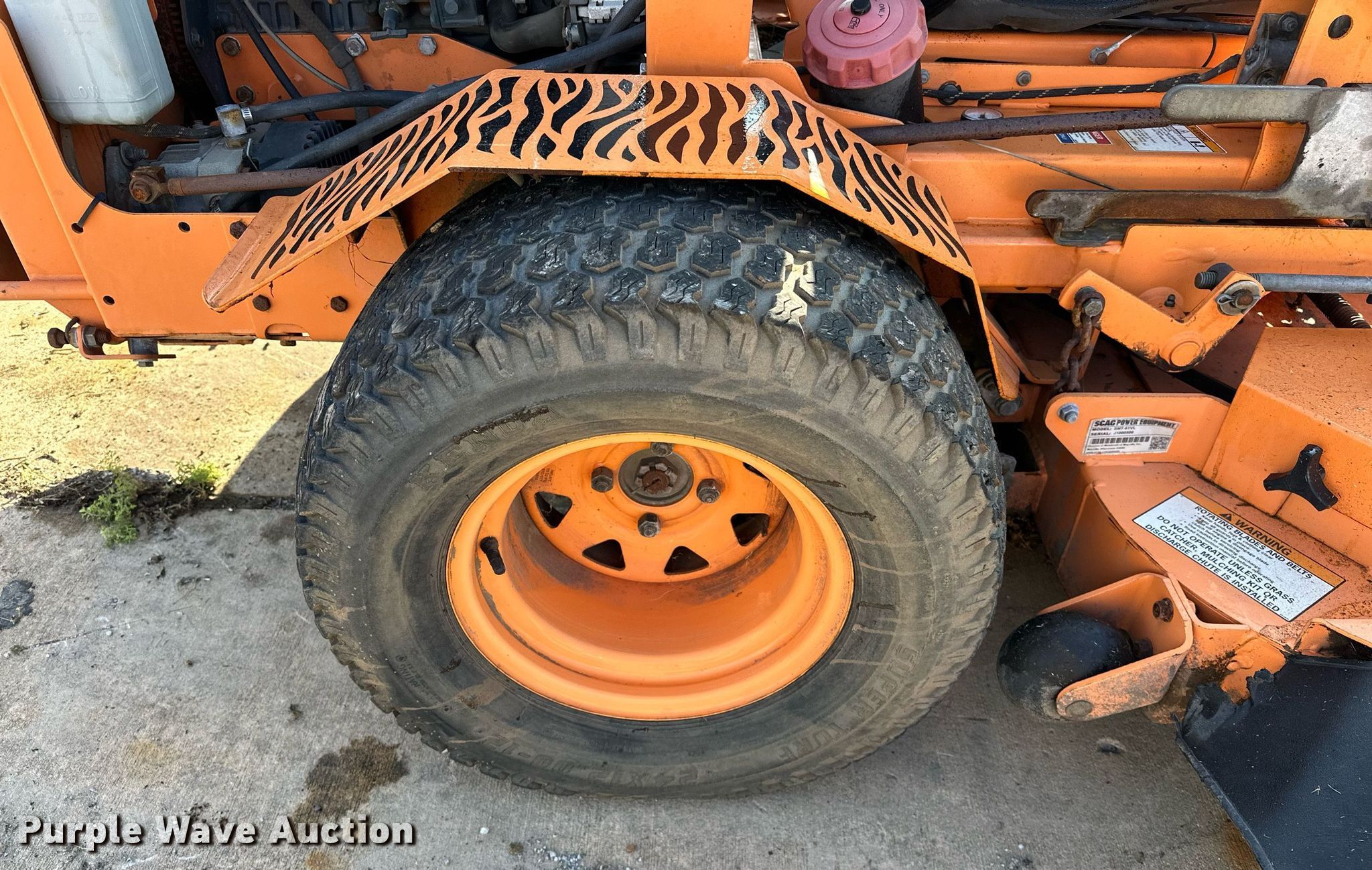 Purple Wave is selling a used Commercial Turf Mower in Oklahoma. This item is a Scag Turf Tiger Velocity Plus ZTR lawn mower with the following: Cutting width: 61", Serial: K1600498, Unit #: 1736