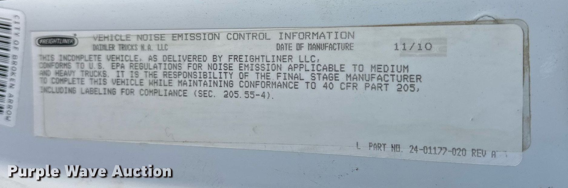 2011 Freightliner Business Class M2 dump truck. Miles: Unknown, VIN: 1FVHC3BS8BHBB1154, Unit #: 1116. Engine Cummins ISC8.3, Serial: 73160344, Displacement: 8.3L, Cylinders: 6, Fuel type: Diesel. Transmission Allison, Automatic. Chassis Axles: Tandem, Differential lock: Inter-axle, Suspension: Spring over walking beam, Brakes: Air, PTO, GVWR: 53,220 lbs FAWR: 13,220 lbs, IAWR: 20,000 lbs, RAWR: 20,000 lbs. Interior AC, Heat, Cruise control. Features Dump bed Davis, 15' L x 96" W, Side height: 39", Side board height: 8", Bed type: Steel, Ram: Single, End gate: Air operated. Tires Size: 11R22.5. Notes Windshield chipped or cracked, Dead battery, Unknown operating condition of dump bed, Unknown operating condition. Oklahoma title. Mileage has not been verified. Odometer discrepancy will be marked on the title. City of Broken Arrow. Broken Arrow, OK 74012