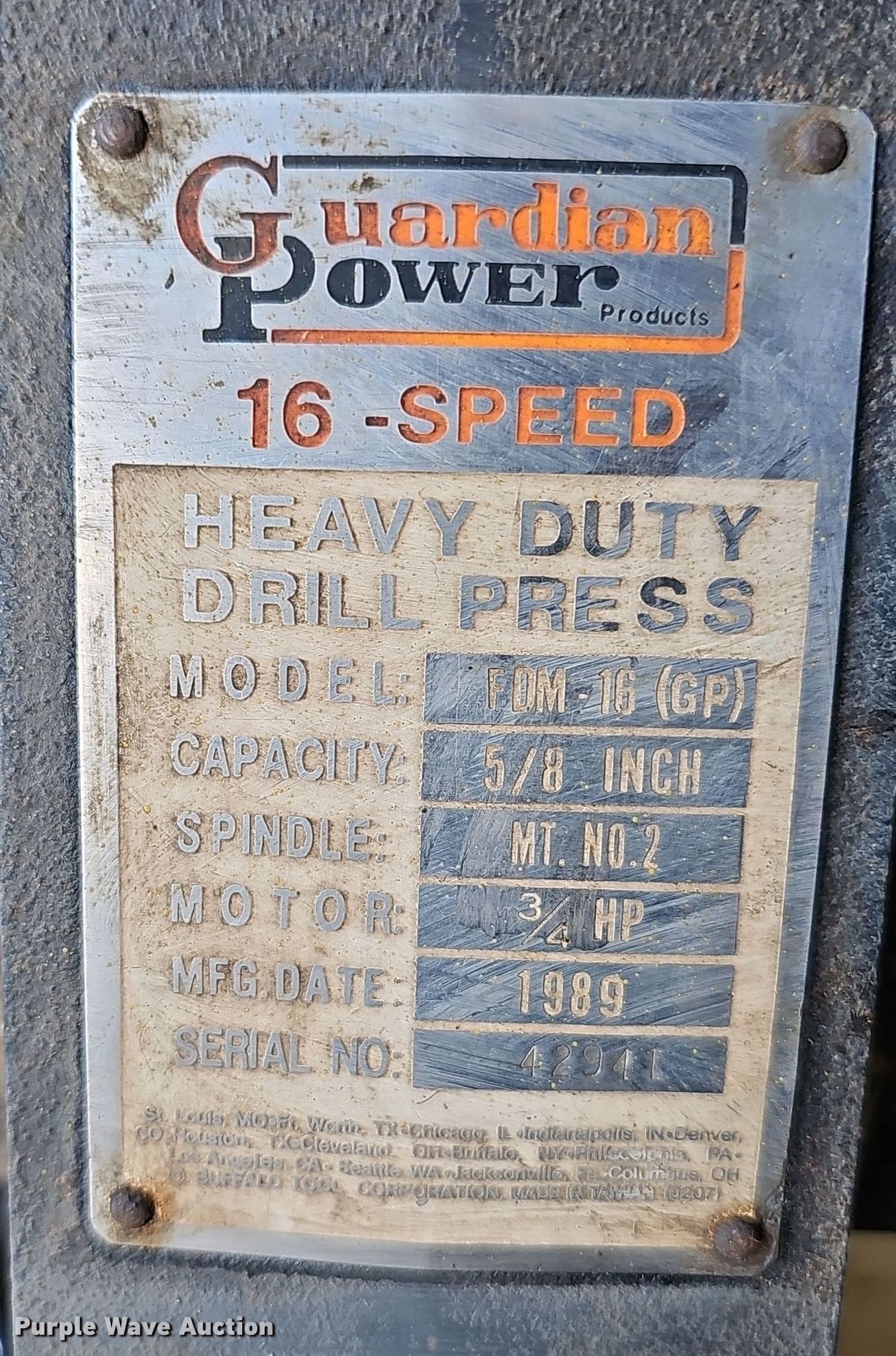 Purple Wave is selling a used Tools in Missouri. This item is a 1989 Guardian Power drill press with the following: Serial: 42041
