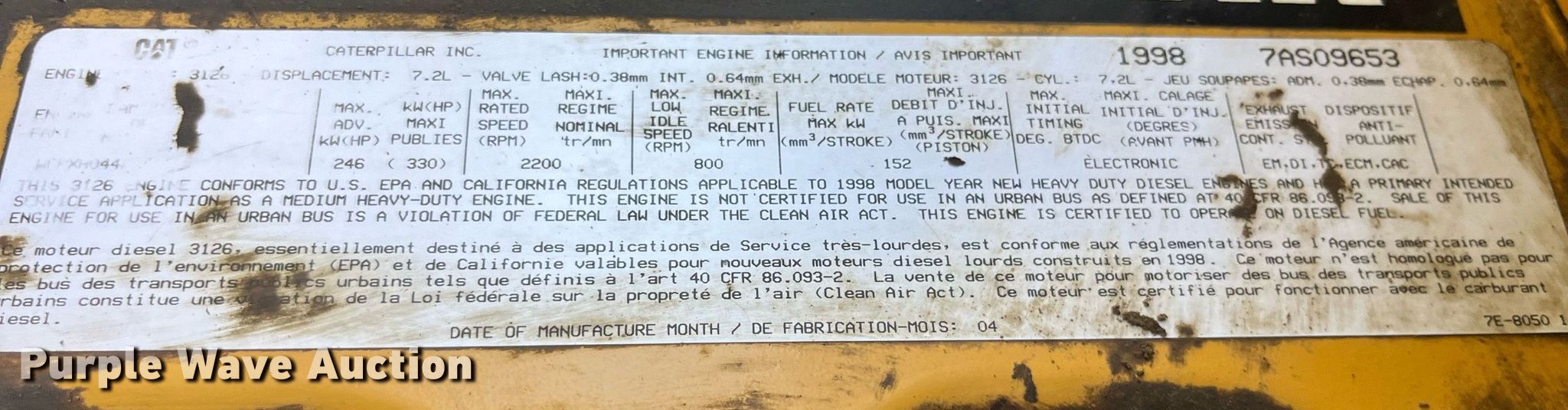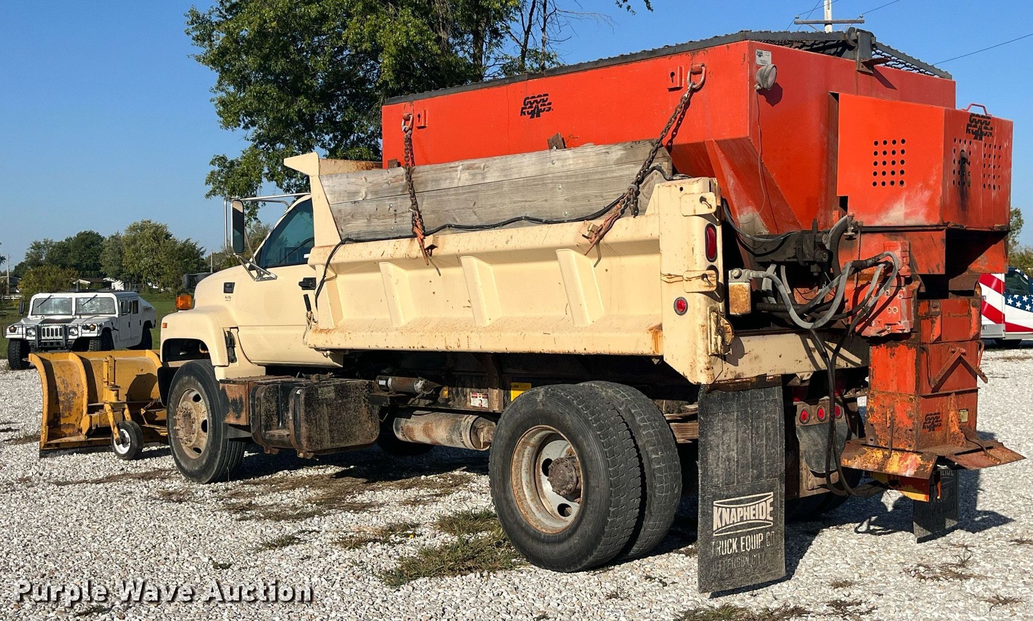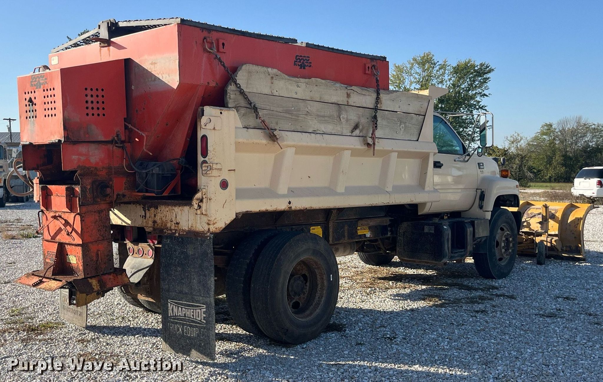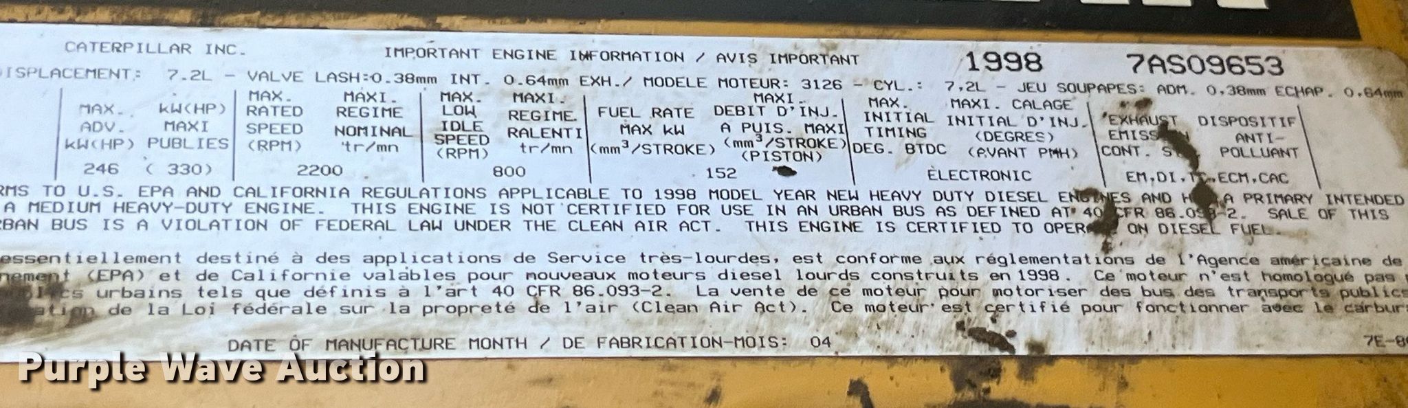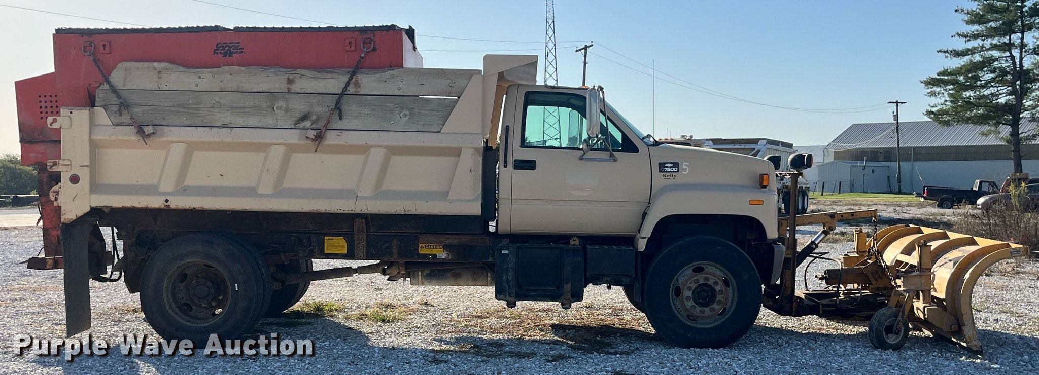 1998 Chevrolet C7500 dump truck. Miles: 43,384 on odometer, VIN: 1GBL7H1C3WJ110693. Engine Caterpillar 3126, Serial: 7AS09653, Displacement: 7.2L, Cylinders: 6, Fuel type: Diesel. Transmission Manual, Speed: 7. Chassis Double frame, Axles: Single, Suspension: Spring, Brakes: Hydraulic, PTO, GVWR: 33,000 lbs. Interior AC, Heat, Brake controller. Features Dump bed Heil SLT6YD12, 12' L x 95" W, Side height: 28", Side board height: 22", Bed type: Steel, Ram: Single, End gate: Manual, Spreader Good Roads EH-3-10FT, Plow Baker P10PA38.A, Width: 120". Tires Size: 11R22.5. Notes Tailgate removed but included, Non-operational spreader. Missouri title. Seller is a government entity who will be assigning and distributing the title. Please contact the seller for distribution questions. Title distribution may be delayed up to 14 days from verification of funds. Randolph County. Huntsville, MO 65259