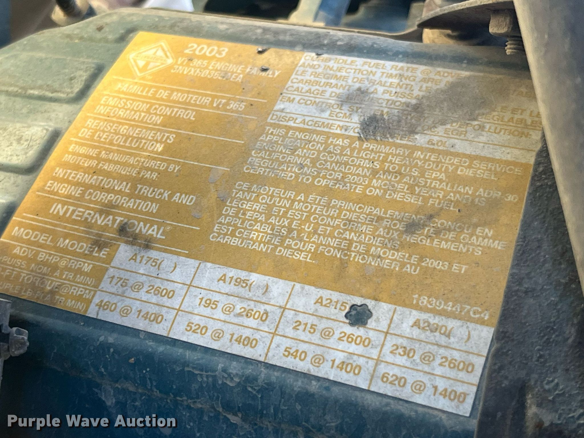 2004 International 4200 SBA truck cab and chassis. Miles: 153,392 on odometer, Hours: 5,735 on meter, VIN: 1HTMPAFM94H605836. Engine International A215, Displacement: 6.0L, Cylinders: 6, Fuel type: Diesel. Transmission Automatic. Chassis Axles: Single, Suspension: Spring, Brakes: Hydraulic, Truck chassis: 190". Interior Heat, Cruise control. Features Fuel tank: Single. Tires Size: 10R22.5. Notes Dash warning indicator: ABS, ECON. Missouri title. Seller is a government entity who will be assigning and distributing the title. Please contact the seller for distribution questions. Title distribution may be delayed up to 14 days from verification of funds. Central DeKalb Co Fire Protect. Maysville, MO 64469