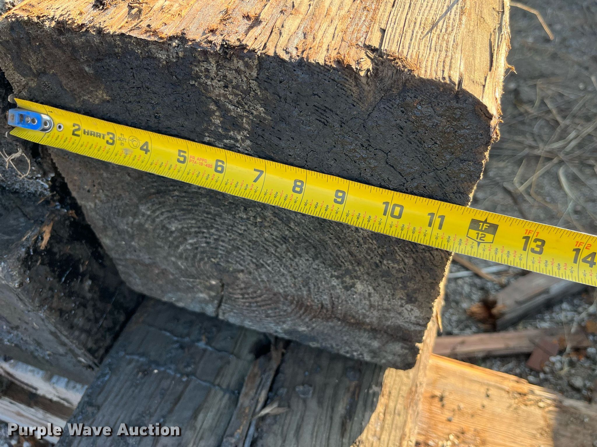Purple Wave is selling a used Building Materials in Iowa. This item is a Approximately 16 wood beams with the following: Approx. dimensions, 22' x 11" x 11", 12' 10" x 11.5" x 11.5", 20' x 12" x 12"