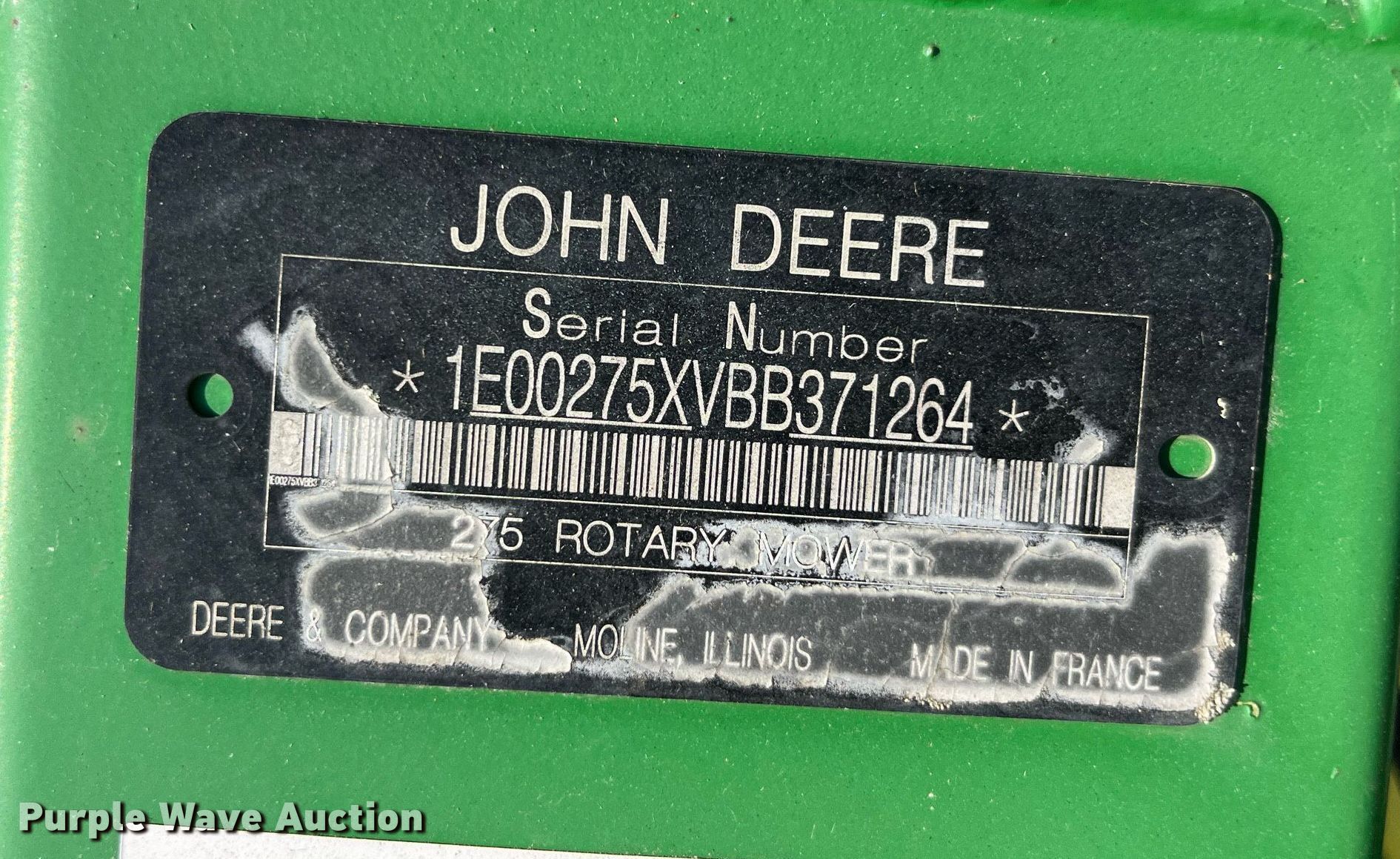 John Deere 275 disc mower. Features. Width: 9', Hydraulic lift, PTO: 540, Hitch: Three point. Davis County Highway. Bloomfield, IA 52537
