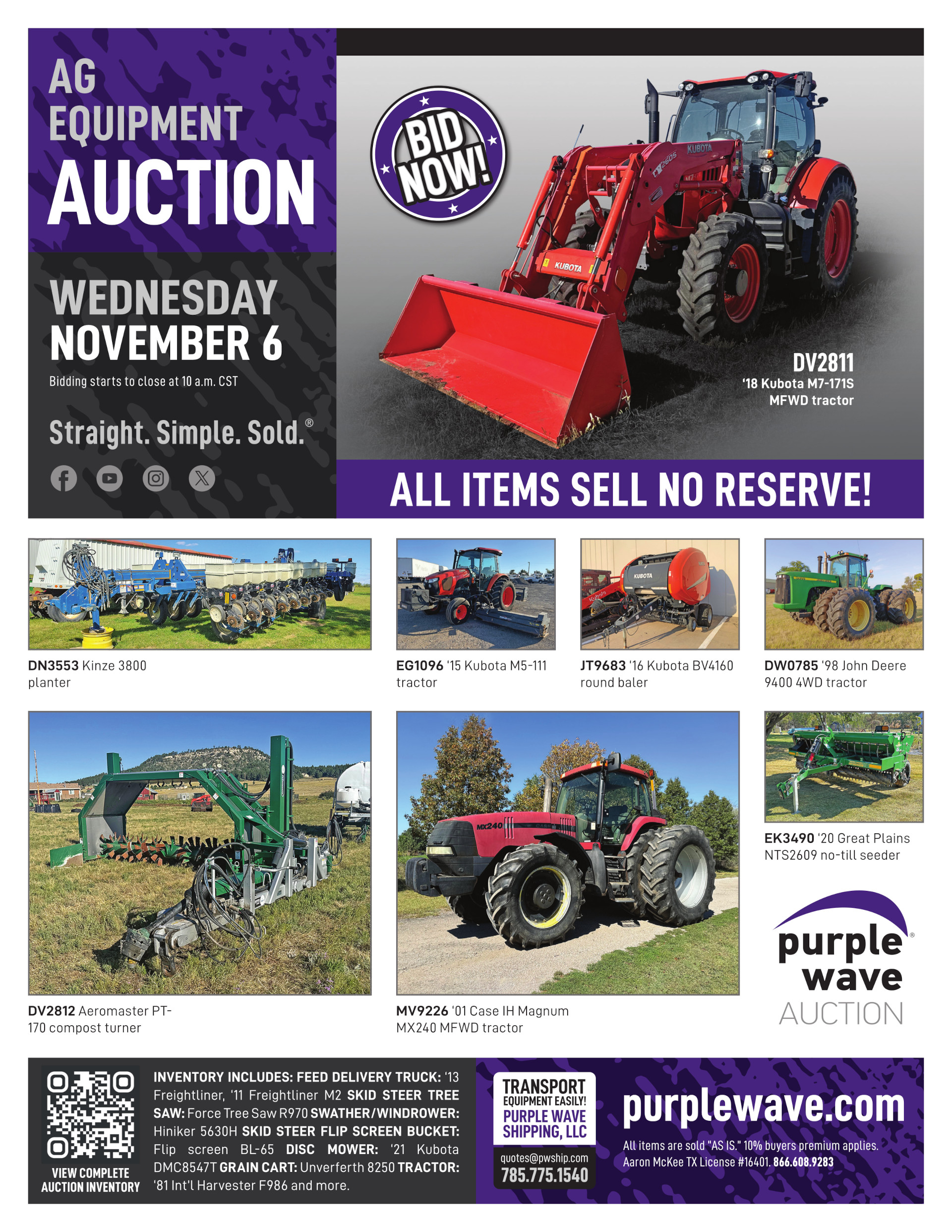 Purple Wave Shipping, LLC provides shipping and transportation services to winning bidders on ag, construction and fleet type assets. Purple Wave Shipping, LLC does not provide shipping on items weighing less than 1,000 pounds.