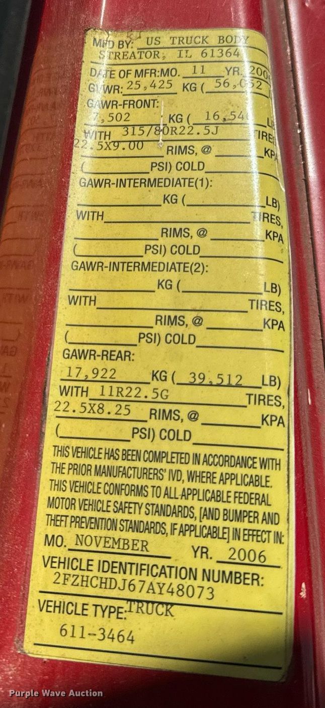 2007 Sterling Acterra feed delivery truck. Miles: 663,955 on odometer, Hours: 22,366 on meter, VIN: 2FZHCHDJ67AY48073, Unit #: 330. Engine Mercedes Benz, Displacement: 7.2L, Cylinders: 6, Fuel type: Diesel. Transmission Eaton Fuller Roadranger RTO-8LL, Manual, Speed: 10. Chassis Differential lock, Axles: Tandem, Suspension: Air, Brakes: Air, PTO. Interior AC, Heat, Heated mirrors, Cruise control. Features Delivery bed Midwest general 400ALRC-4, Serial: FB876, 20' L, Compartments: 4, Discharge auger Diameter: 10", Length: 30', Rear, Ground controls. Tires Front: 315/80R22.5, Rear: 11R22.5. Notes Rear Cross auger removed but included Needs repaired, Non-operational passenger door. Wisconsin title. Title distribution may be delayed up to 30 days from verification of funds. Furst MCNess. Lodi, WI 53555