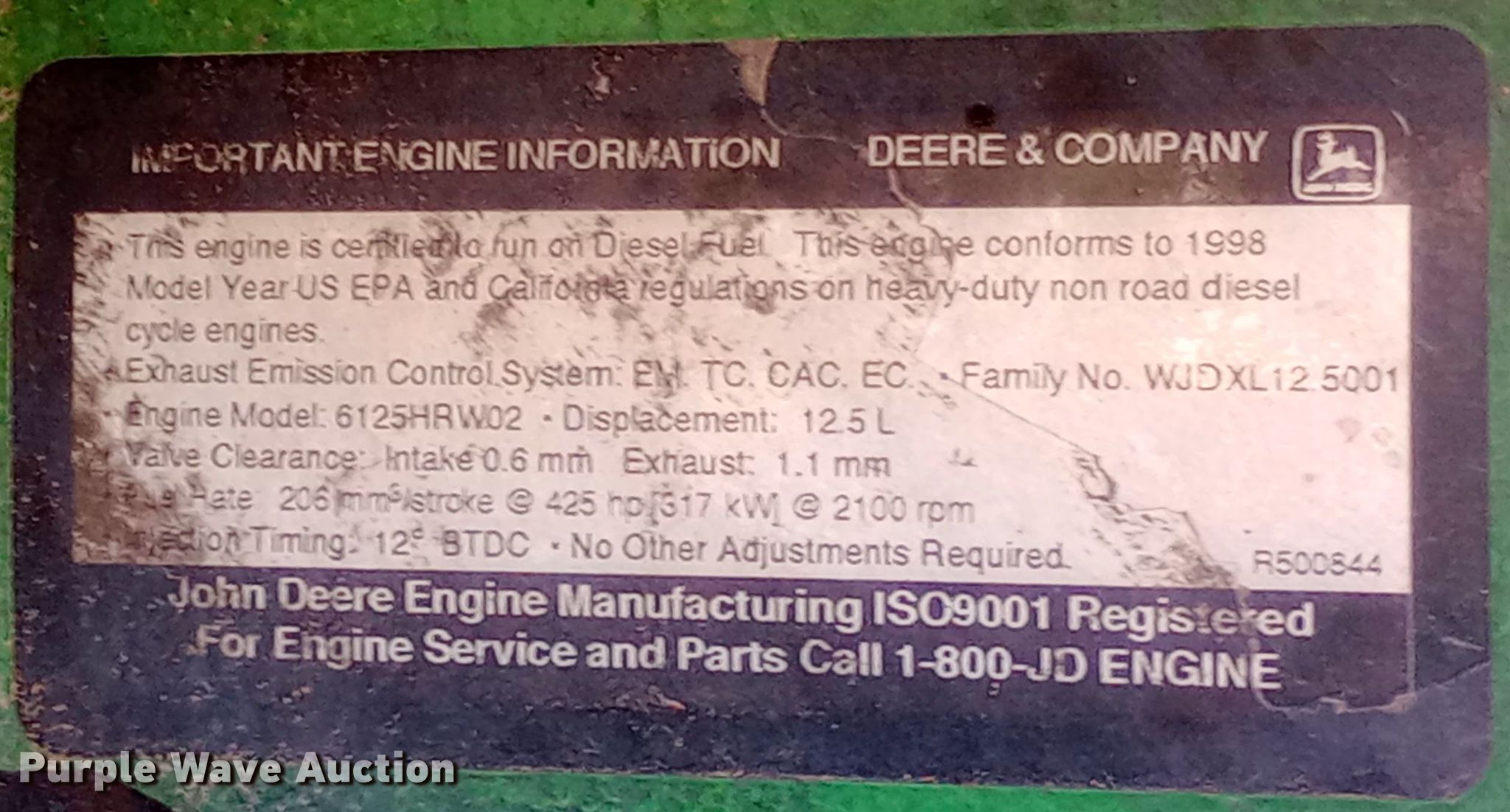 1998 John Deere 9400 4WD tractor. Hours: 173 on meter Actual hours unknown, Serial: RW9400H010650. Engine John Deere 6125HRW02, Displacement: 12.5L, Cylinders: 6, Fuel type: Diesel. Transmission Powershift, 24F - 6R. Chassis Differential lock. Operators station AC, Heat. Features Seven pin outlet, Hydraulic remote sets Rear: 4. Tires Size: 710/70R38, Duals. Notes Battery issues, weak, AC needs charged. Darling Farms. Lamont, OK 74643
