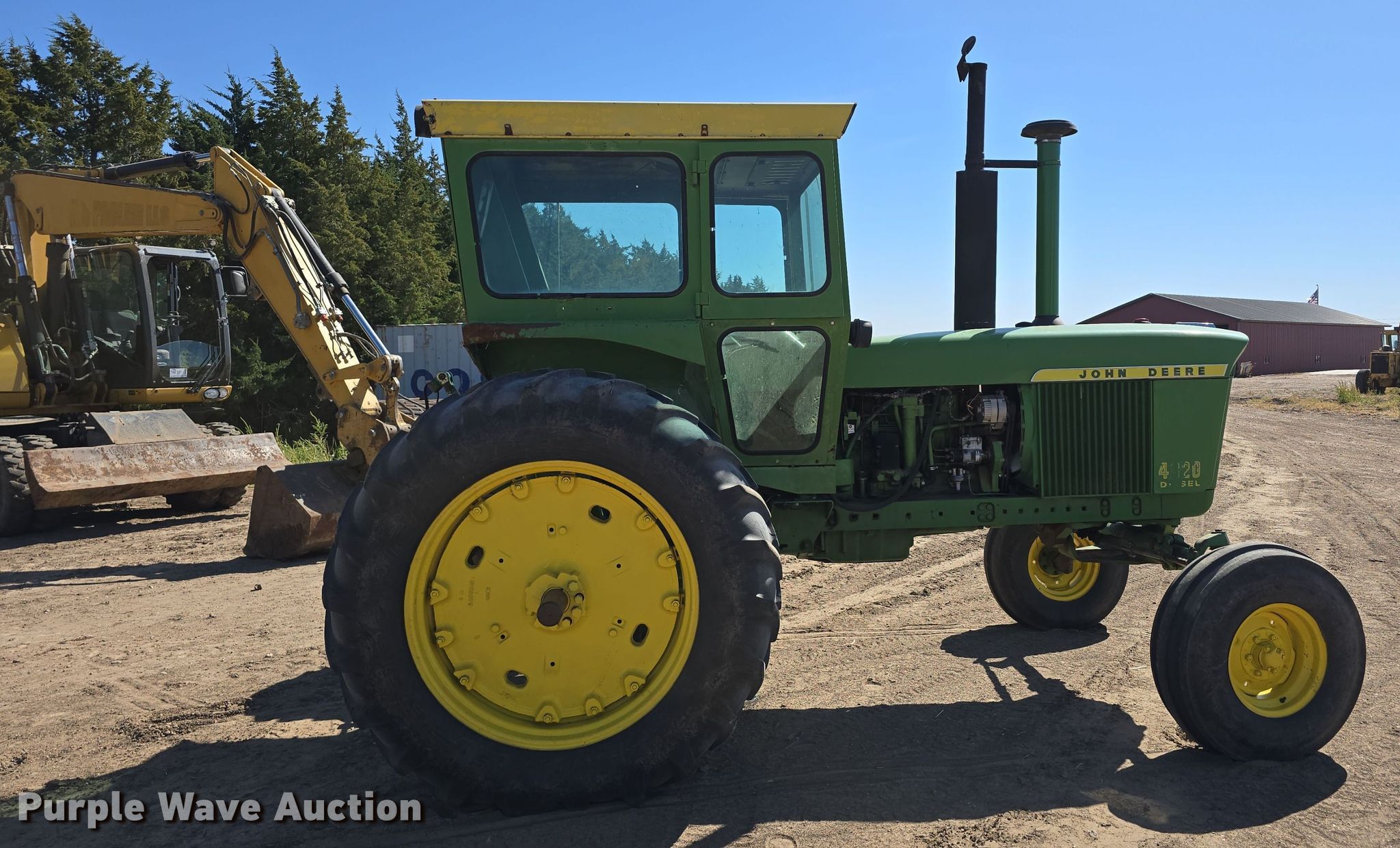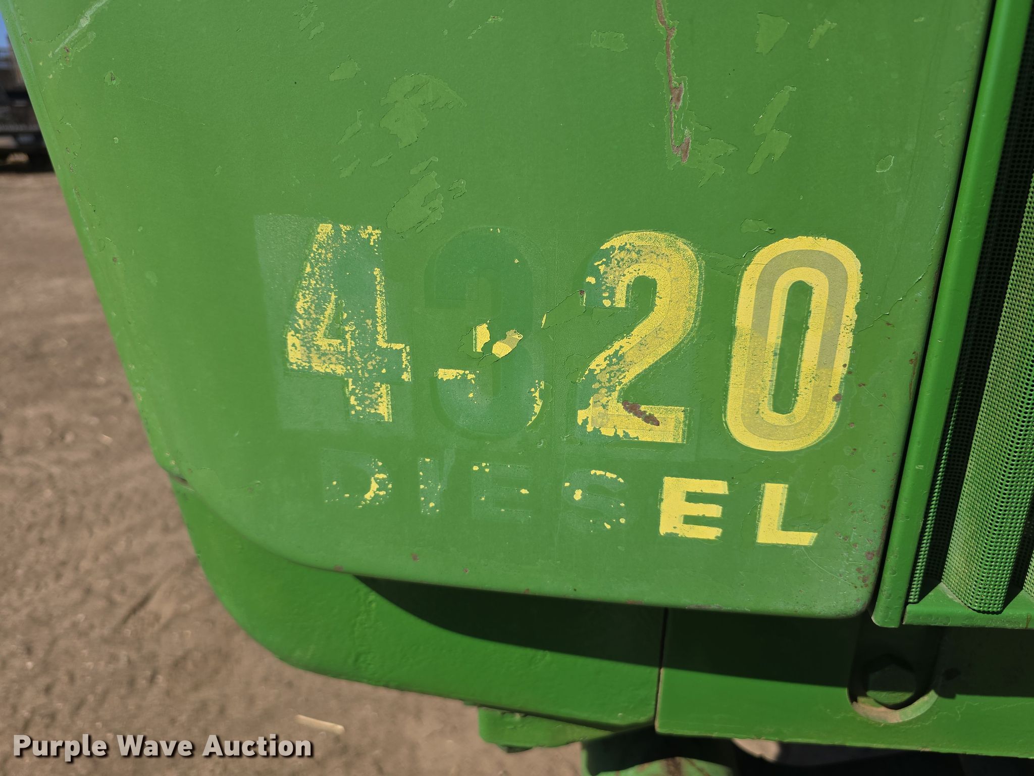 1971 John Deere 4320 tractor. Hours: 1,223 on meter Actual hours unknown, Serial: 014809R. Engine John Deere, Cylinders: 6, Fuel type: Diesel. Transmission Synchro, 8F - 2R. Operators station Heat. Features PTO: 540, 1000, Three point Top link, Hydraulic remote sets Rear: 2. Tires Front: 10.00-16, Rear: 16.9-38, Wheel weights: 2. Notes Hour meter exceeds mechanical limitation, Oil leak, PTO hydraulic leak. Prime Contracting. Ashton, NE 68817