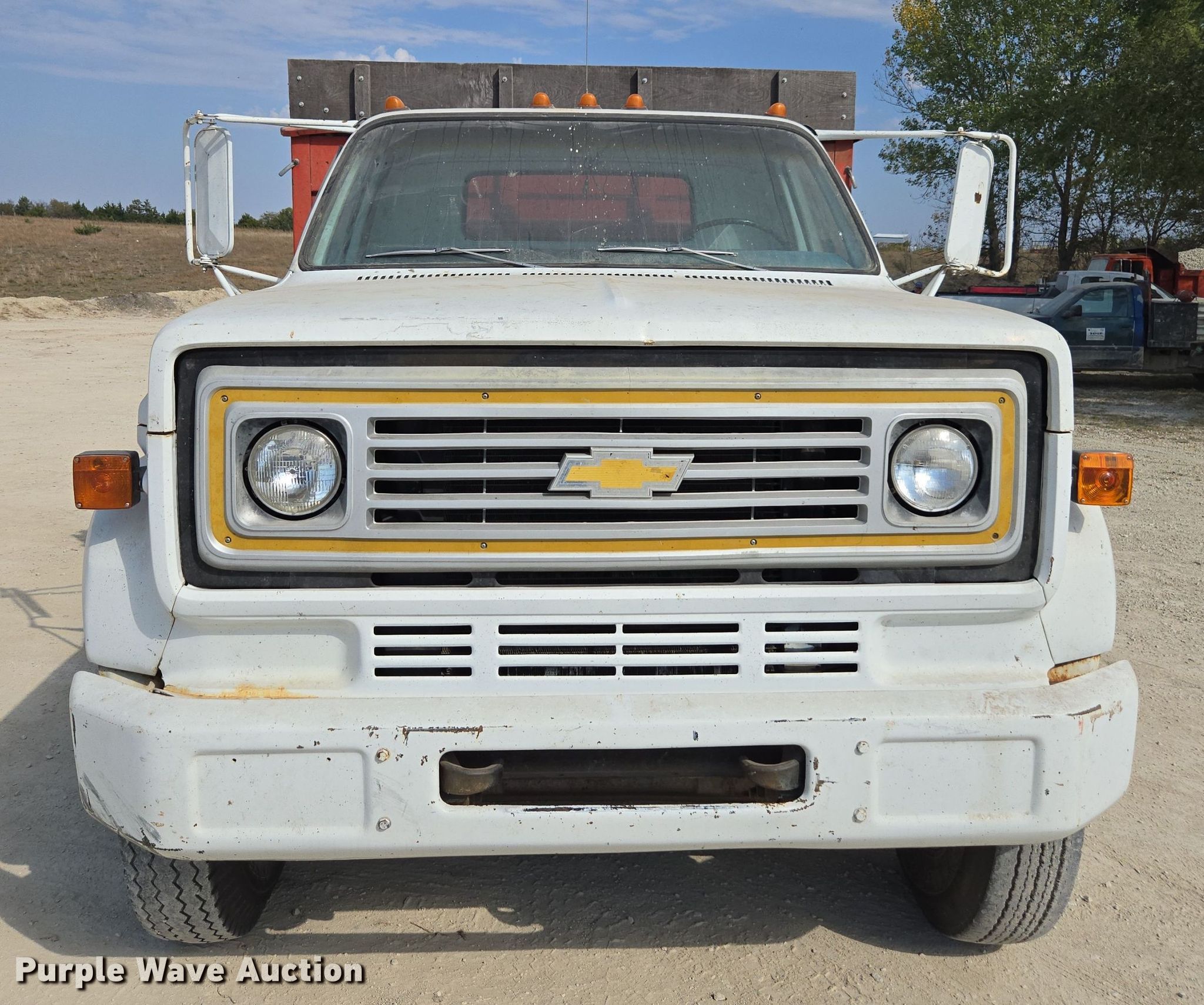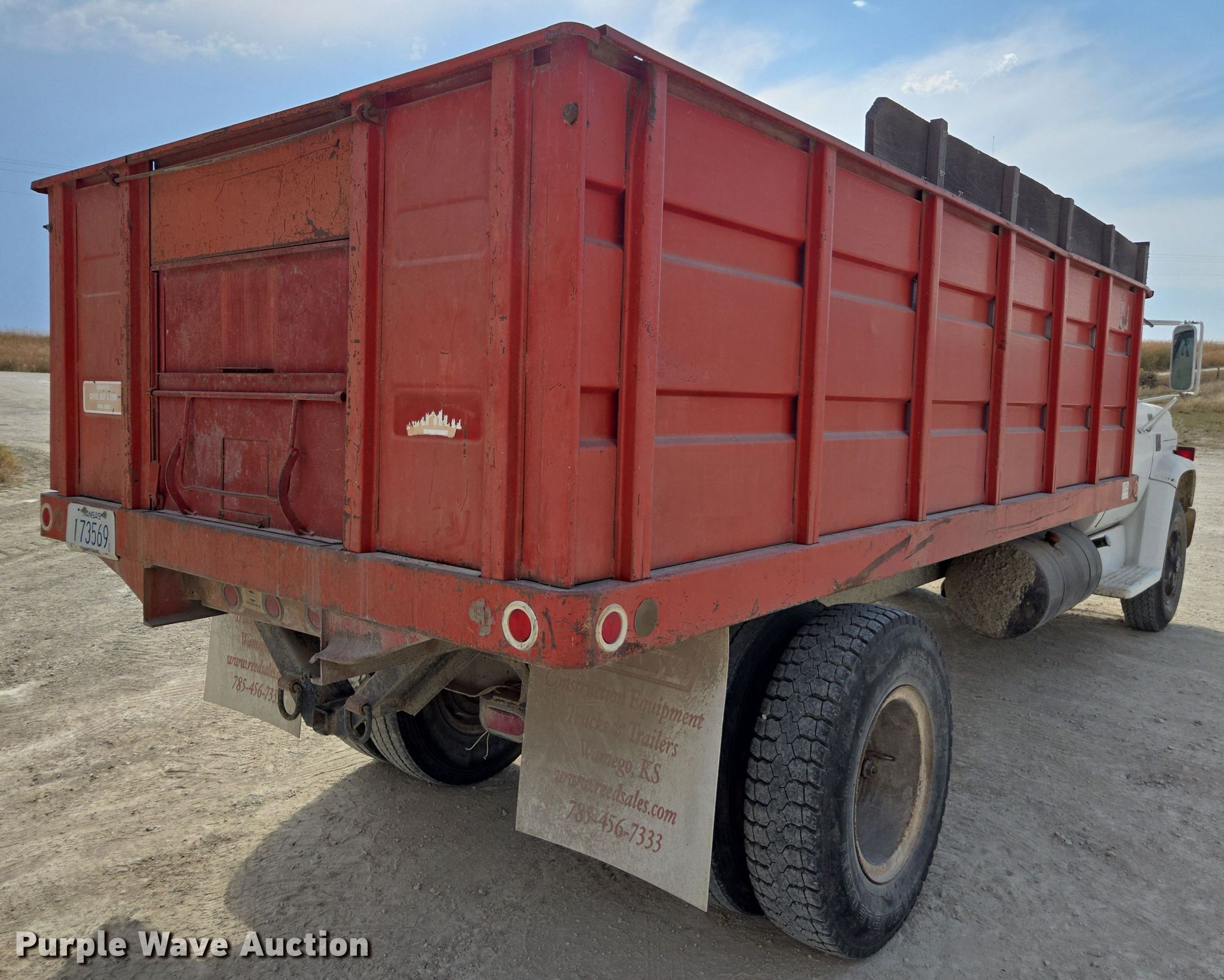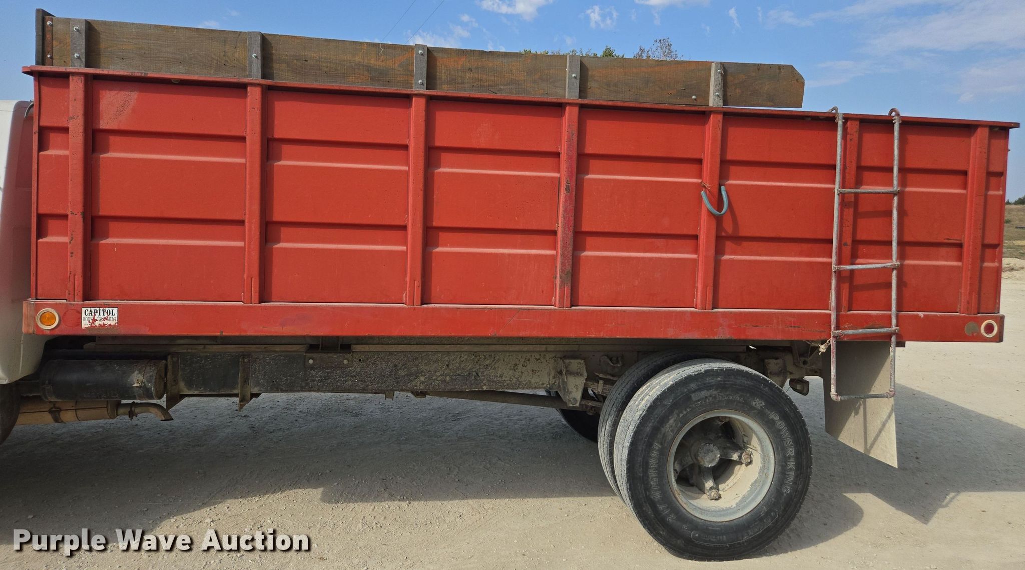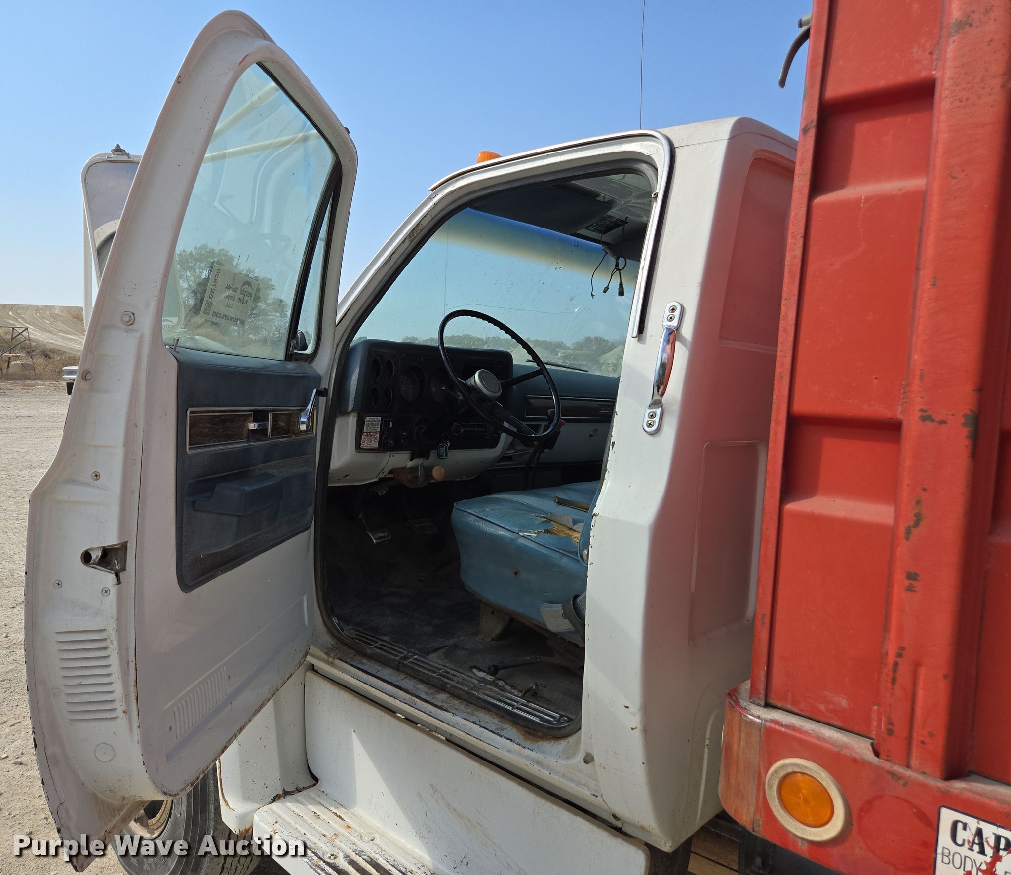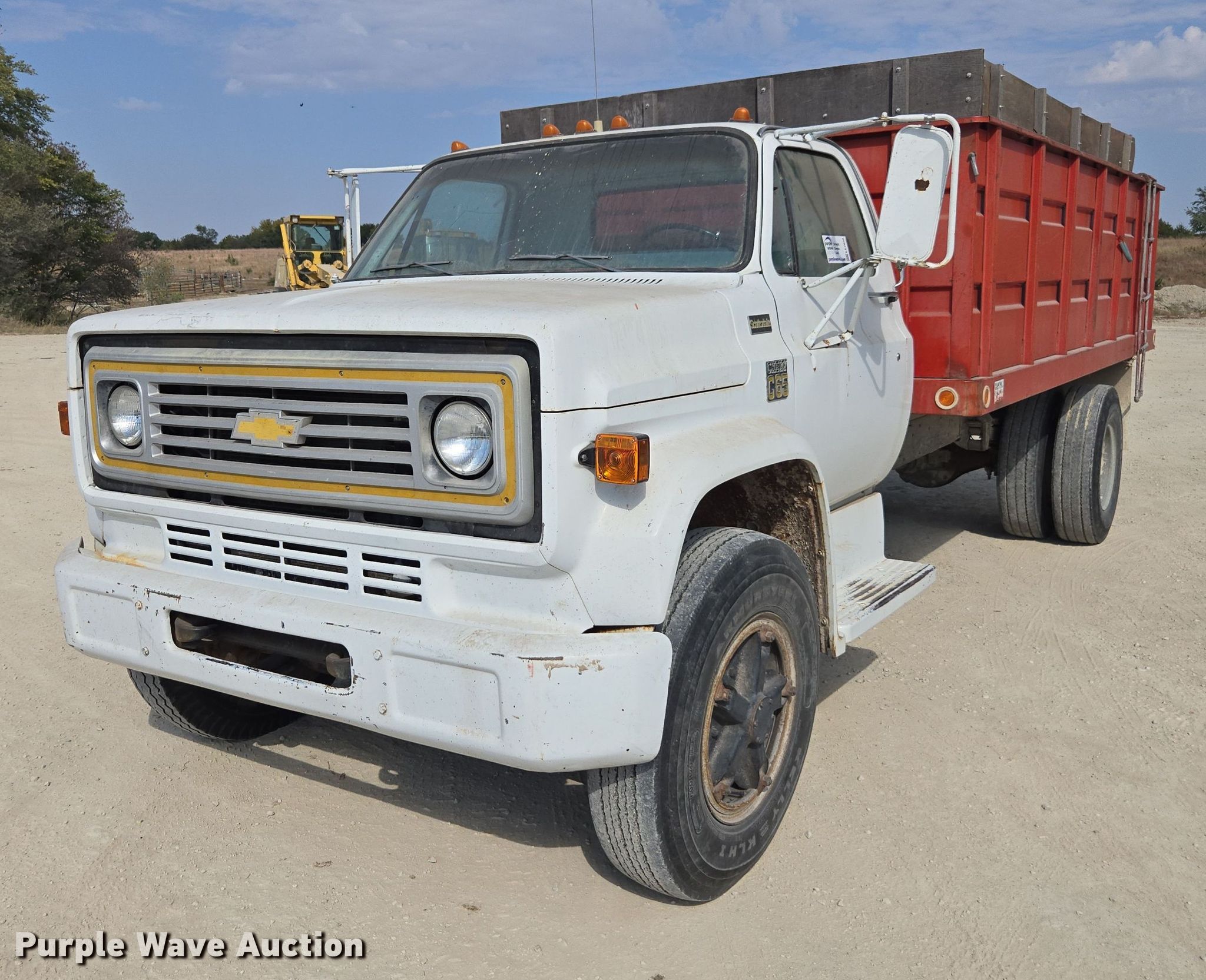 1976 Chevrolet C65 grain truck. Miles: 75,968 on odometer, VIN: CCE676V126212. Engine Cylinders: 8, Fuel type: Gas. Transmission Manual, Speed: 5, plus 2. Chassis Axles: Single, Suspension: Spring, Brakes: Hydraulic, PTO. Interior Heat. Features Dump bed Capitol, 16' L x 94" W, Side height: 40", Side board height: 9", Bed type: Steel, Ram: Single, End gate: Manual. Tires Front: 9.00R20, Rear: 10.00R20. Notes Windshield chipped or cracked. Kansas antique title. Saint George, KS 66535