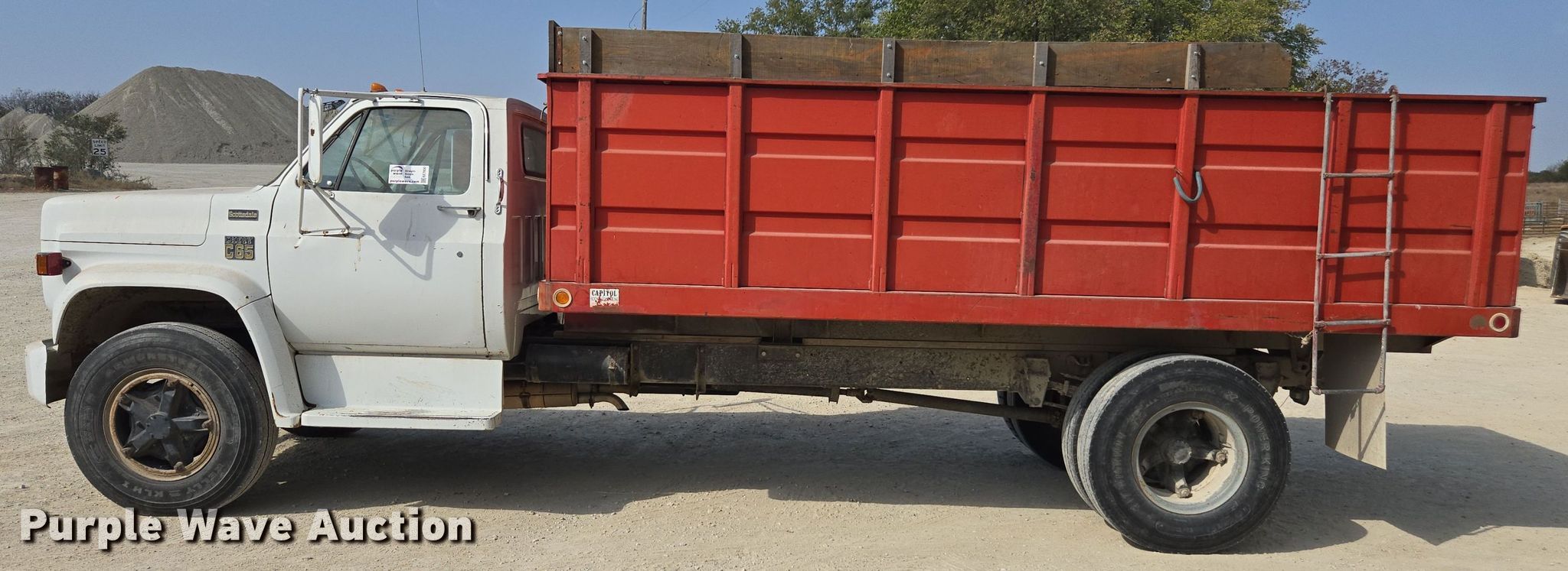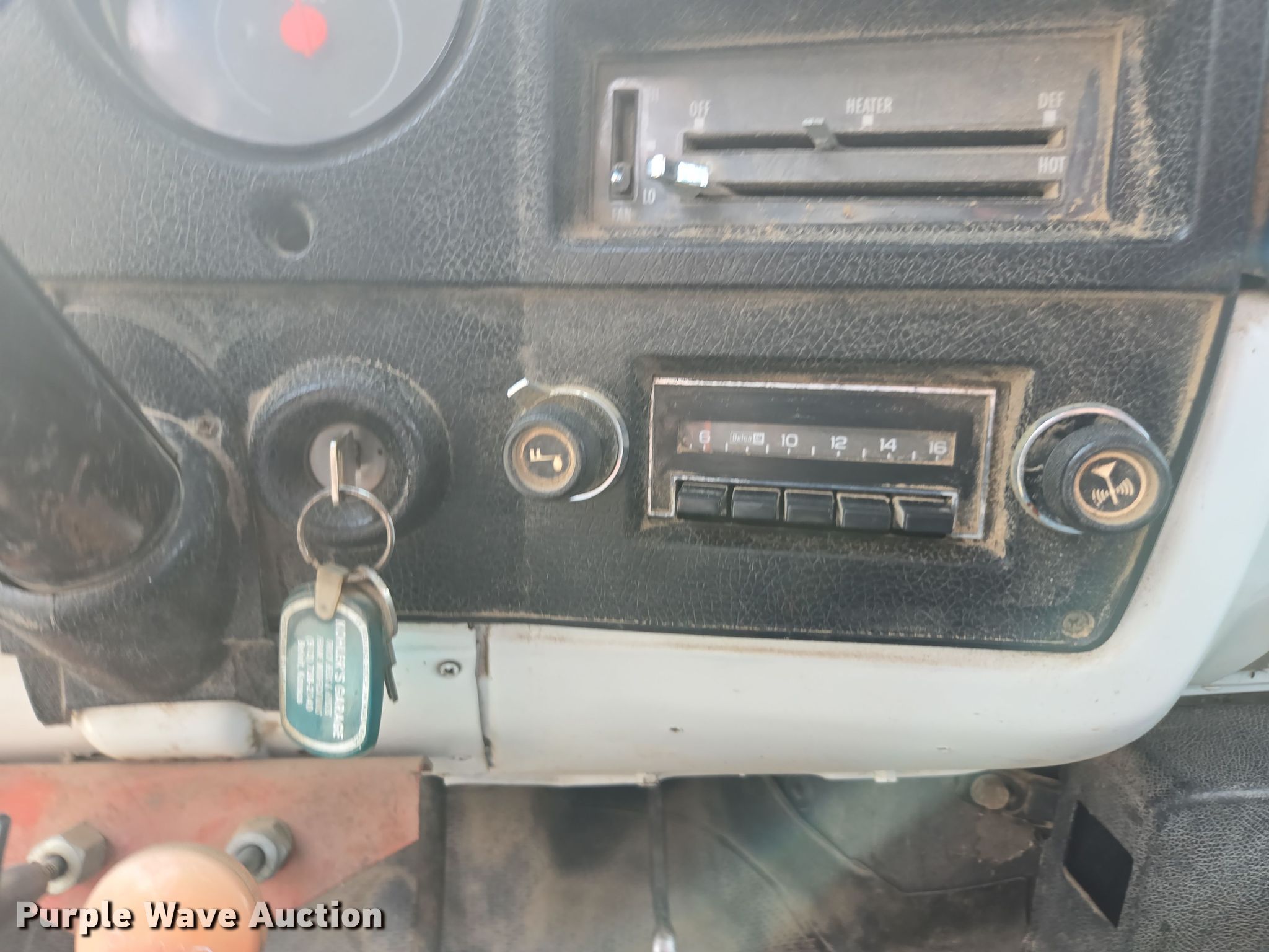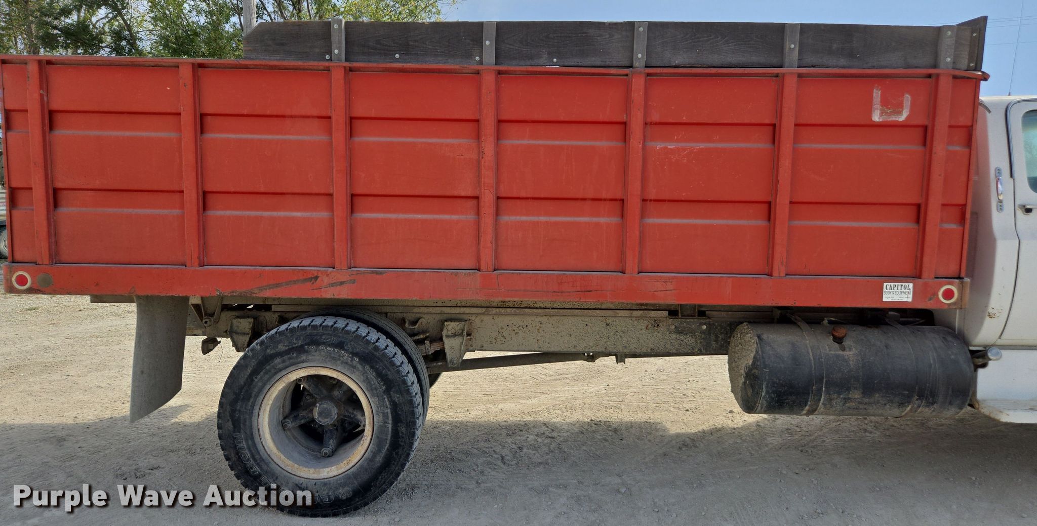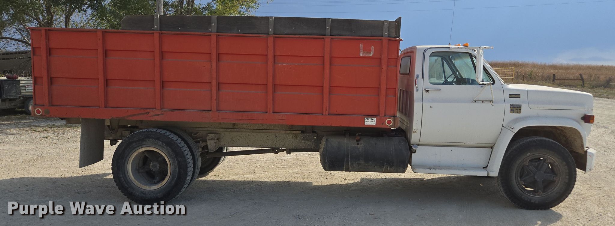 1976 Chevrolet C65 grain truck. Miles: 75,968 on odometer, VIN: CCE676V126212. Engine Cylinders: 8, Fuel type: Gas. Transmission Manual, Speed: 5, plus 2. Chassis Axles: Single, Suspension: Spring, Brakes: Hydraulic, PTO. Interior Heat. Features Dump bed Capitol, 16' L x 94" W, Side height: 40", Side board height: 9", Bed type: Steel, Ram: Single, End gate: Manual. Tires Front: 9.00R20, Rear: 10.00R20. Notes Windshield chipped or cracked. Kansas antique title. Saint George, KS 66535