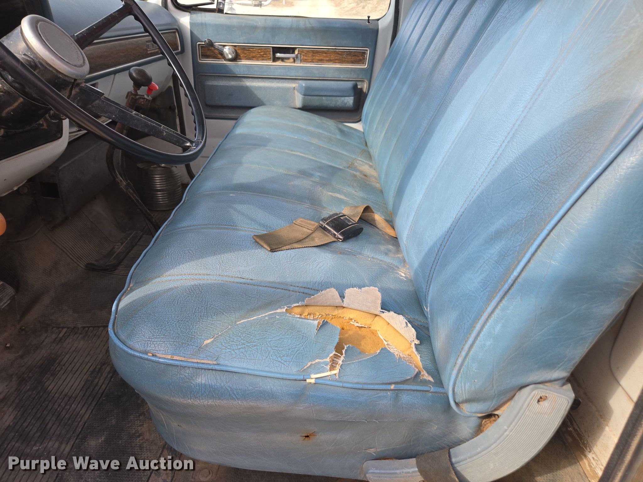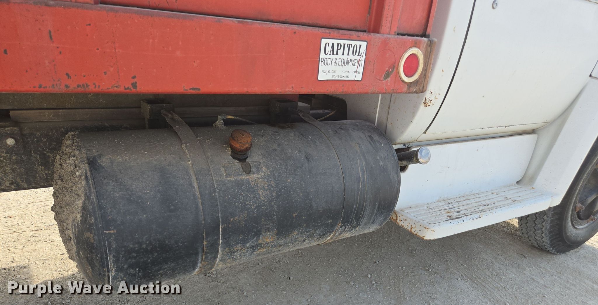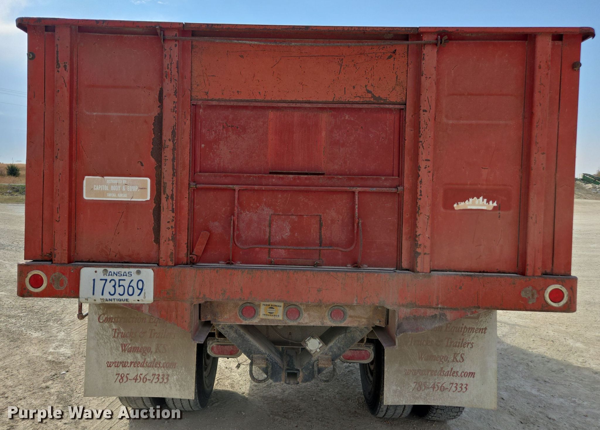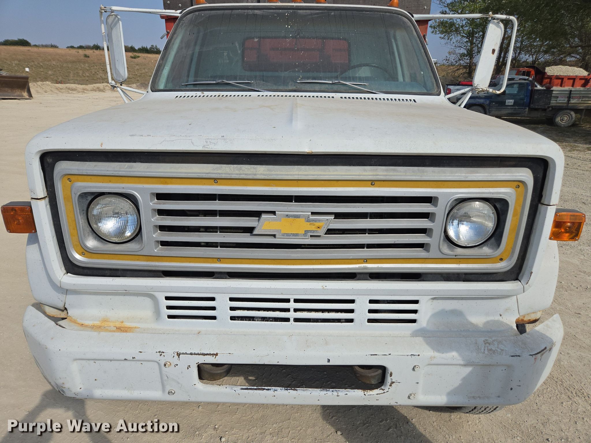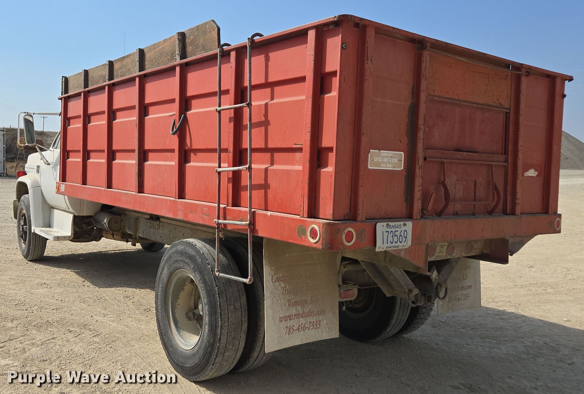 1976 Chevrolet C65 grain truck. Miles: 75,968 on odometer, VIN: CCE676V126212. Engine Cylinders: 8, Fuel type: Gas. Transmission Manual, Speed: 5, plus 2. Chassis Axles: Single, Suspension: Spring, Brakes: Hydraulic, PTO. Interior Heat. Features Dump bed Capitol, 16' L x 94" W, Side height: 40", Side board height: 9", Bed type: Steel, Ram: Single, End gate: Manual. Tires Front: 9.00R20, Rear: 10.00R20. Notes Windshield chipped or cracked. Kansas antique title. Saint George, KS 66535