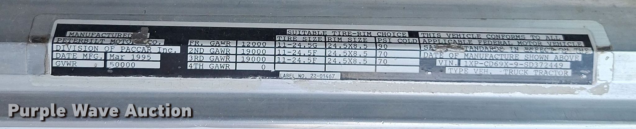 1995 Peterbilt 377 feed delivery truck. Miles: 1,664,813 on odometer, Hours: 1,378 on meter, VIN: 1XPCD69X9SD372449. Engine Cummins, Displacement: 14.0L, Cylinders: 6, Fuel type: Diesel. Transmission Eaton Fuller, Manual, Speed: 10. Chassis Axles: Triple, Tag axle, Suspension: Air, Brakes: Air, PTO, GVWR: 50,000 lbs. Interior AC, Heat, Heated mirrors. Features Delivery bed Discharge auger Diameter: 9", Length: 22', Rear.. Tires Size: 11R22.5. Oklahoma title. Mileage has not been verified. Exempt will be written in the odometer disclosure on the title. Apache Farmers Coop. Chickasha, OK 73018