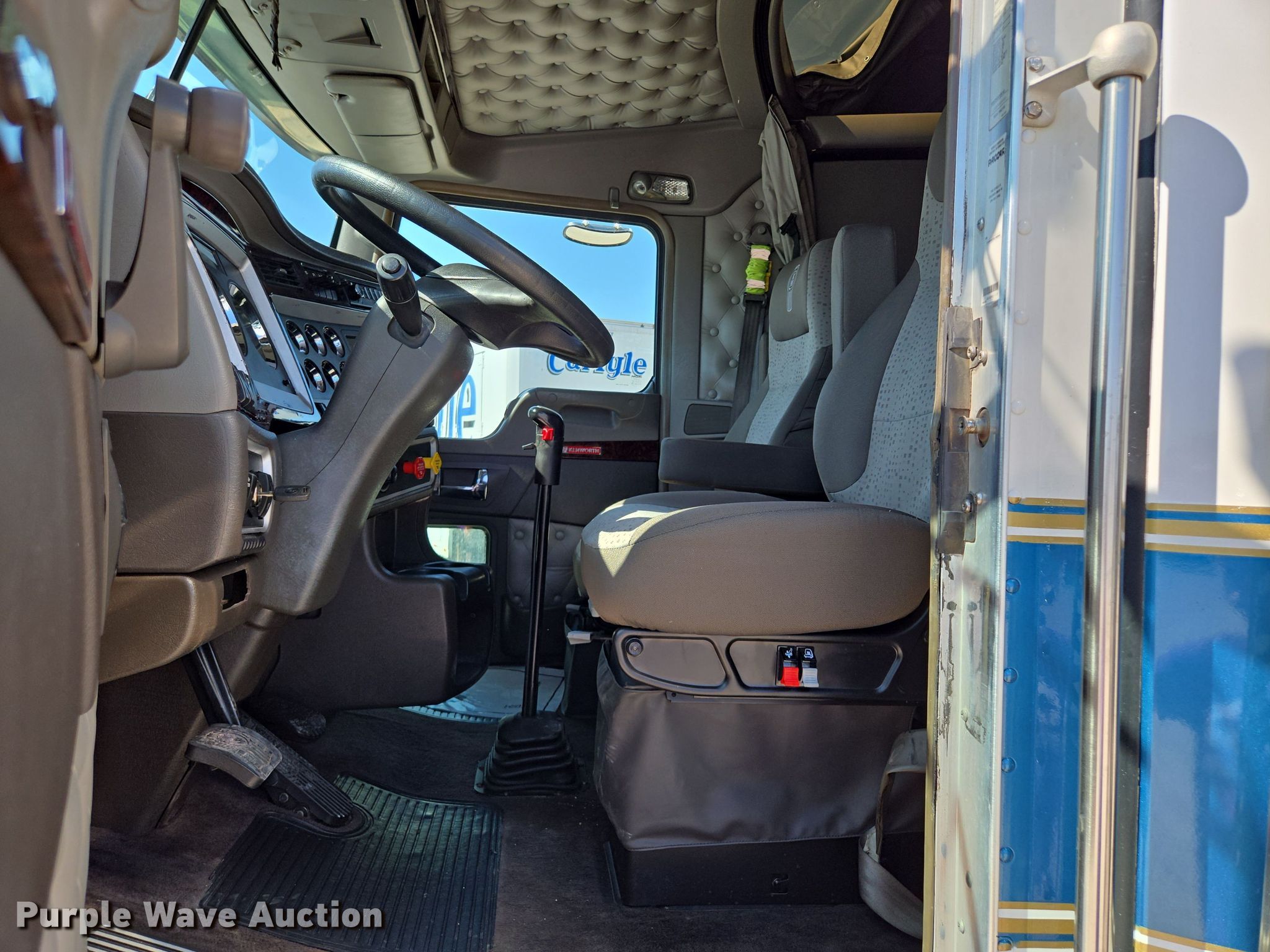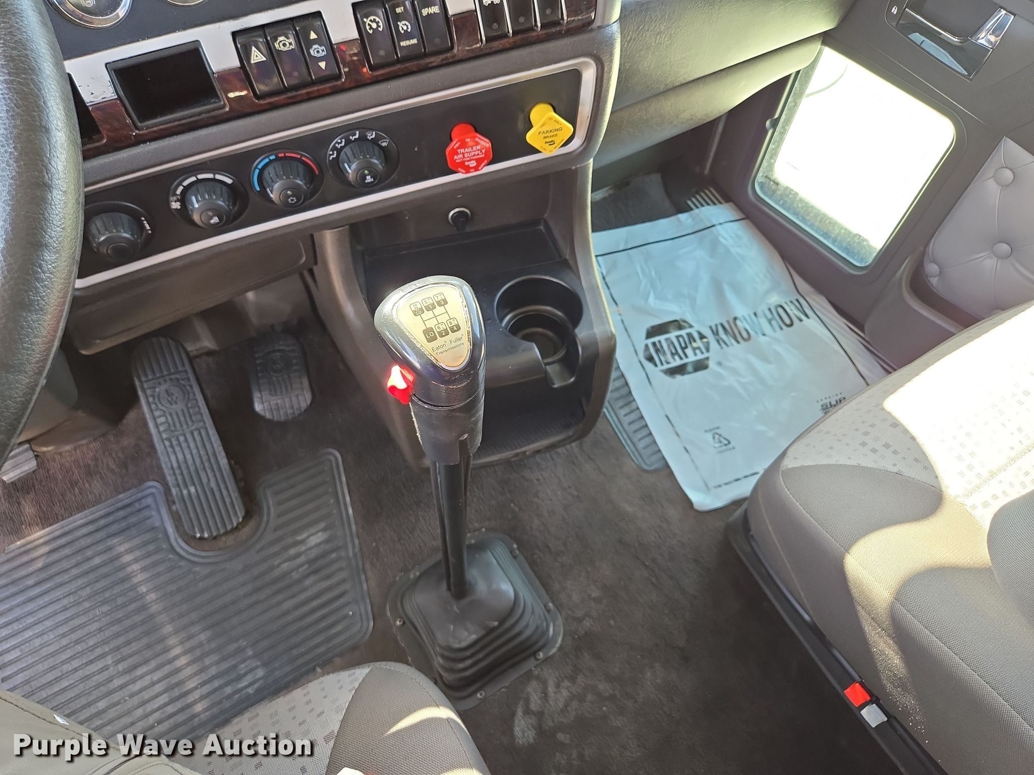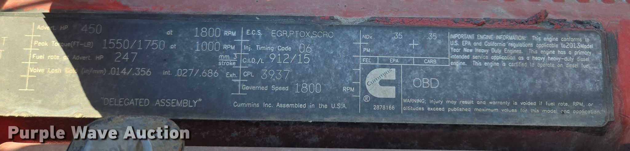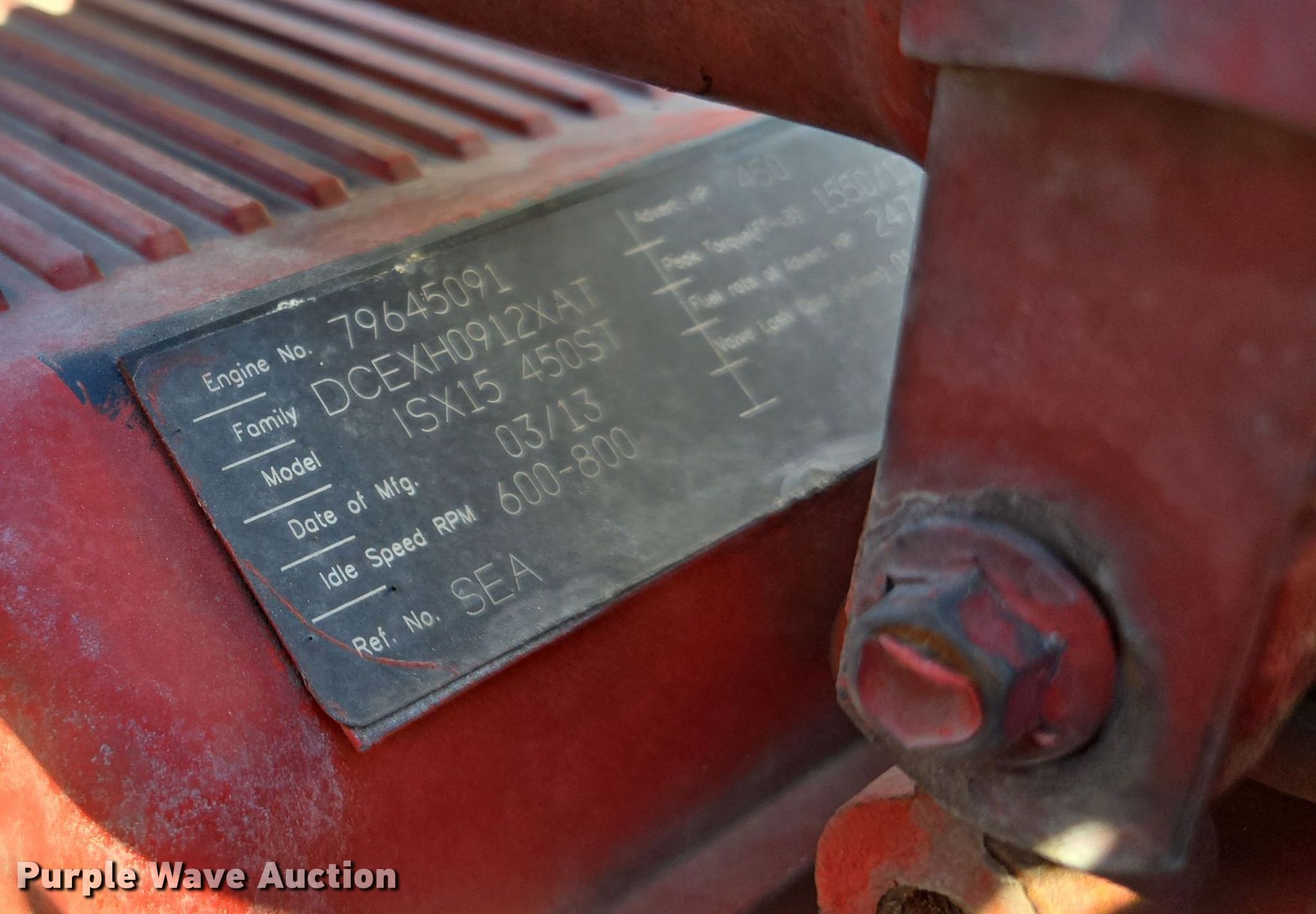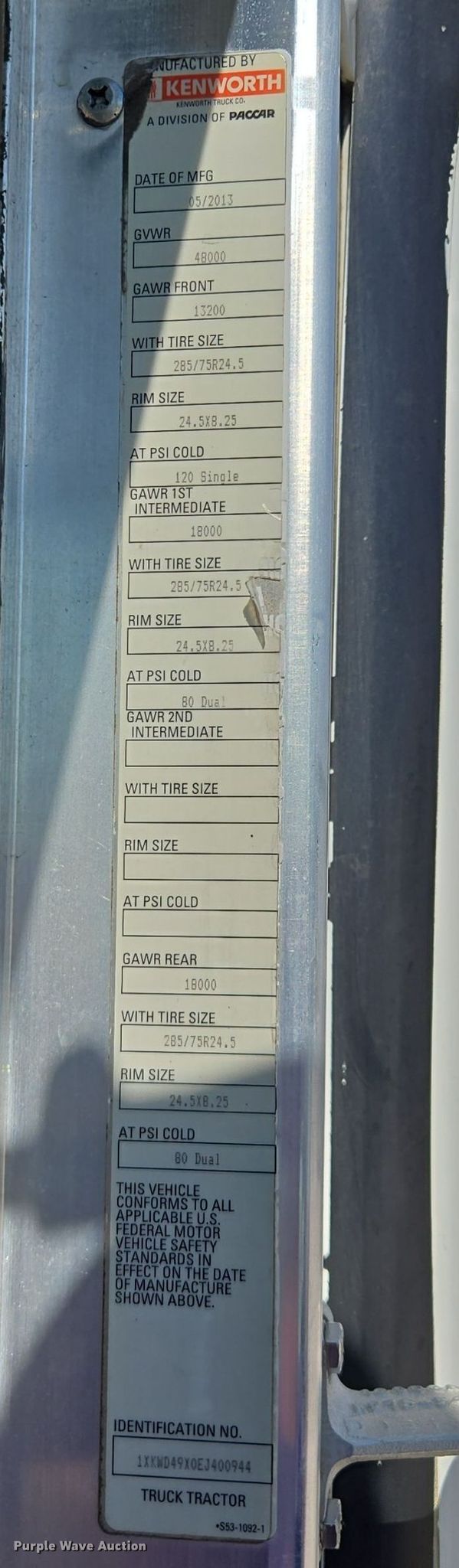 2014 Kenworth W900 semi truck. Miles: 733,937 on odometer, Hours: 22,561 on meter, VIN: 1XKWD49X0EJ400944. Engine Cummins ISX15 450ST, Displacement: 14.9L, Cylinders: 6, Fuel type: Diesel, Engine brake. Transmission Eaton Fuller, Manual, Speed: 13. Chassis Axles: Tandem, Differential lock: Inter-axle, Suspension: Air Dump valves, Brakes: Air, Truck chassis: 13' 2", GVWR: 48,000 lbs. Interior AC, Heat, Power windows, Power locks, Cruise control, Air ride cab, Sleeper Kenworth Studio Sleeper, Sleeper length: 6', Beds: Fold out sofa, Single, Refrigerator, Rear climate control, Auxiliary power unit Comfort Pro DCP3, Engine Kubota Z482-E2B-TFX1.. Features Deck plate: Aluminum, Fifth wheel type: Air operated, Sliding, Fuel tank: Dual. Tires Size: 285/75R24.5. Missouri title. Title distribution may be delayed up to 14 days from verification of funds. Carlyle Van Lines. Warrensburg, MO 64093