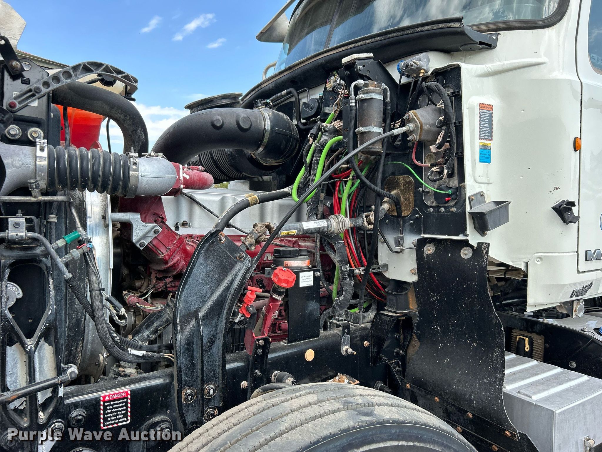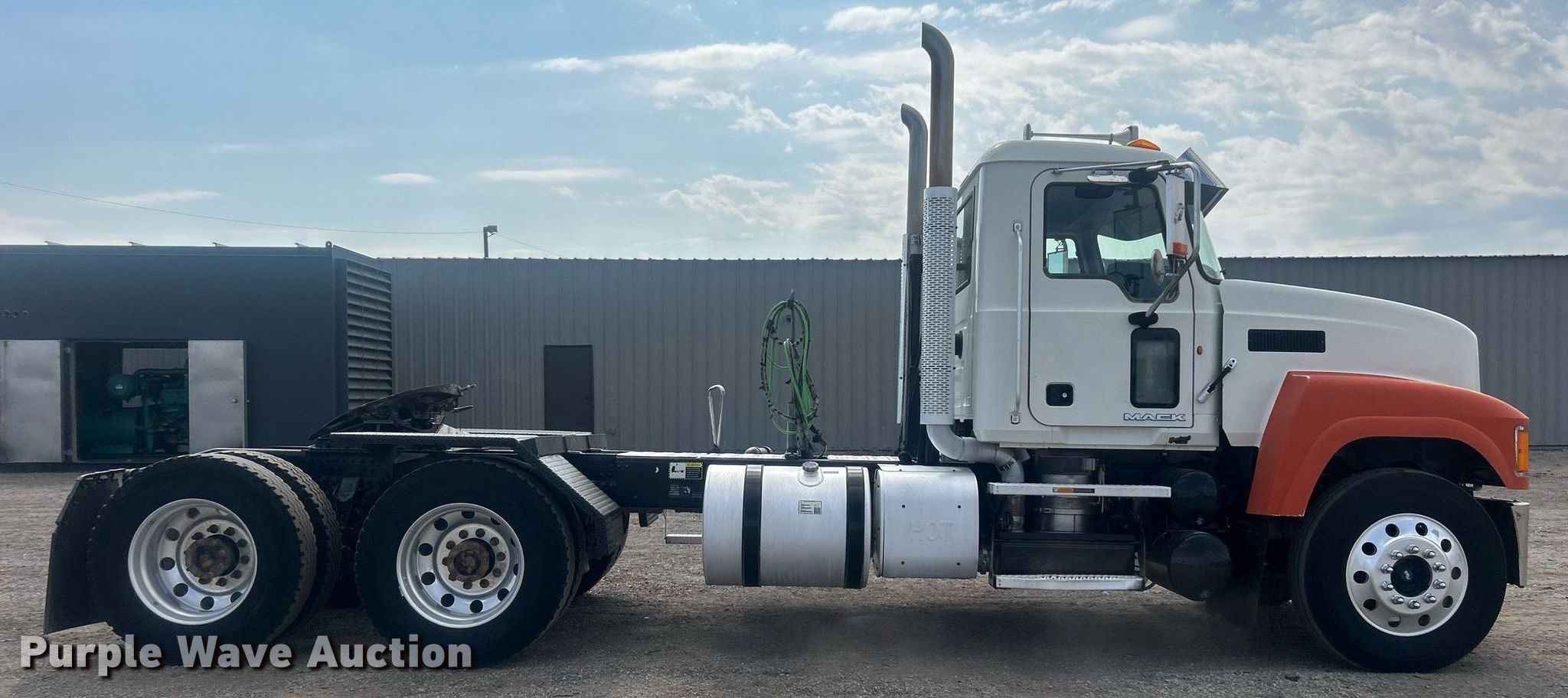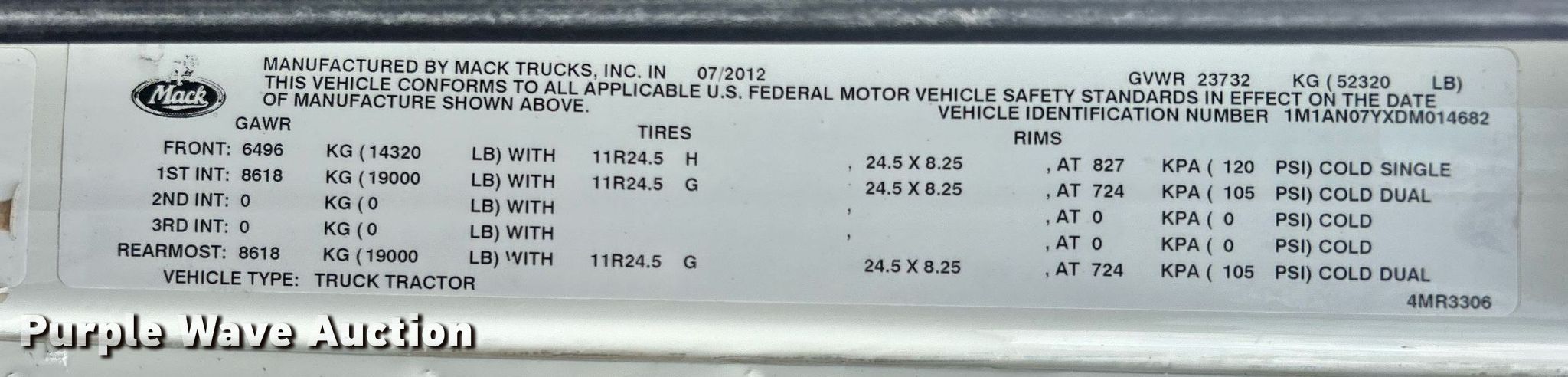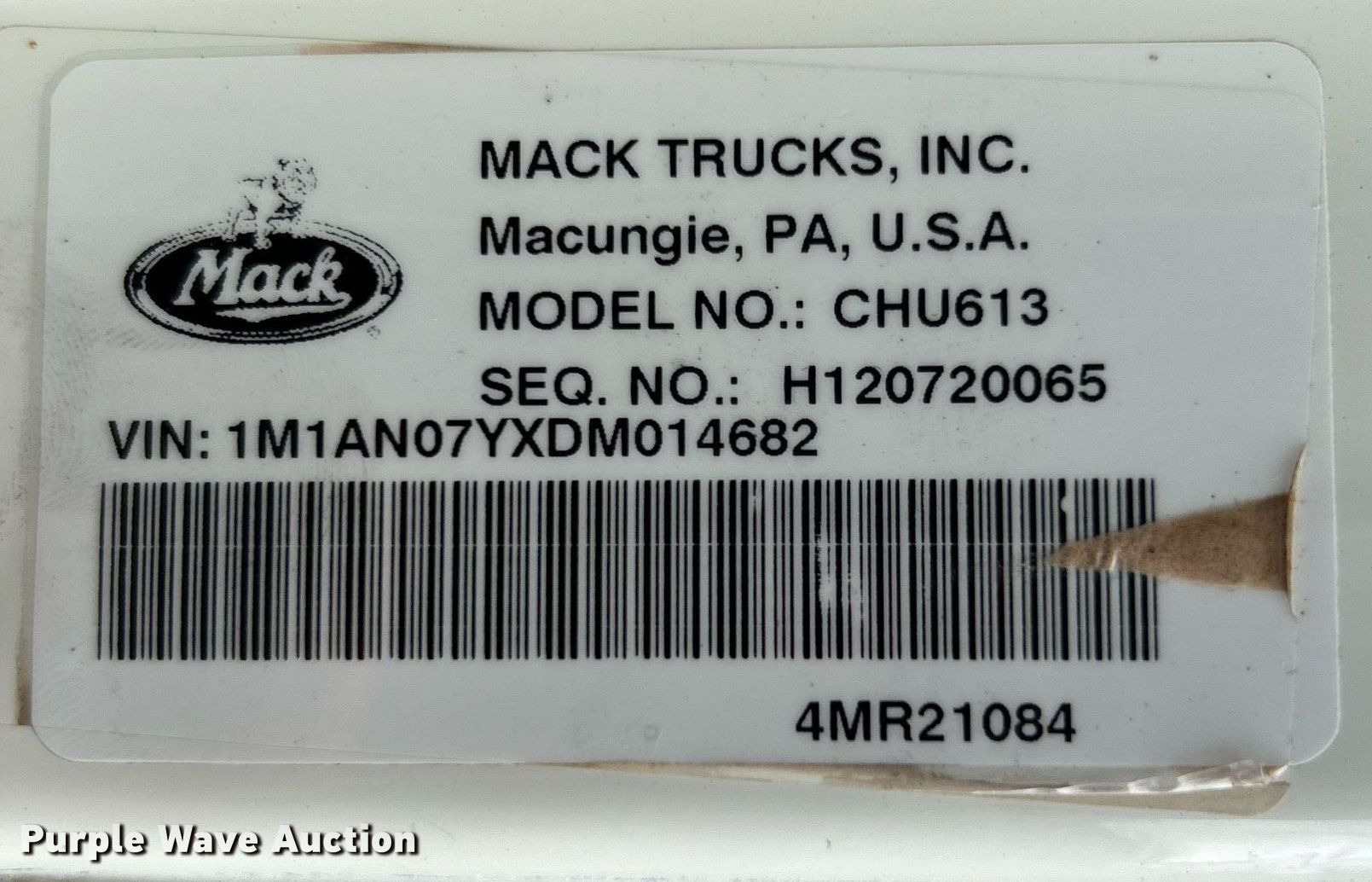 2013 Mack CHU613 semi truck. Miles: 547,123 on odometer, VIN: 1M1AN07YXDM014682. Engine Mack MP8, Displacement: 12.7L, Cylinders: 6, Fuel type: Diesel. Transmission Eaton Fuller, Manual, Speed: 13. Chassis Axles: Tandem, Differential lock: Inter-axle, Suspension: Air Dump valves, Brakes: Air, PTO, GVWR: 52,320 lbs FAWR: 14,320 lbs, IAWR: 19,000 lbs, RAWR: 19,000 lbs. Interior AC, Heat, Heated mirrors, Power windows, Power locks, Cruise control, Air ride cab. Features Deck plate: Aluminum, Fifth wheel type: Fixed, Fuel tank: Dual, Pump Fruitland. Tires Size: 11R24.5. Notes Dash warning indicator: ABS, Fault code, ATC. Oklahoma title. Title distribution may be delayed up to 14 days from verification of funds. Collinsville, OK 74021