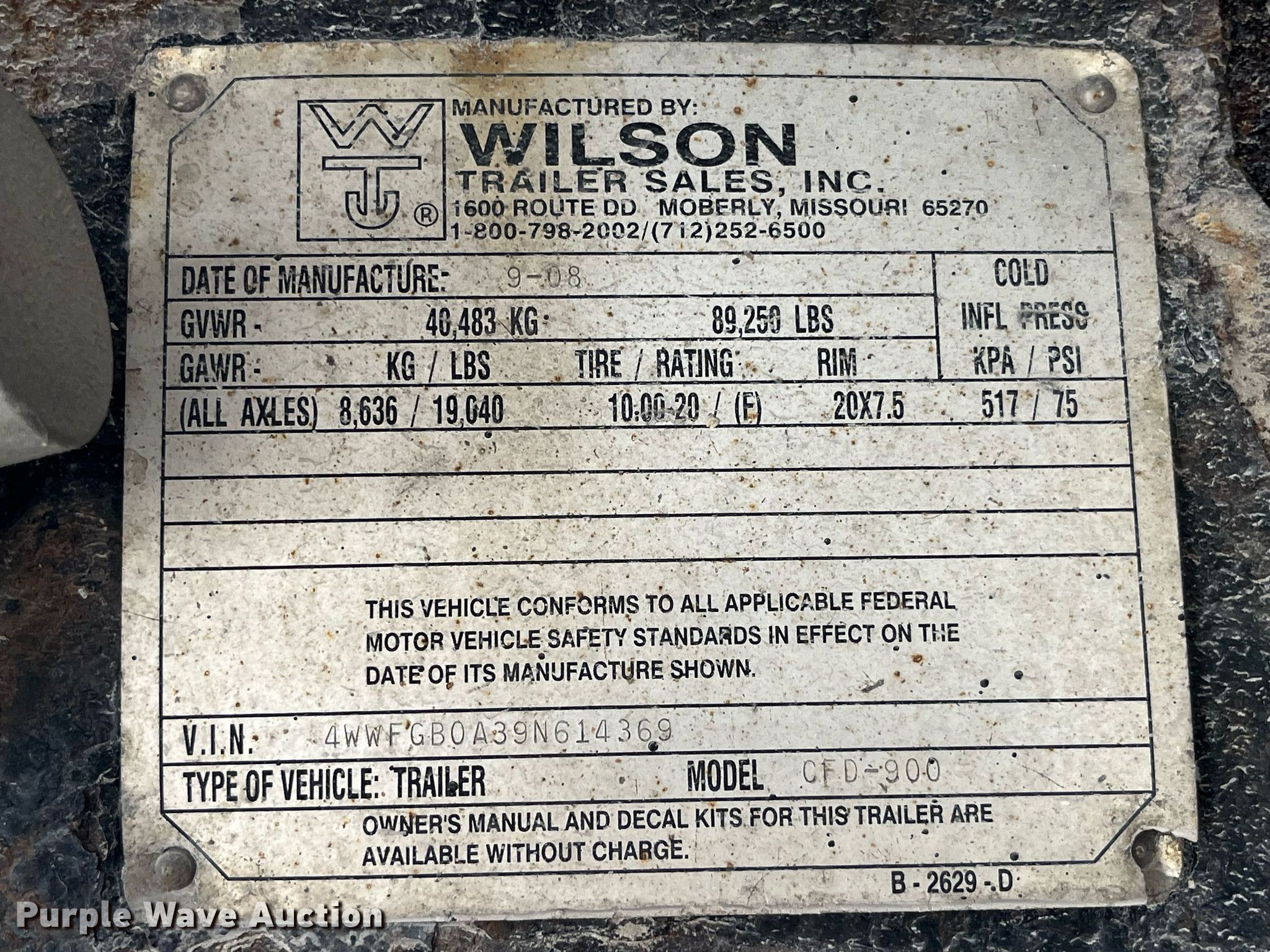 Purple Wave is selling a used Dry Van Trailer in Missouri. This item is a 2009 Wilson CFD-900 side curtain trailer with the following: VIN: 4WWFGB0A39N614369