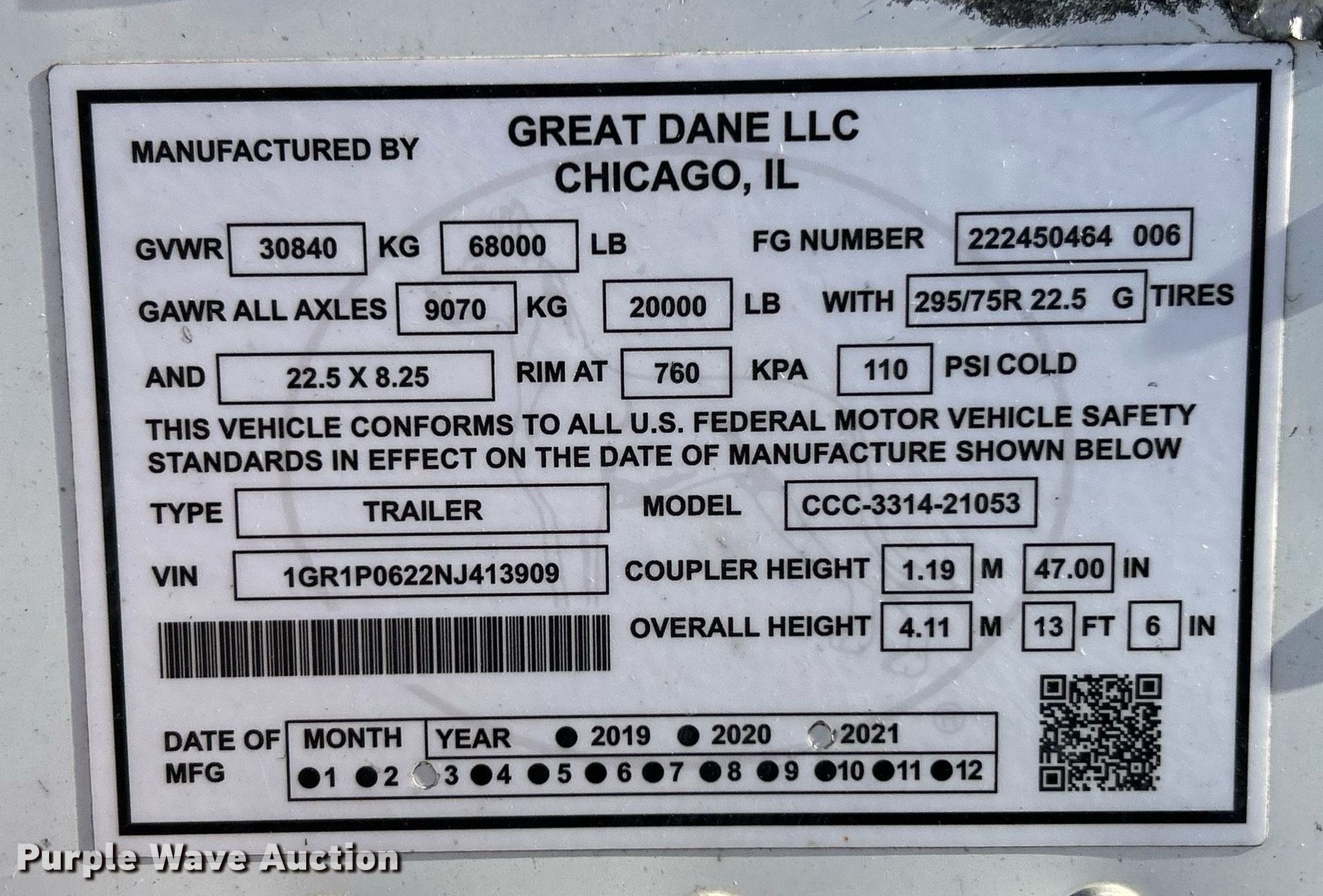 Purple Wave is selling a used Dry Van Trailer in Missouri. This item is a 2022 Great Dane CCC-3314-21053 dry van trailer with the following: VIN: 1GR1P0622NJ413909