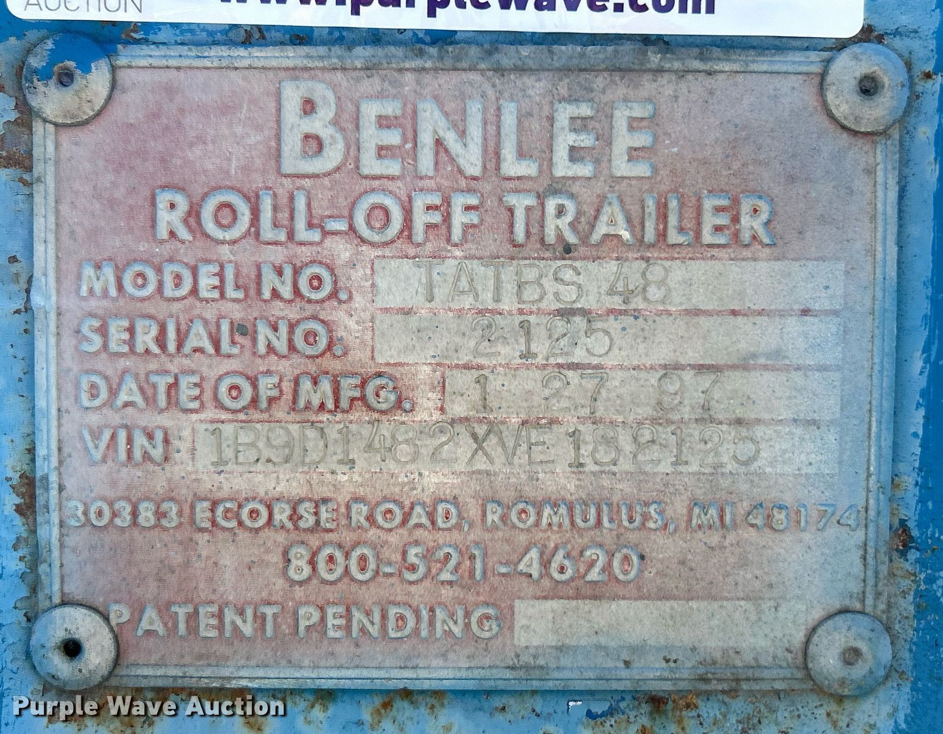 1997 Benlee TATBS48 container trailer. VIN: 1B9D1482XVE182125. Dimensions Overall: 48' L x 96" W, Deck: 48' L x 35" W. Features Winch, Hydraulic controls: Manual. Chassis Landing gear: Dual, Suspension: Air, Brakes: Air, Axles: Spread. Tires Steel wheels, Size: 285/75R24.5. Notes Hydraulic extension issues, bent. Illinois title. Title distribution may be delayed up to 14 days from verification of funds. Ahrens Contracting. St. Louis, MO 63104