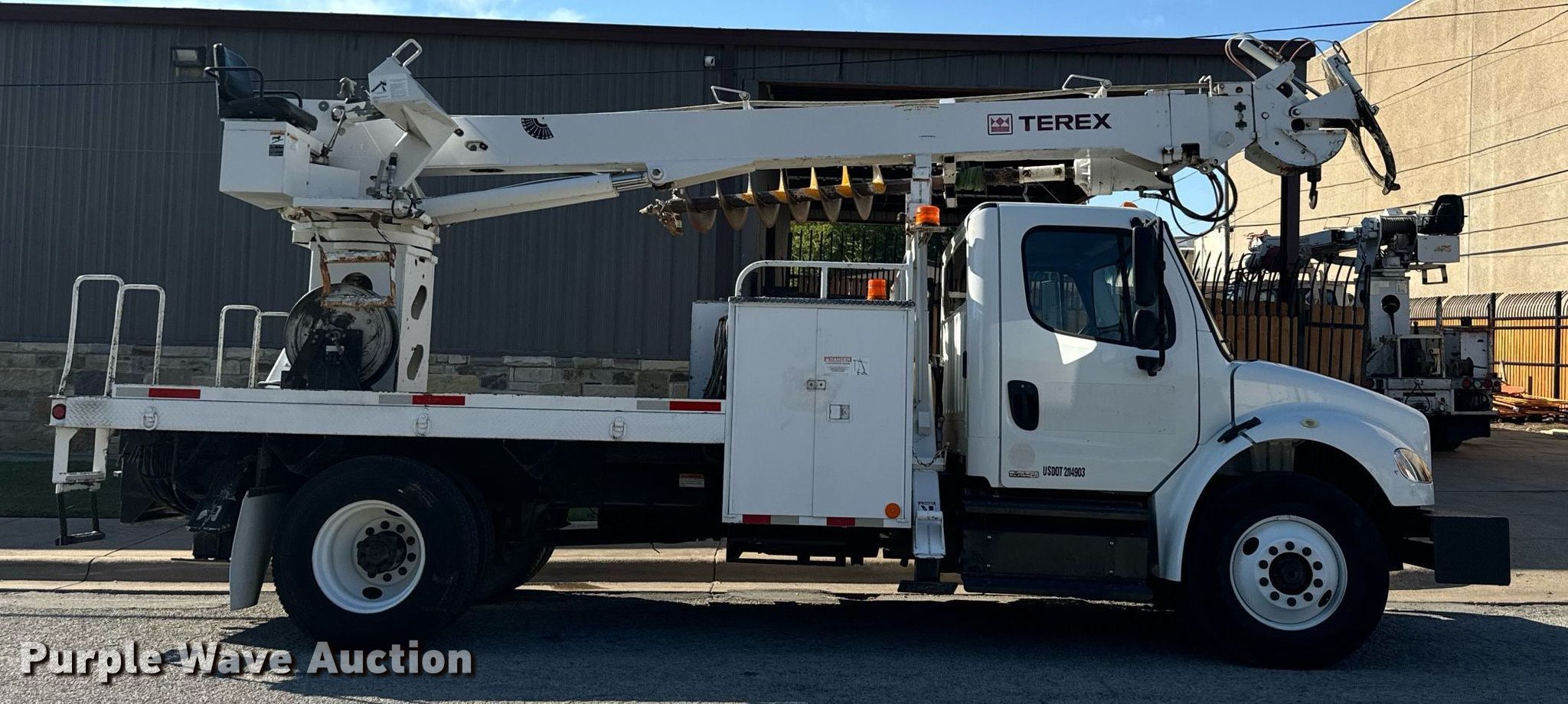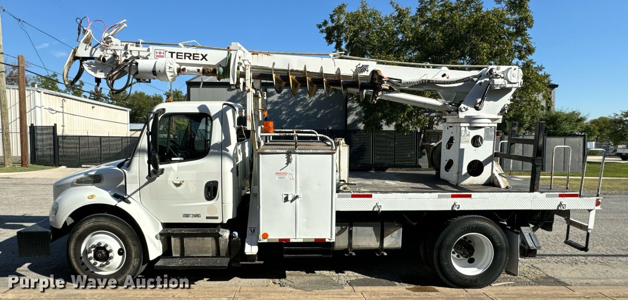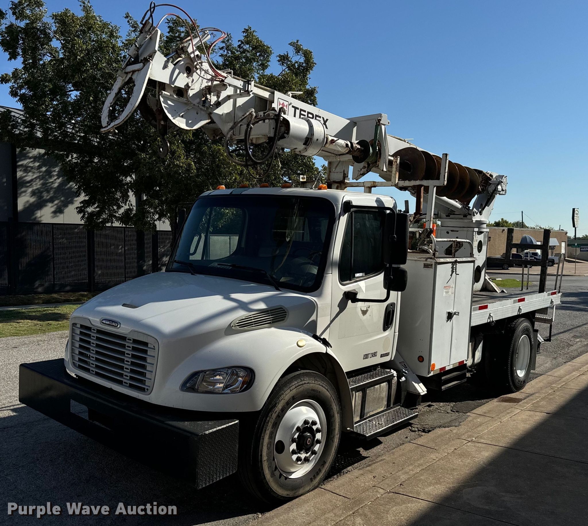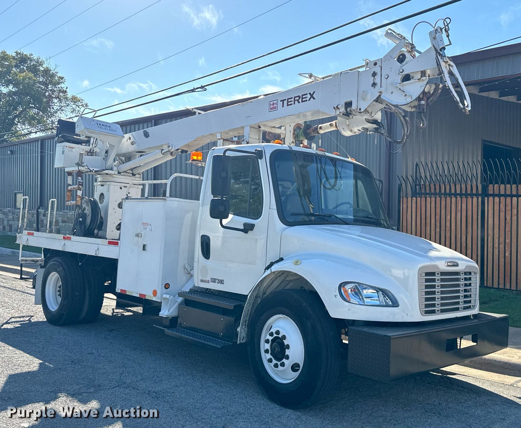 2012 Freightliner Business class M2 digger derrick truck. Miles: 190,178 on odometer, Hours: 9,128 on meter, VIN: 1FVACWDU3CDBH4916. Engine Cummins ISB, Displacement: 6.7L, Fuel type: Diesel. Transmission Automatic. Chassis Axles: Single, Suspension: Spring, Brakes: Hydraulic, PTO, GVWR: 26,000 lbs. Interior AC, Heat, Cruise control, Auxiliary controls. Features Bed 16' 3" L x 8' W, Boom Terex Commander C4047, Maximum lift capacity: 27,500 lbs, Maximum lift height: 47', Boom type: Telescopic, Boom controls Platform/ basket, Material handler, Auger Diameter: 18".. Tires Size: 11R22.5. Notes Dash warning indicator: Check engine. Texas title. Title distribution may be delayed up to 14 days from verification of funds. Trademark Electric Inc. Fort Worth, TX 76116