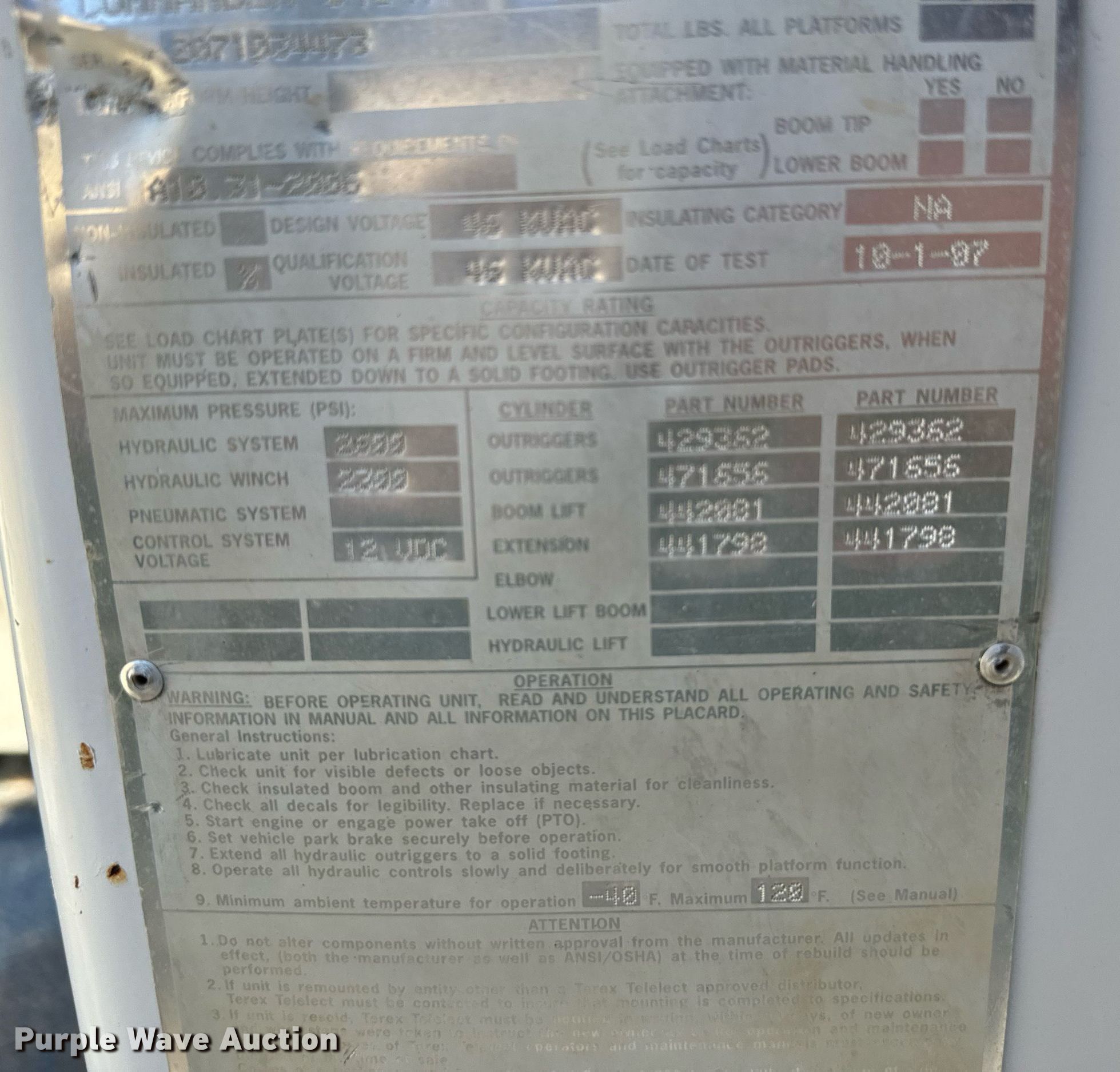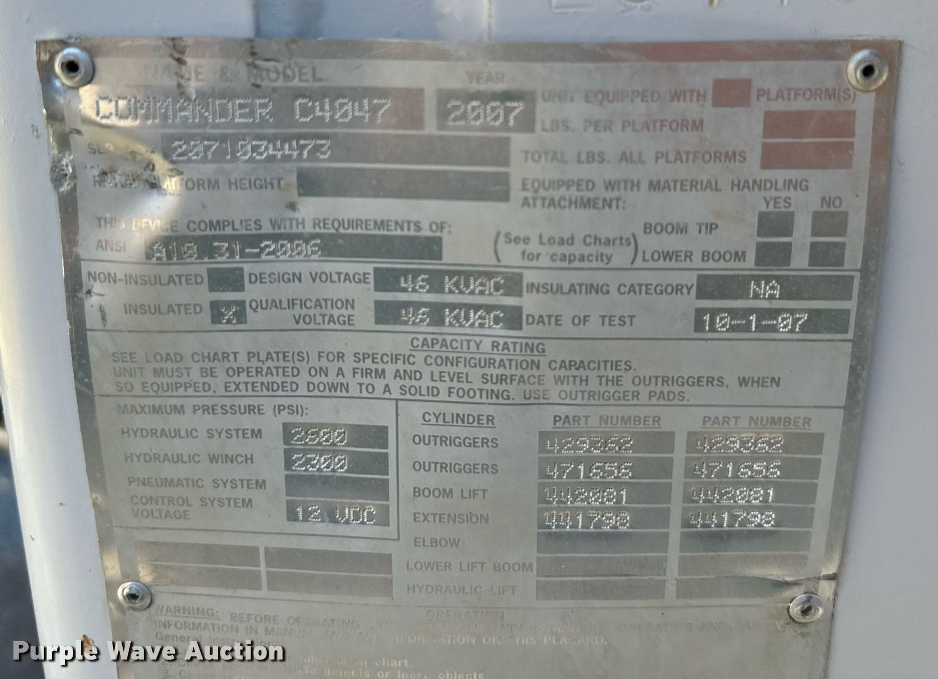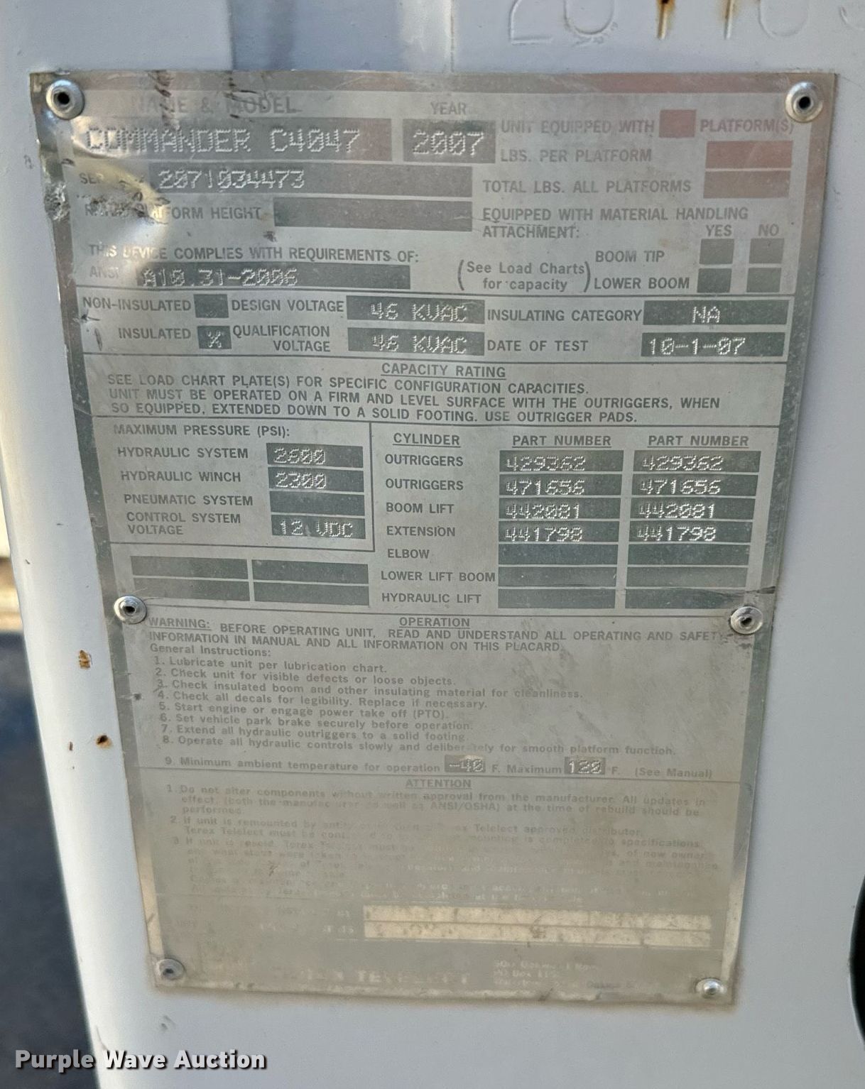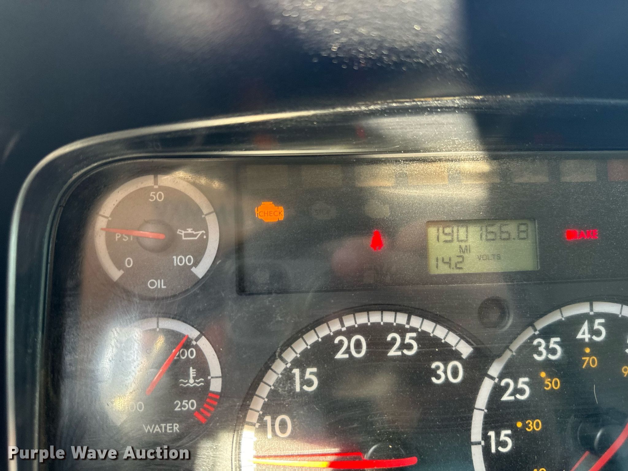 2012 Freightliner Business class M2 digger derrick truck. Miles: 190,178 on odometer, Hours: 9,128 on meter, VIN: 1FVACWDU3CDBH4916. Engine Cummins ISB, Displacement: 6.7L, Fuel type: Diesel. Transmission Automatic. Chassis Axles: Single, Suspension: Spring, Brakes: Hydraulic, PTO, GVWR: 26,000 lbs. Interior AC, Heat, Cruise control, Auxiliary controls. Features Bed 16' 3" L x 8' W, Boom Terex Commander C4047, Maximum lift capacity: 27,500 lbs, Maximum lift height: 47', Boom type: Telescopic, Boom controls Platform/ basket, Material handler, Auger Diameter: 18".. Tires Size: 11R22.5. Notes Dash warning indicator: Check engine. Texas title. Title distribution may be delayed up to 14 days from verification of funds. Trademark Electric Inc. Fort Worth, TX 76116