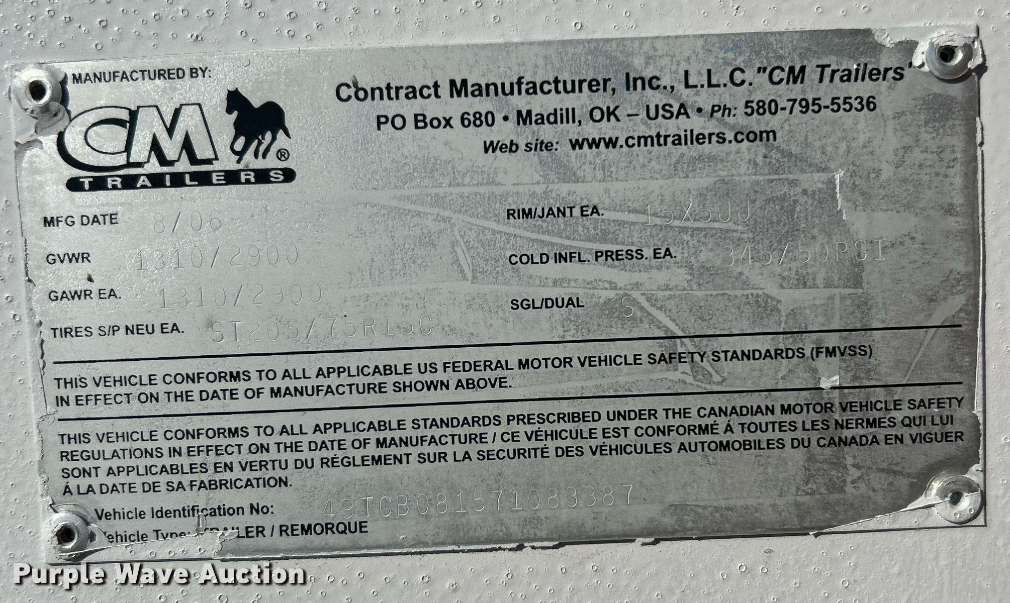 Purple Wave is selling a used Enclosed Cargo Trailer in Oklahoma. This item is a 2007 CM Trailers enclosed cargo trailer with the following: VIN: 49TCB081571083387