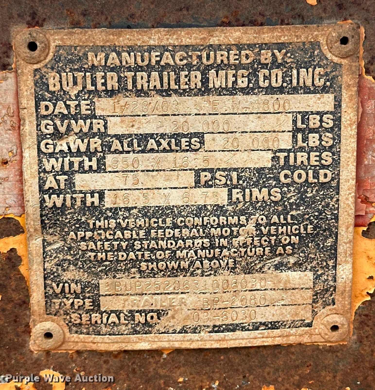 Purple Wave is selling a used Trailer Other in Oklahoma. This item is a 2003 Butler pole trailer with the following: VIN: 1BUP2520631006030