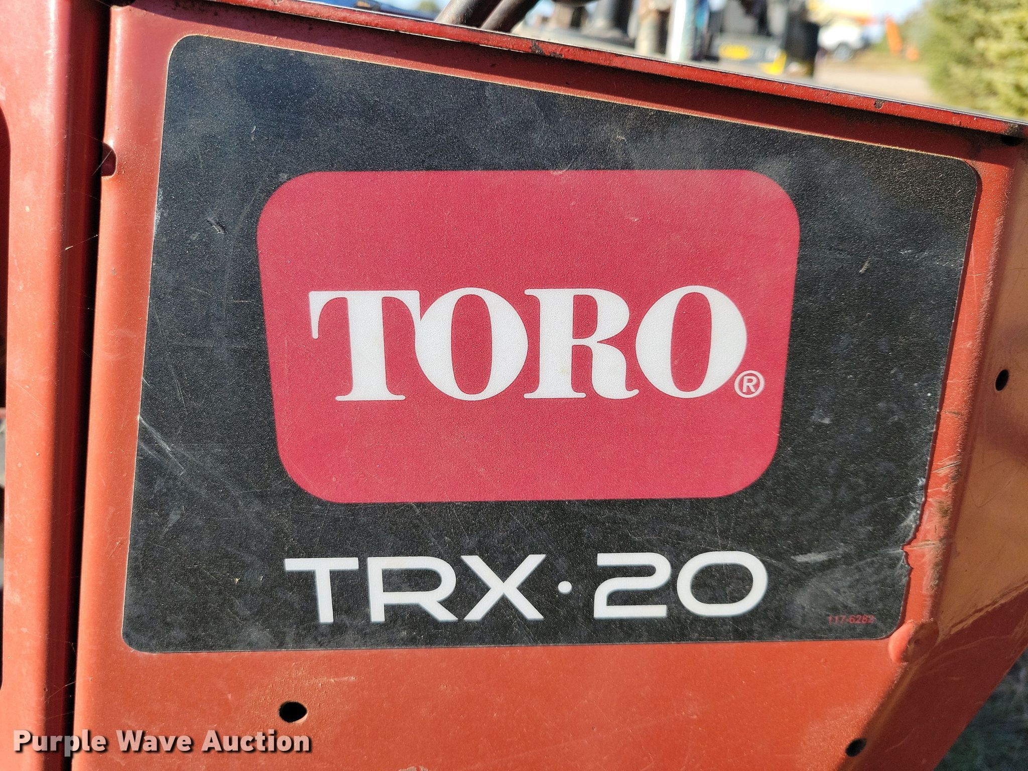 2015 Toro TRX-20 trencher. Hours: 745 on meter, Serial: 315000165. Engine Cylinders: 2, Fuel type: Gas. Transmission Hydrostatic. Features Trencher Estimated dig depth: 49", Cutting width: 6", Teeth: Dirt. Tracks Width: 6", Rubber. Mitchell, SD 57301