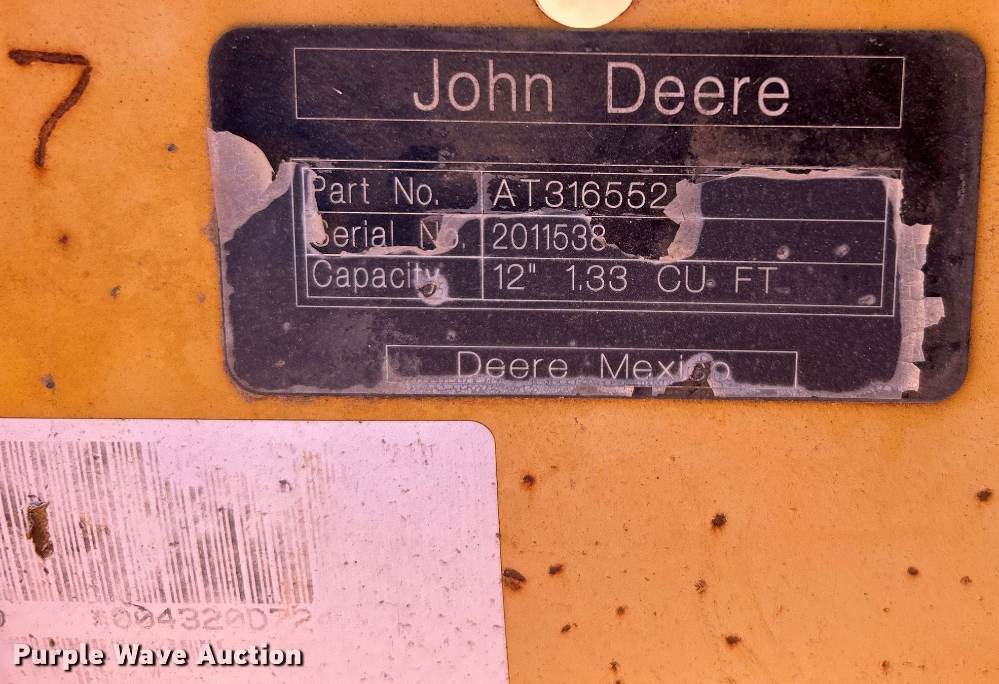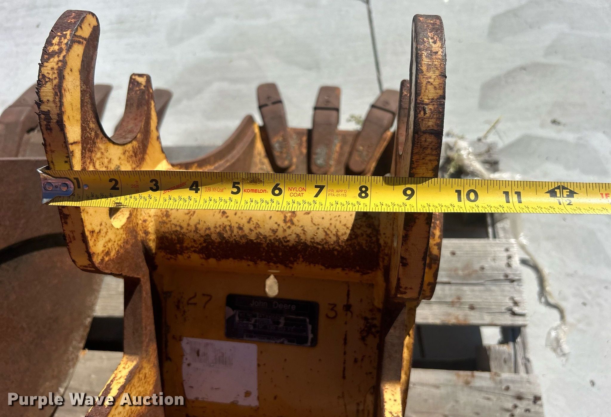 (4) buckets. John Deere AT439374. Width: 12", Teeth: 3, Capacity: 2.1 cu.ft.. Caterpillar Width: 11", Teeth: 3. John Deere AT3166552 Width: 11", Teeth: 3, Capacity: 1.33 cu.ft.. Kubota Width: 12", Teeth: 3. Tri Star Construction, LLC.. Tulsa, OK 74116