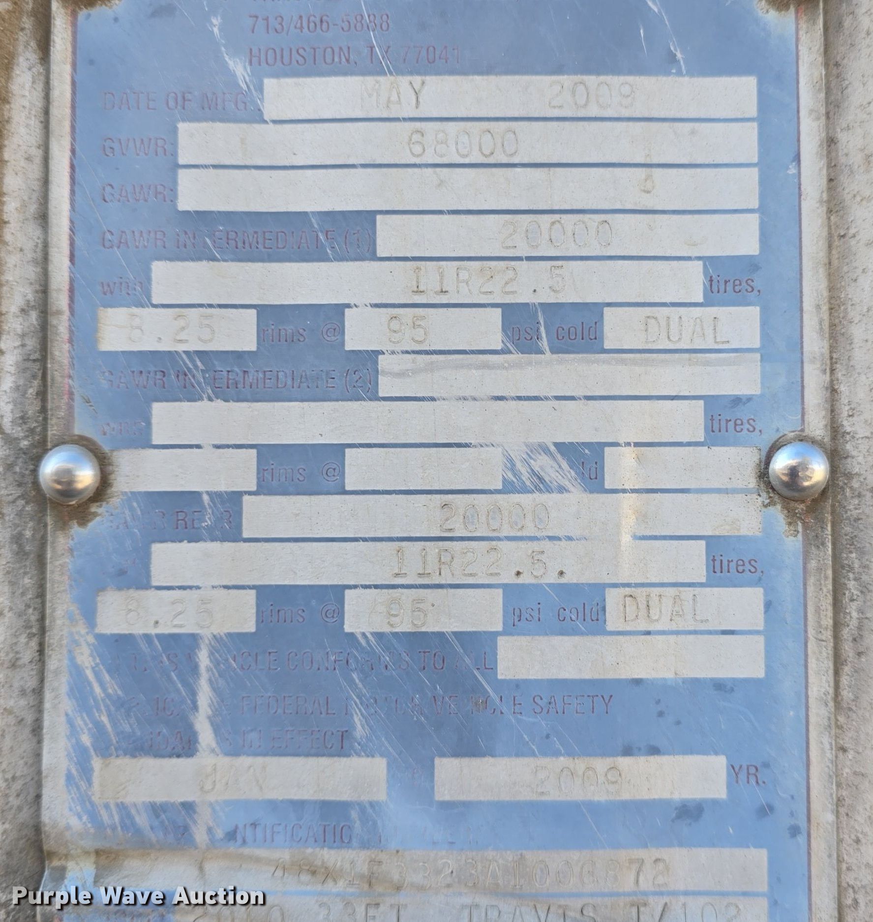 2010 Travis T102 grain trailer. VIN: 48X1F3323A1006872, Unit #: 48. Dimensions Overall: 33' L x 8' 6" W, Body: 33' L x 8' 6" W, Side height: 5'. Features Body type: Aluminum, End gate: Air operated Grain door, Poly liner, Roll tarp. Chassis Landing gear: Dual, Suspension: Air, Brakes: Air, Axles: Spread, GVWR: 68,000 lbs, GAWR: 20,000 lbs. Tires Aluminum wheels, Size: 285 75r24.5. Notes Passenger side tire issues, tires need replaced. All items must be removed by November 29, 2024. Items not removed by November 29, 2024 will be considered forfeited. Kansas title. Title distribution may be delayed up to 14 days from verification of funds. Osage City, KS 66523