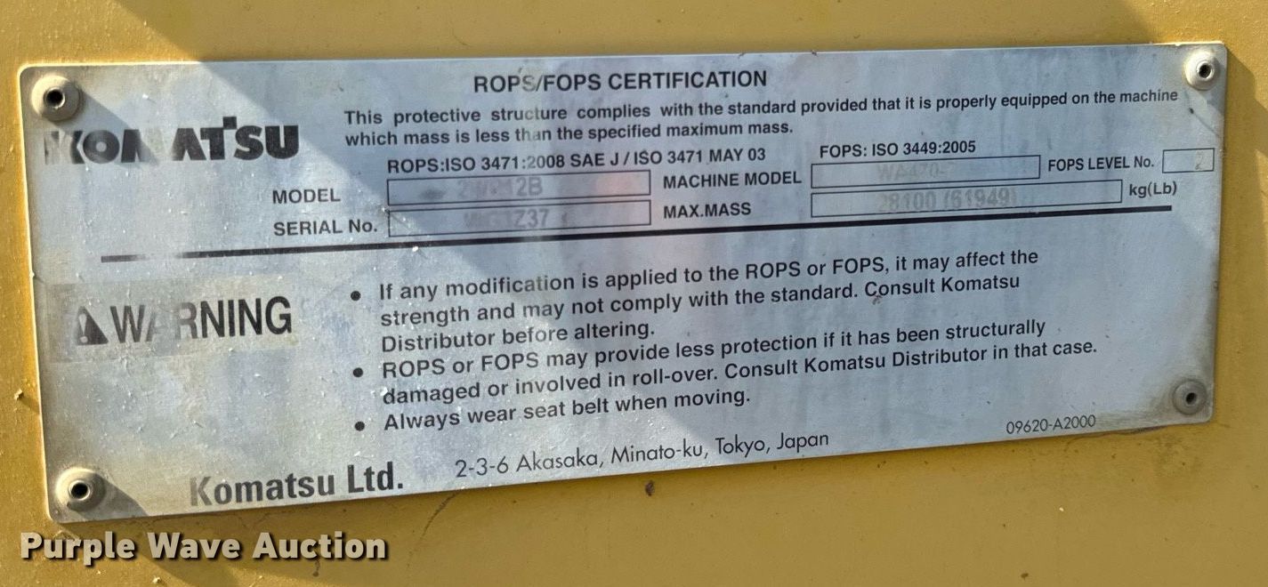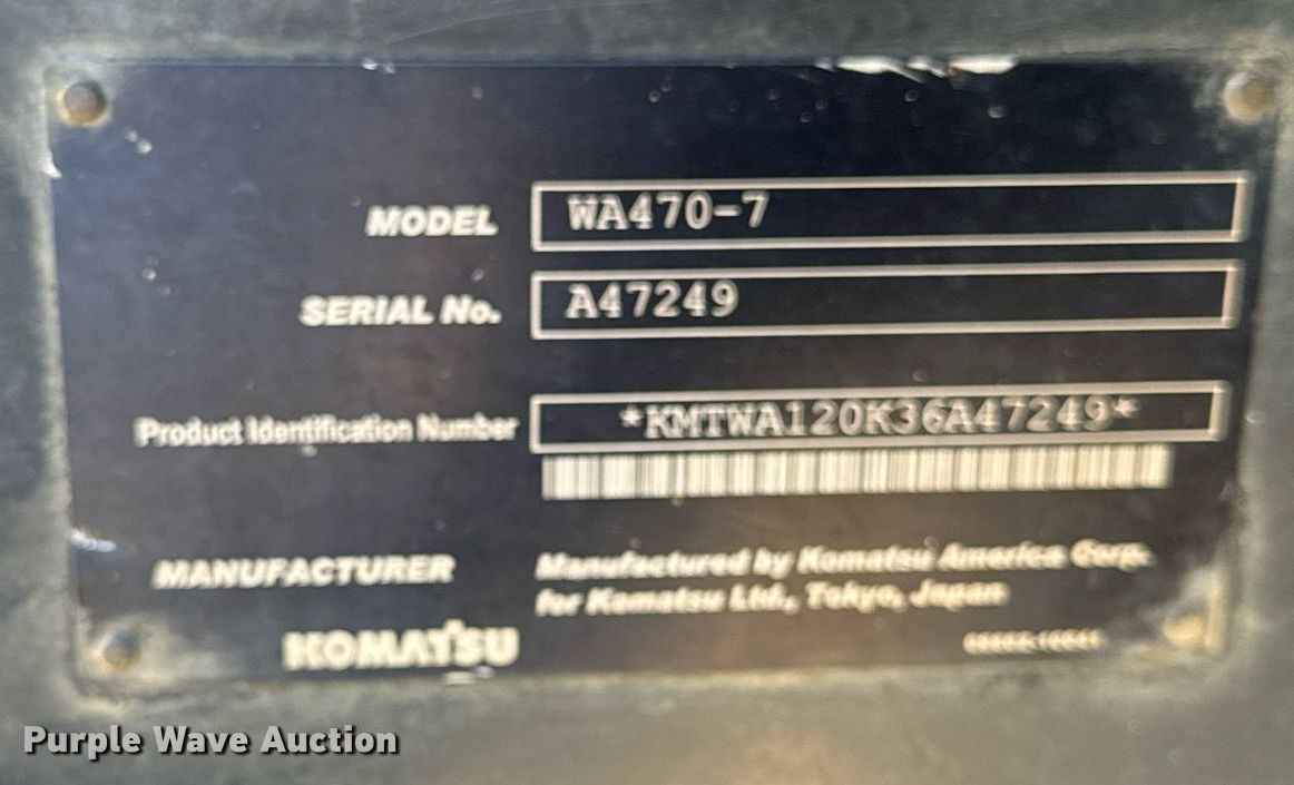 Purple Wave is selling a used Wheel Loader in Illinois. This item is a 2014 Komatsu WA470-7 wheel loader with the following: Miles : 40,807 on odometer, Hours: 9,199 on meter, Unit #: K143