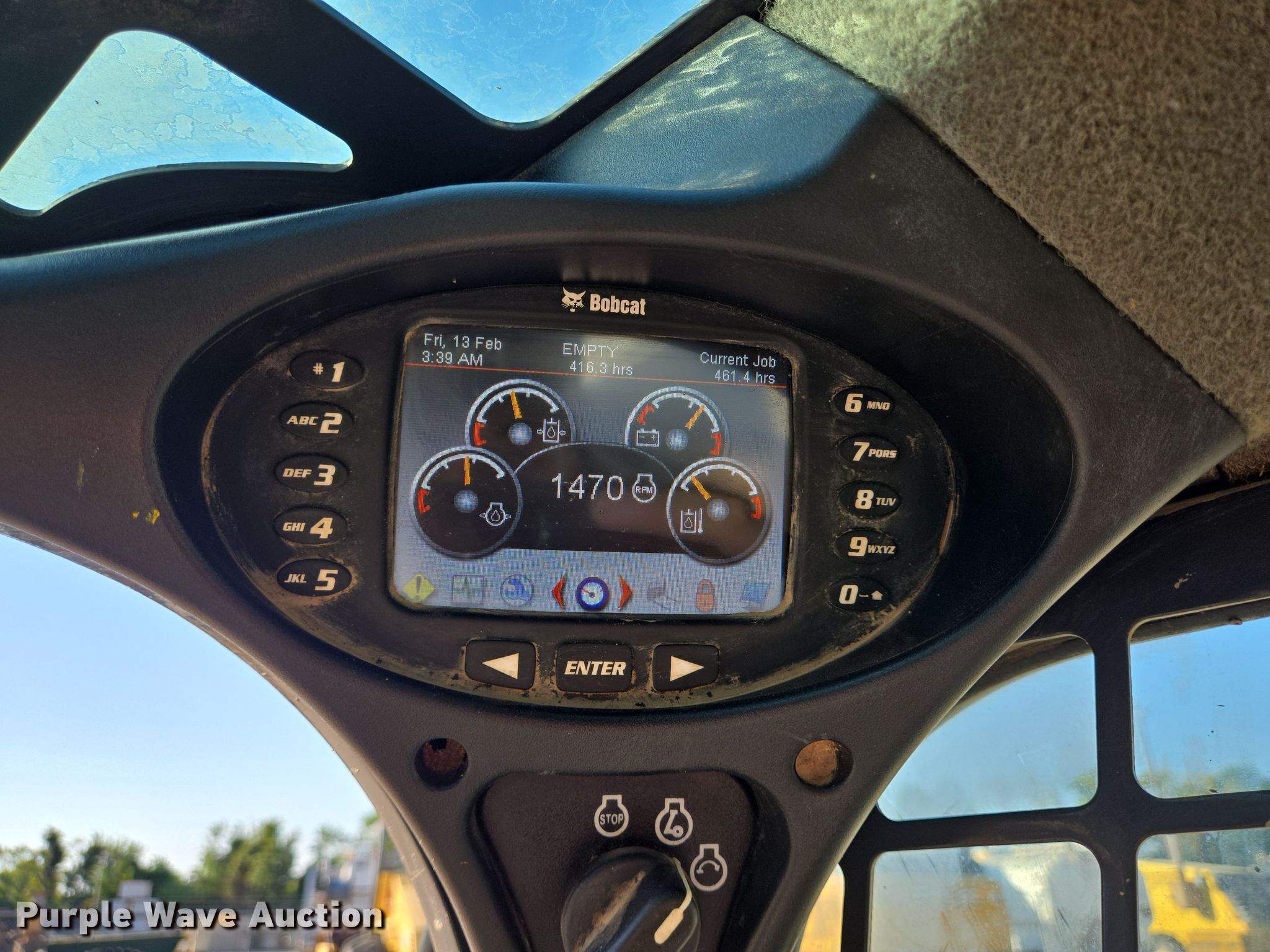 2017 Bobcat T630 skid steer loader. Hours: 4,462 on meter, Serial: AJDT15637. Engine Bobcat, Displacement: 2.4 L, Cylinders: 4, Fuel type: Diesel. Transmission Hydrostatic. Operators station AC, Heat, Bucket control: Hand, Pattern changer, Electronic Monitoring System panel. Features Auxiliary hydraulics, Auxiliary electrical outlet, Quick coupler: Manual, Bucket Width: 67", Cutting edge: Bolt-on. Tracks Width: 16". Notes Unknown operating condition of AC. Summit Equipment Company Inc. Houston, TX 77066