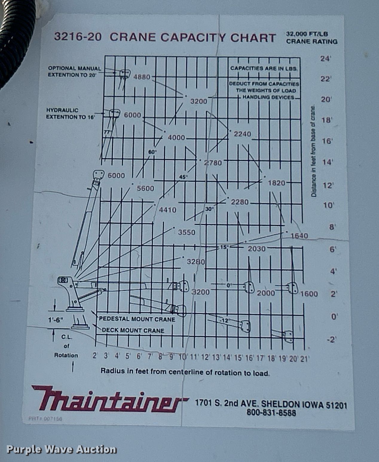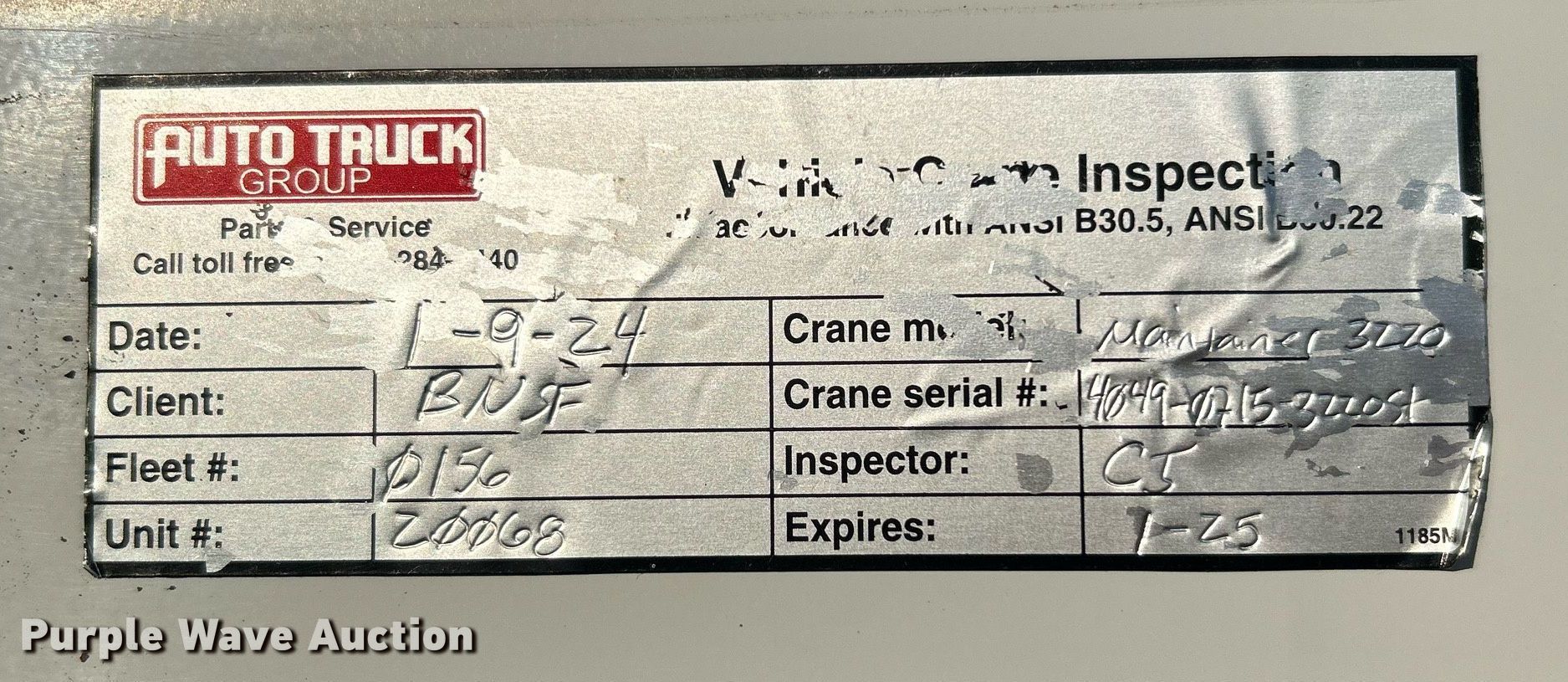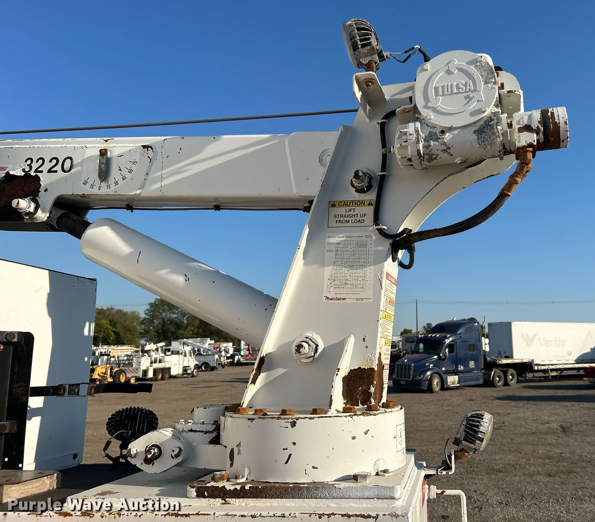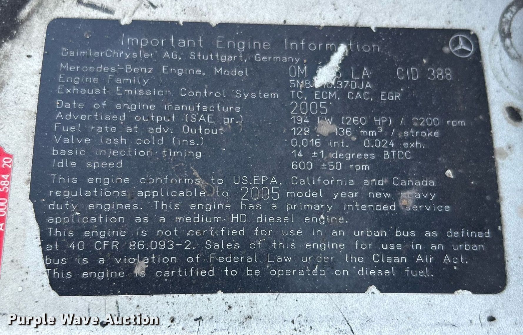 2006 Sterling Acterra utility / service truck. Miles: 267,261 on odometer, VIN: 2FZACGCS96AV88465. Engine Mercedes Benz, Displacement: 388 C.I.D., Cylinders: 6, Fuel type: Diesel, HP: 260, kW: 194. Transmission Manual, Speed: 6. Chassis Axles: Single, Suspension: Spring, Brakes: Air, PTO, GVWR: 29,000 lbs. Interior AC, Heat, Heated mirrors, Cruise control. Features Bed 11' 8" L x 96" W, Air compressor Quincy, Oil/lube system Hose reels, Crane Maintainer 3220, Maximum boom length: 20' Maximum lift capacity: 6,000 lbs.. Tires Size: 275/80R22.5. Notes Rust damage. Oklahoma title. 15107 North 137th East Avenue. Collinsville, OK 74021