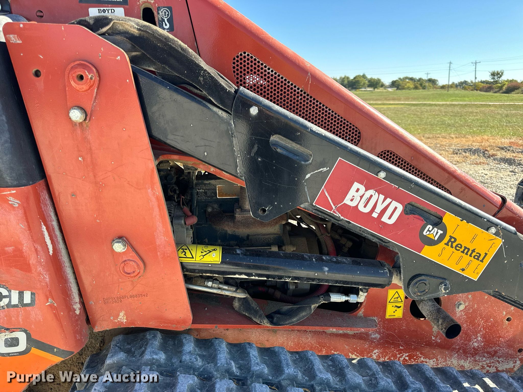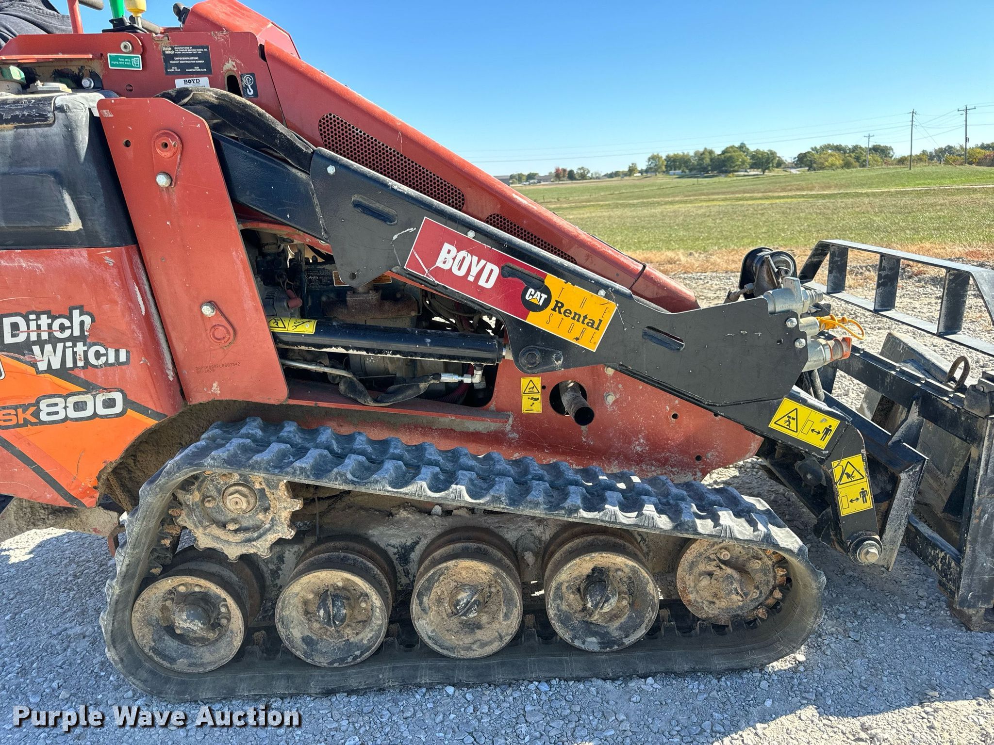 2020 Ditch Witch SK800 compact utility loader. Hours: 1,276 on meter, Serial: DWPSK800PL0003542. Engine Kubota D1105-EF02, Displacement: 1.1L, Cylinders: 3, Fuel type: Diesel, kW: 18.2. Transmission Hydrostatic. Operators station Bucket control: Hand. Features Auxiliary hydraulics, Quick coupler: Manual, Bucket Width: 44", Forks Length: 36". Tracks Width: 9". Hardy Holding Group. Boonville, MO 65233