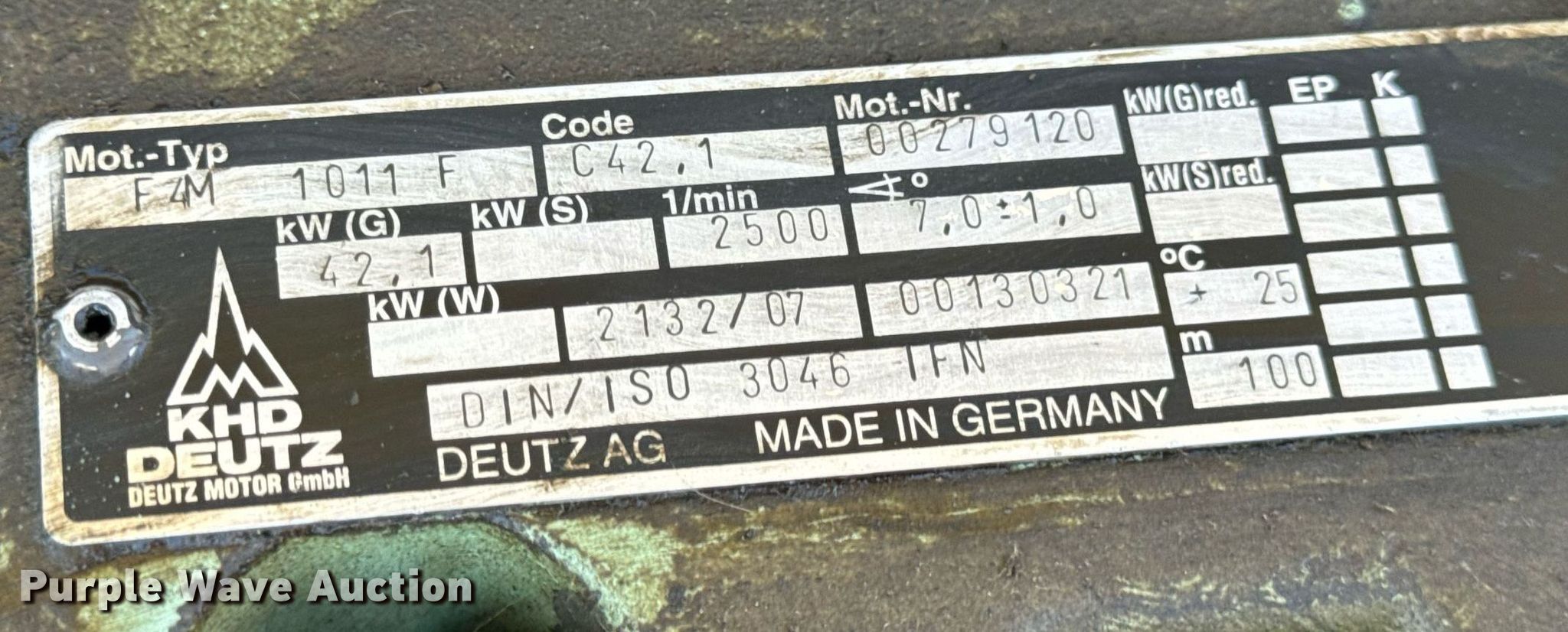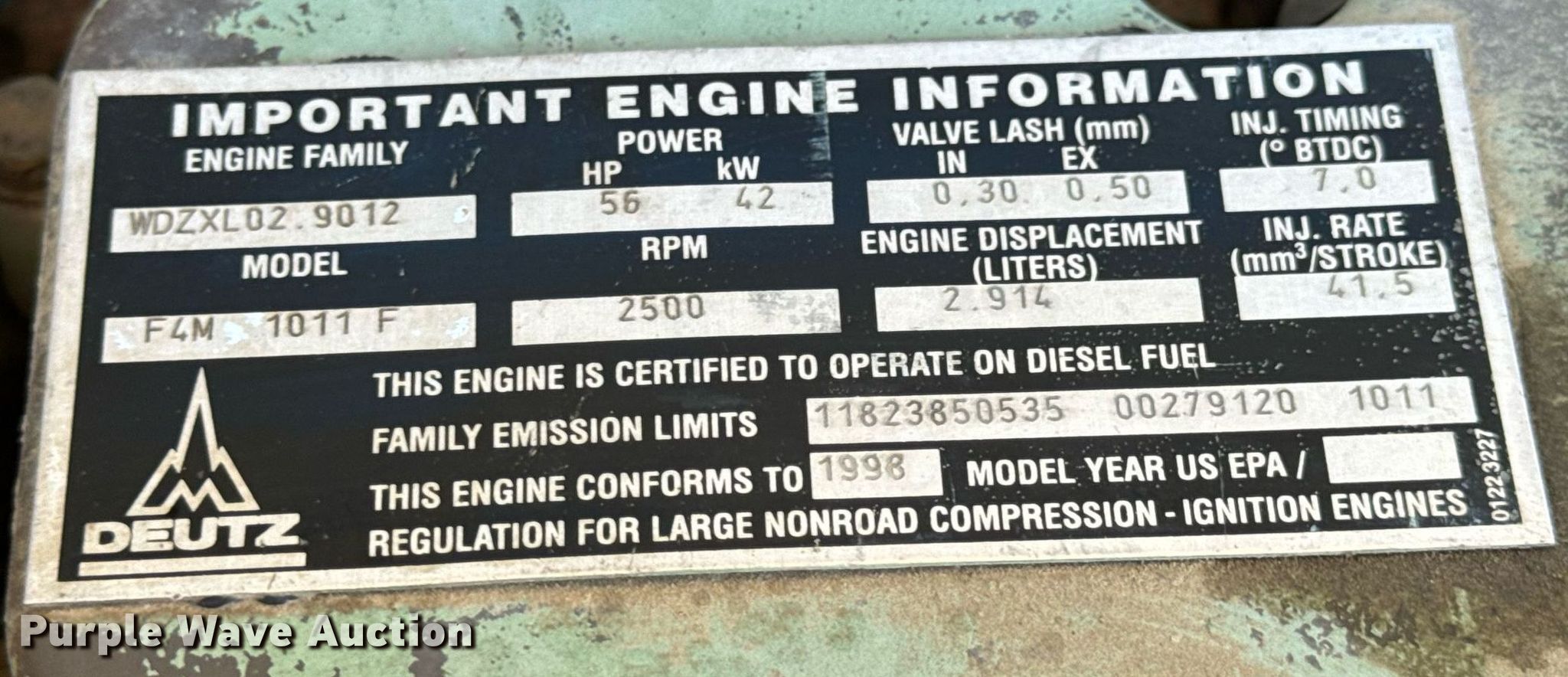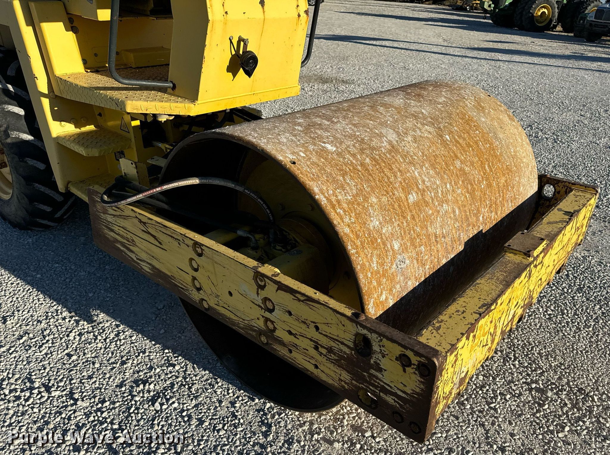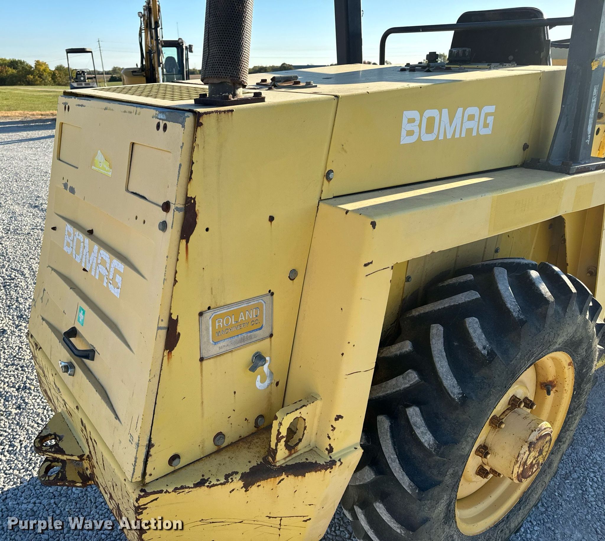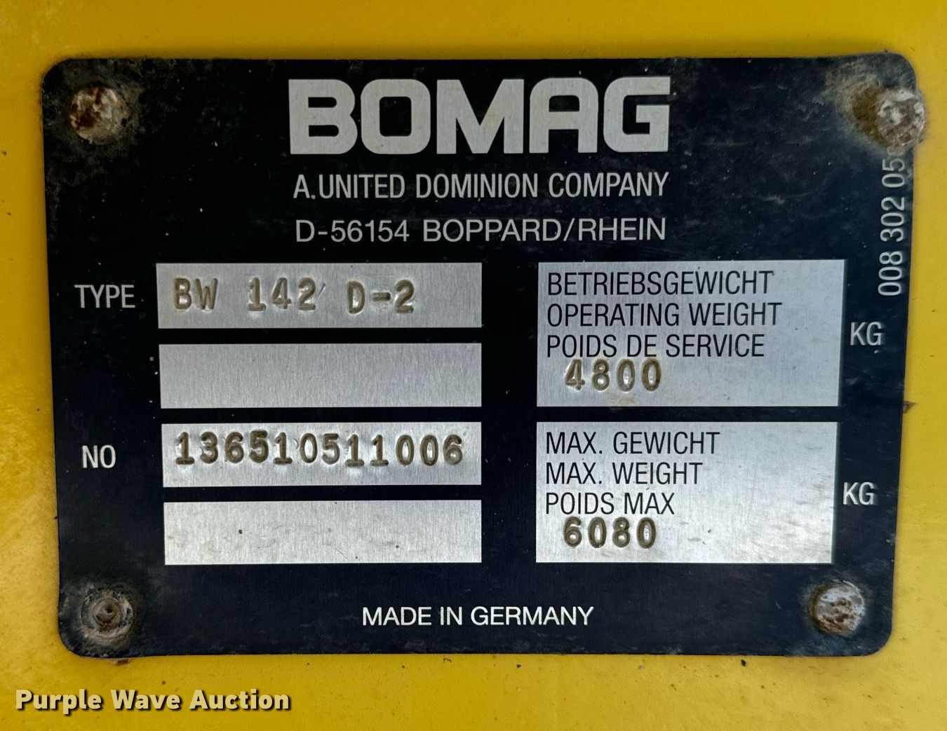 Bomag BW142D-2 single drum vibratory roller. Hours: 112 on meter, Serial: 136510511006. Engine Deutz F4M1011F, Displacement: 2.914L, Cylinders: 4, Fuel type: Diesel, HP: 56, kW: 42. Transmission Hydrostatic. Operators station OROPS, Vandal cover. Features Drum: Smooth, Combination/ Shell Kit, Vibratory system: Single, Front drum Width: 56", Diameter: 41.5", Drum scrapers: Front. Tires Size: 12.4-24. Hardy Holding Group. Boonville, MO 65233