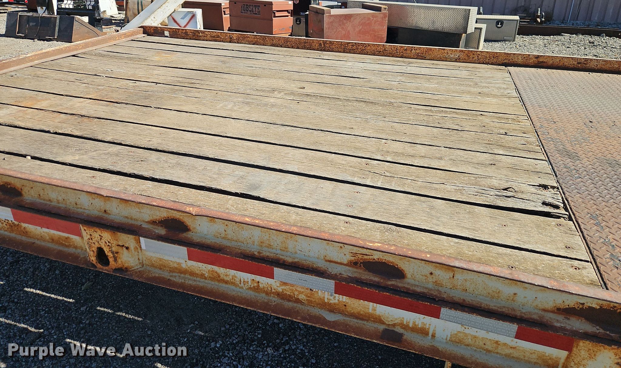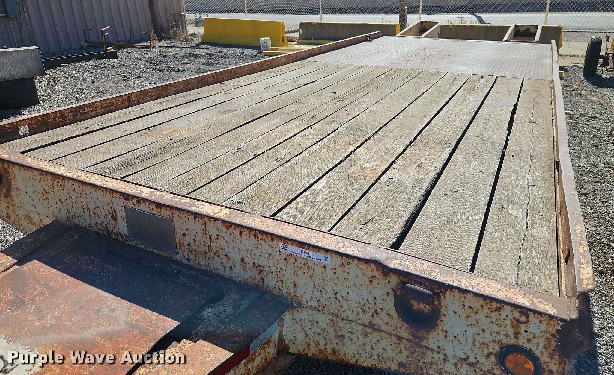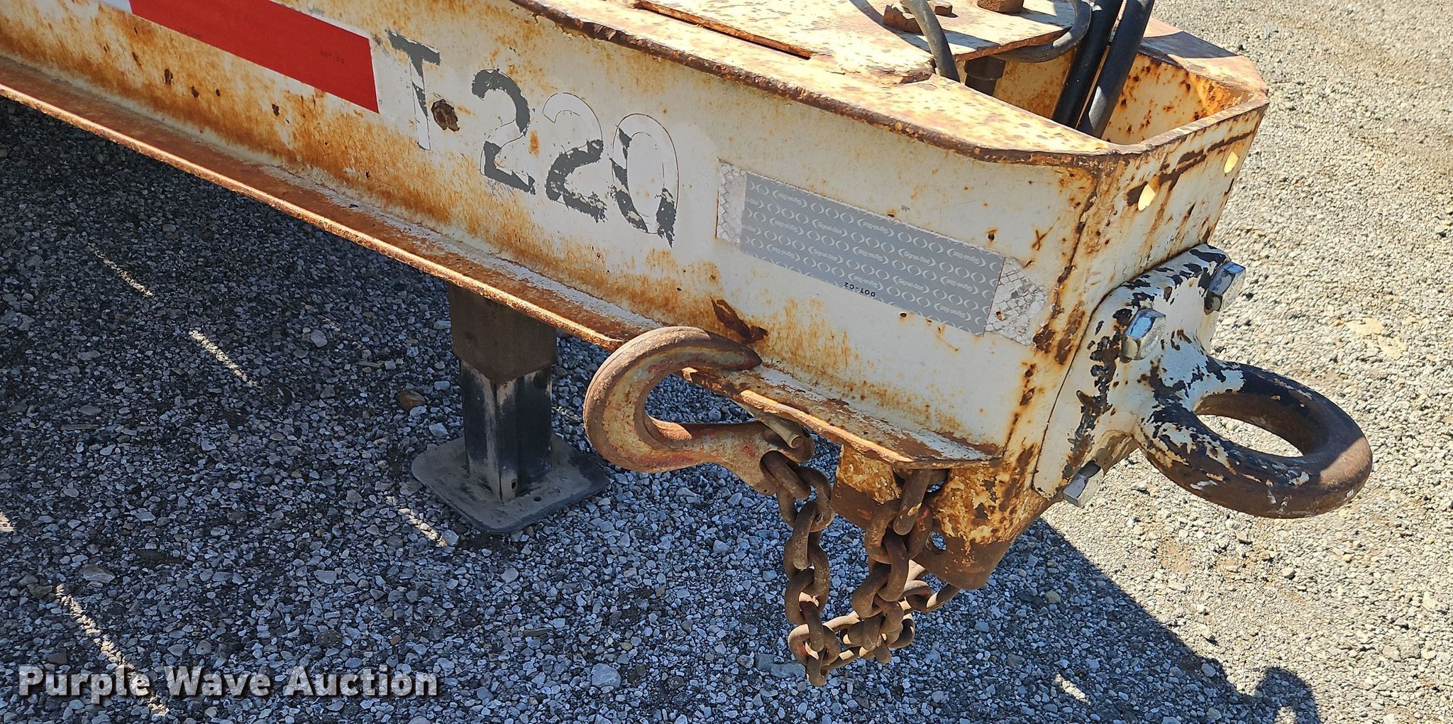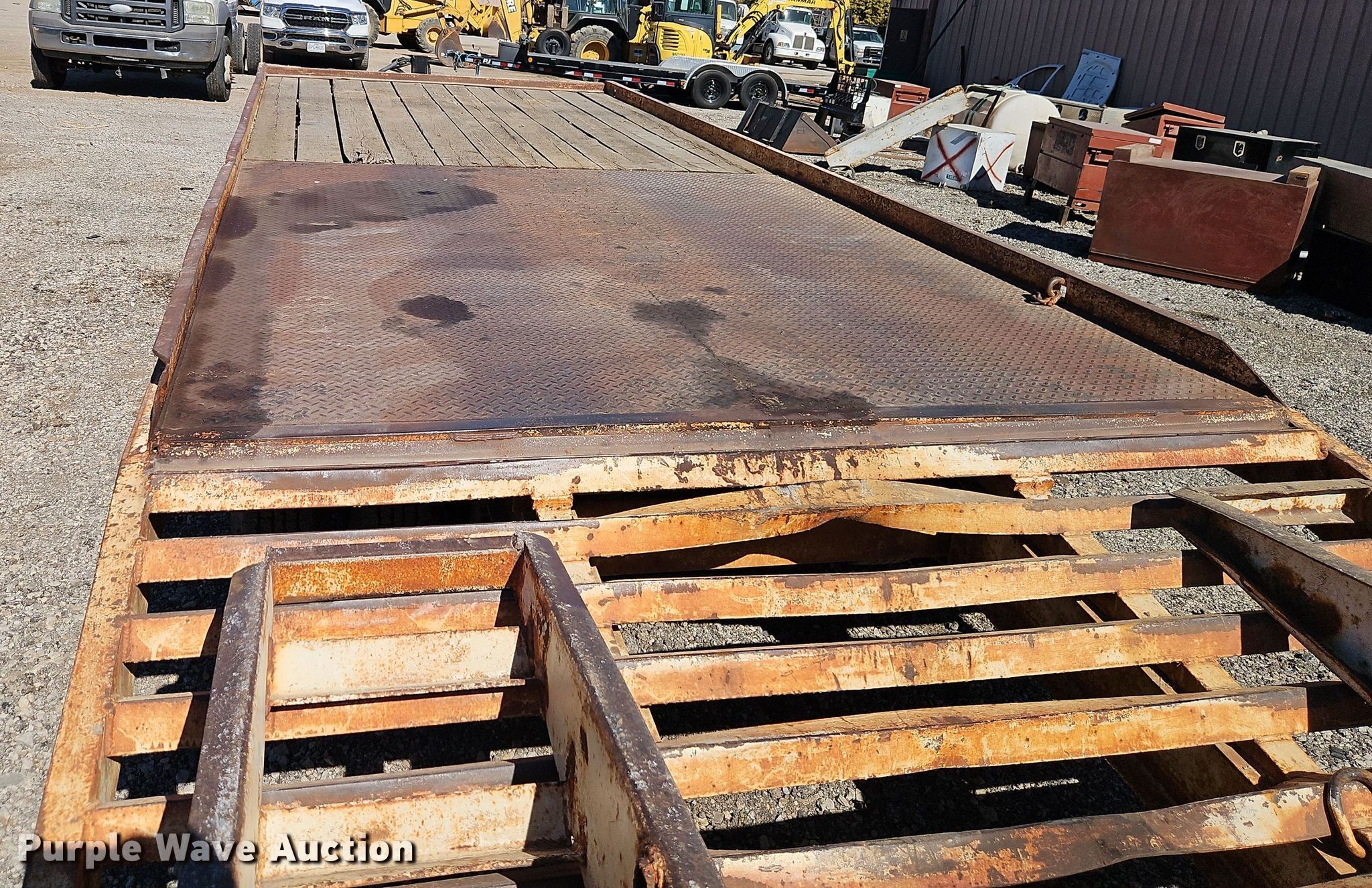 1986 Trail-Eze T220 equipment trailer. VIN: 1DA12RJ44GP008401. Dimensions Overall: 30' L x 96" W, Deck: 19' L x 92" W, Deck height: 33", Tail length: 5' 6", Ramps: Manual Length: 4' 6". Features Deck type: Steel, Wood. Chassis Hitch: Pintle, Landing gear: Single, Suspension: Walking beam, Brakes: Air, Axles: Tandem, GVWR: 24,285 lbs, GAWR: 10,000 lbs. Tires Steel wheels, Size: 8.75R16.5. Kansas title. Rylie Equipment & Contracting. Kansas City, KS 66119