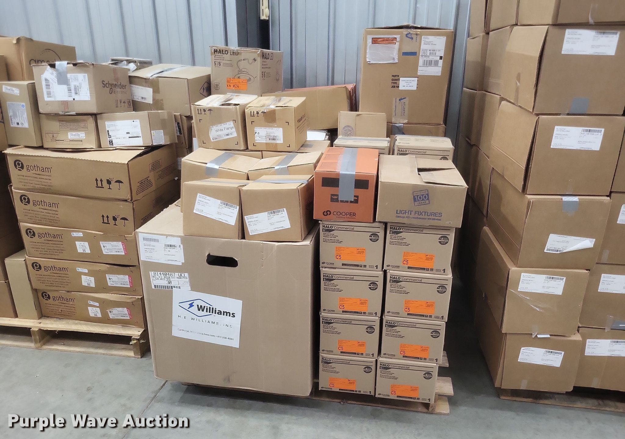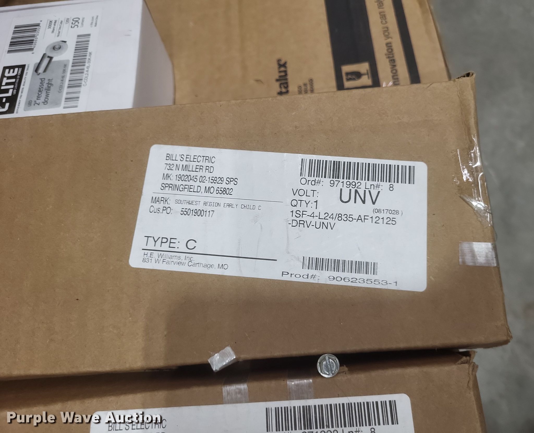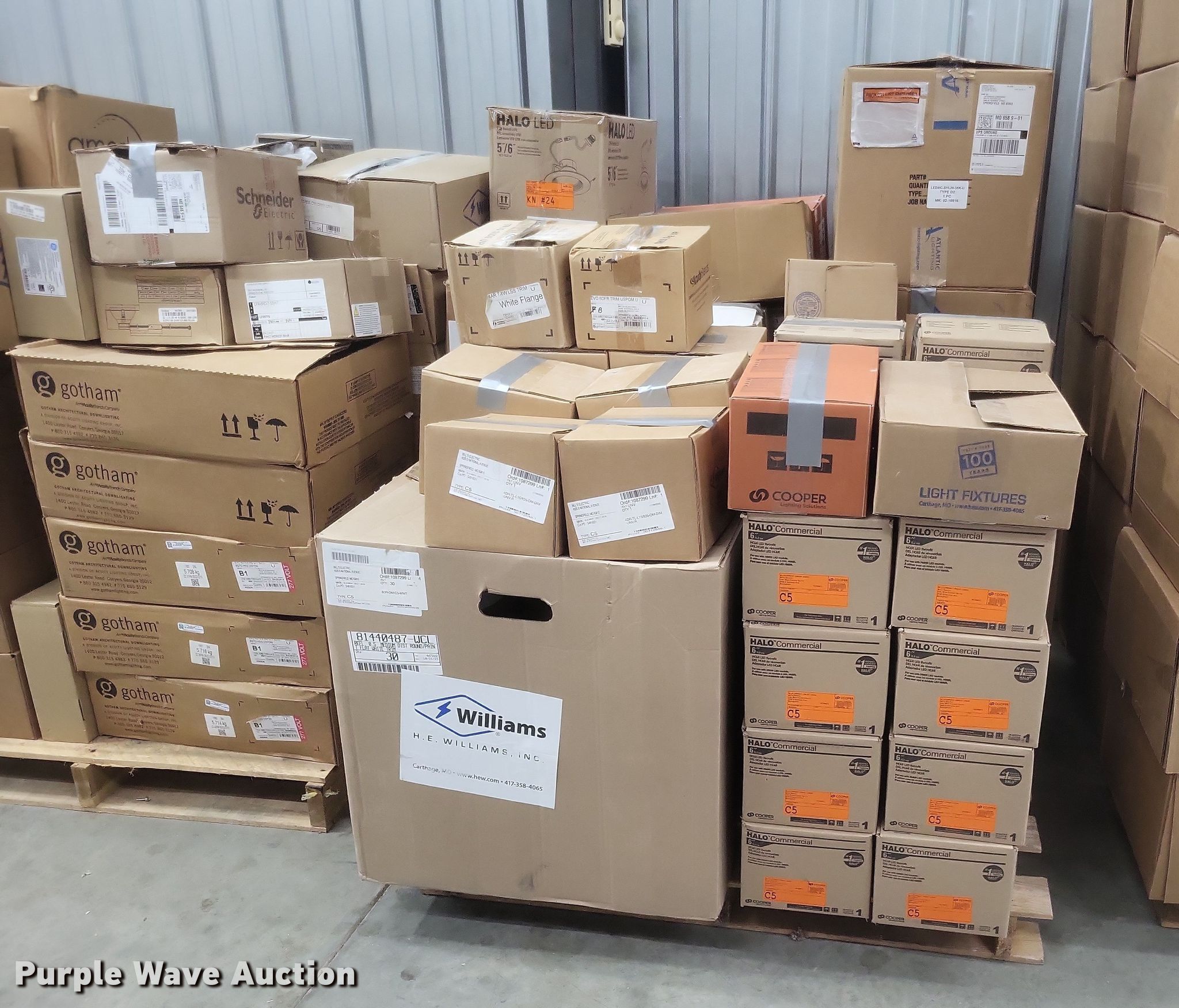 Purple Wave is selling a used Building Materials in Missouri. This item is a Light fixtures with the following: Can lights, Can trim, Can bulbs, Pole arms and more