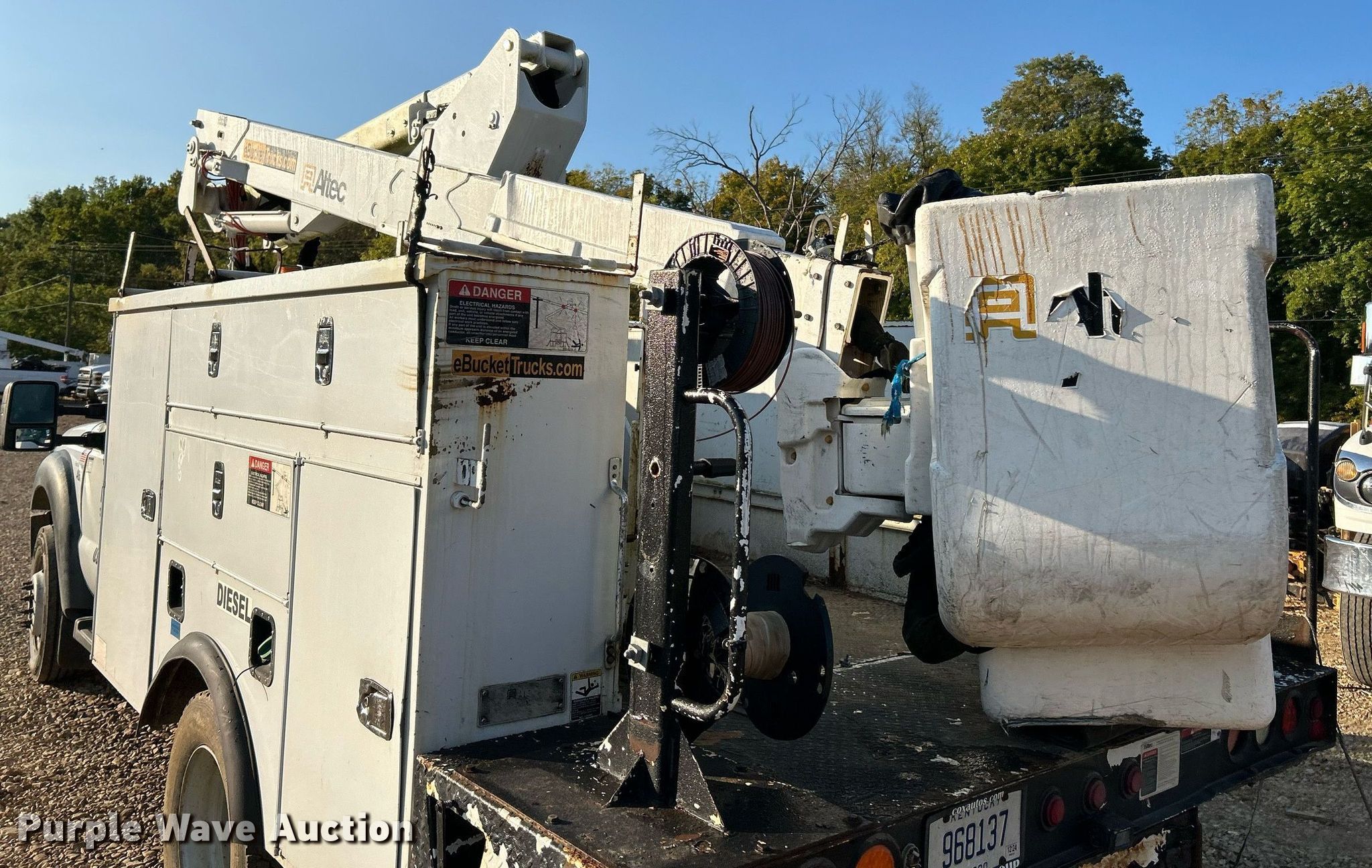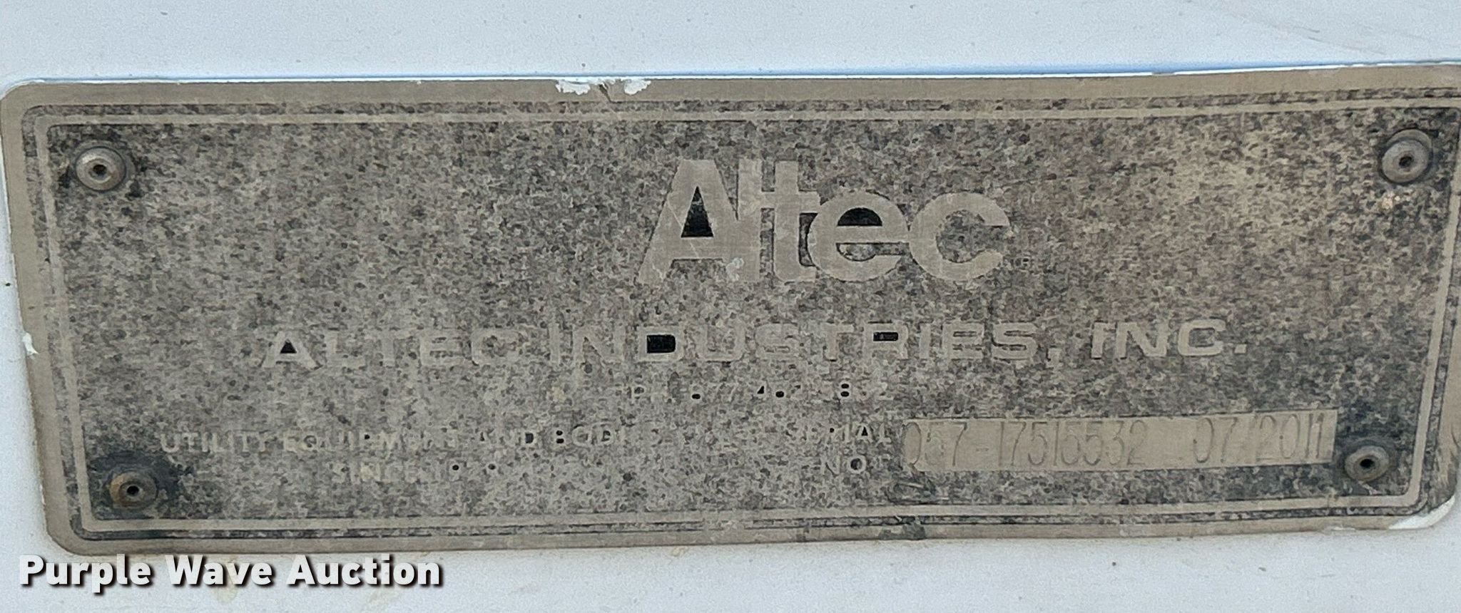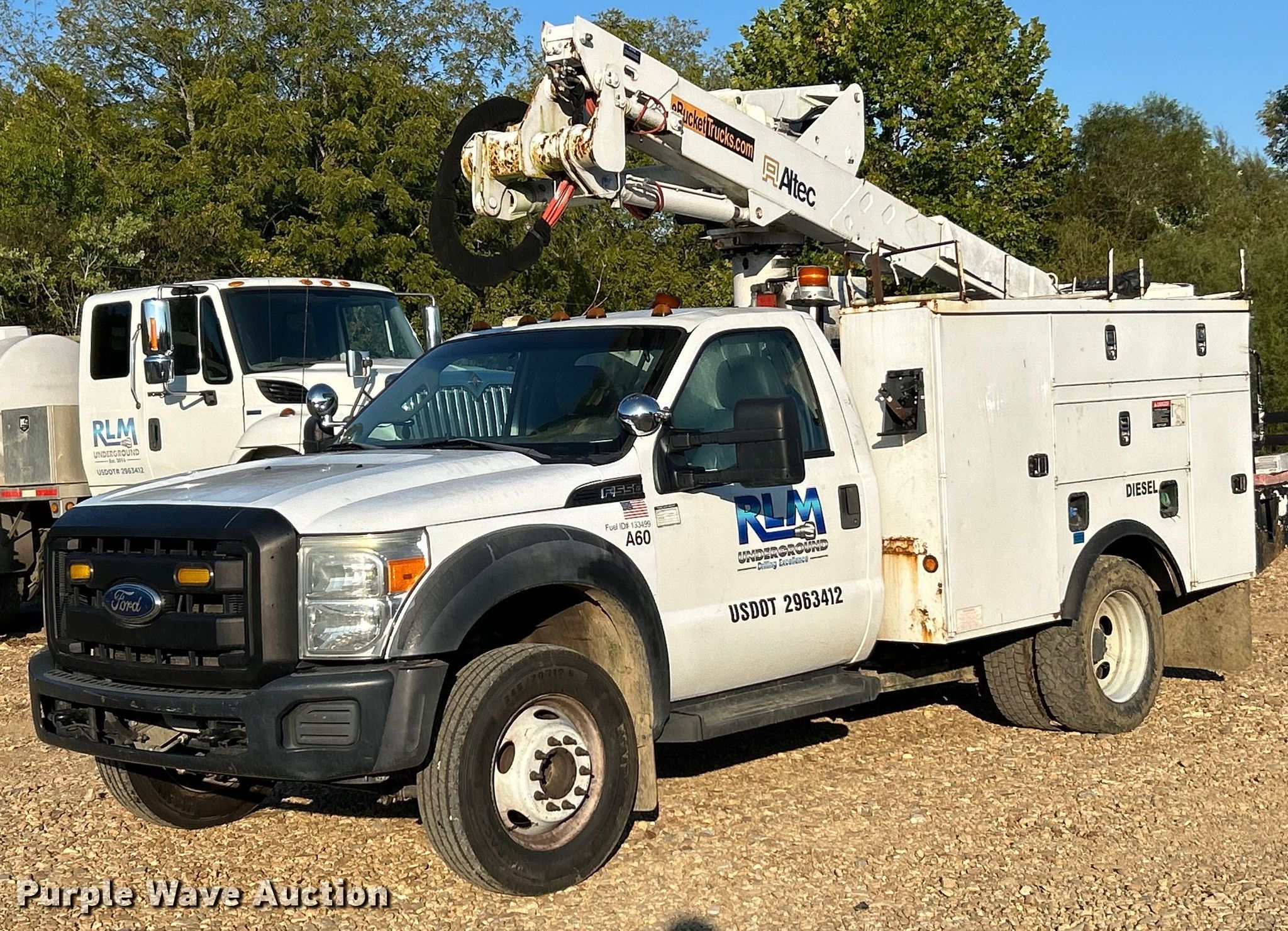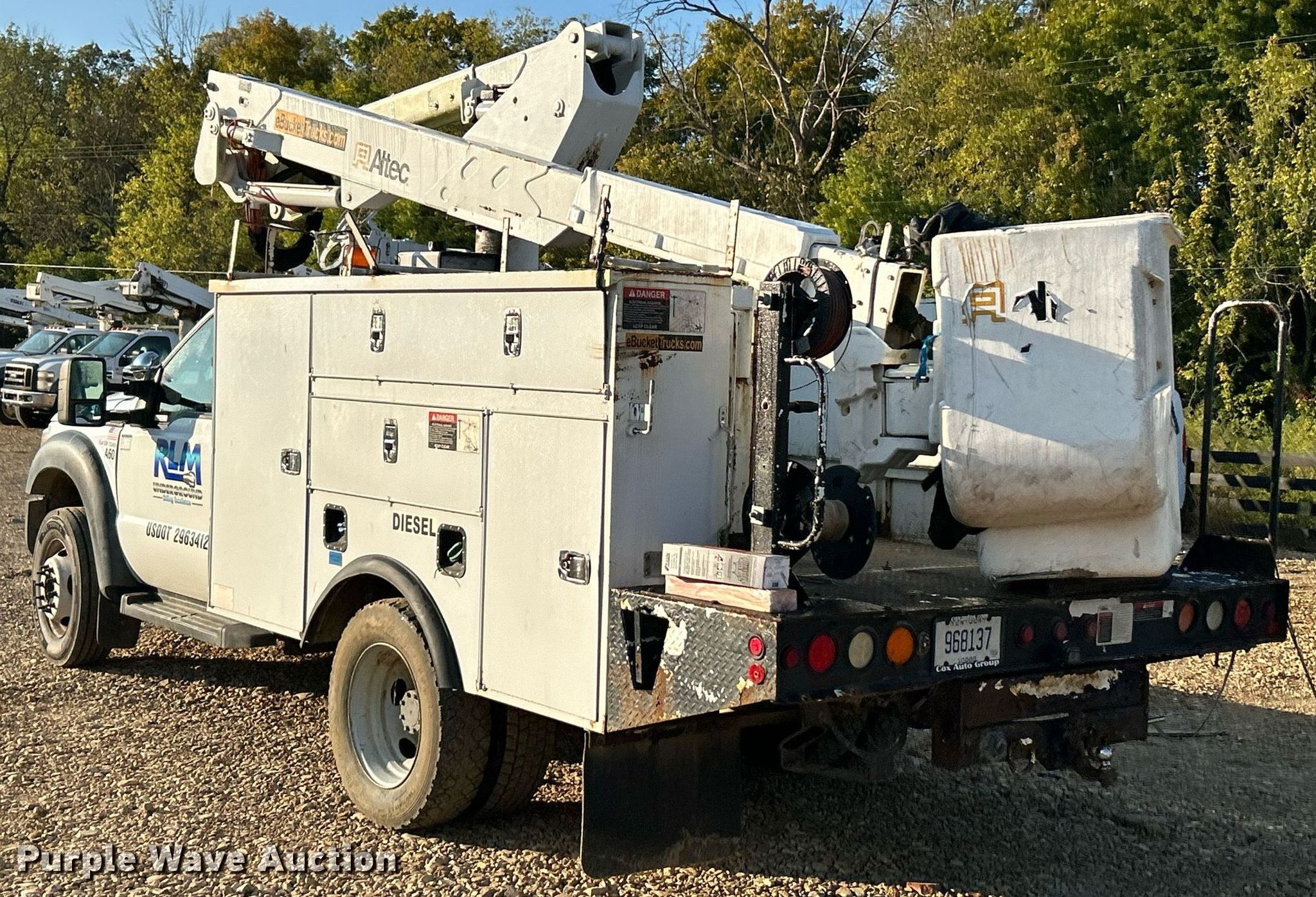 2011 Ford F550 Super Duty XL bucket truck. Miles: 177,029 on odometer, VIN: 1FDUF5GT2BEB33499. Engine Displacement: 6.7L, Cylinders: 8, Fuel type: Diesel. Transmission Automatic. Chassis Axles: Single, Suspension: Spring, Brakes: Hydraulic, PTO, GVWR: 19,500 lbs. Interior AC, Heat, Cruise control, Auxiliary controls, Brake controller. Features Bed Altec, 9' 2" L x 94" W, Boom Altec AT37-G, Serial: 0111DE12607, Maximum lift capacity: 400 lbs, Maximum lift height: 37.5', Boom type: Articulating, Insulated, Telescopic, Man basket, Boom controls Ground, Platform/ basket.. Tires Size: 245/70R19.5. Notes Dash warning indicator: Airbag, Windshield chipped or cracked, Possible AC issues, may need charged, Decals will be removed prior to auction. Kentucky title. RLM Underground. Springfield, KY 40069