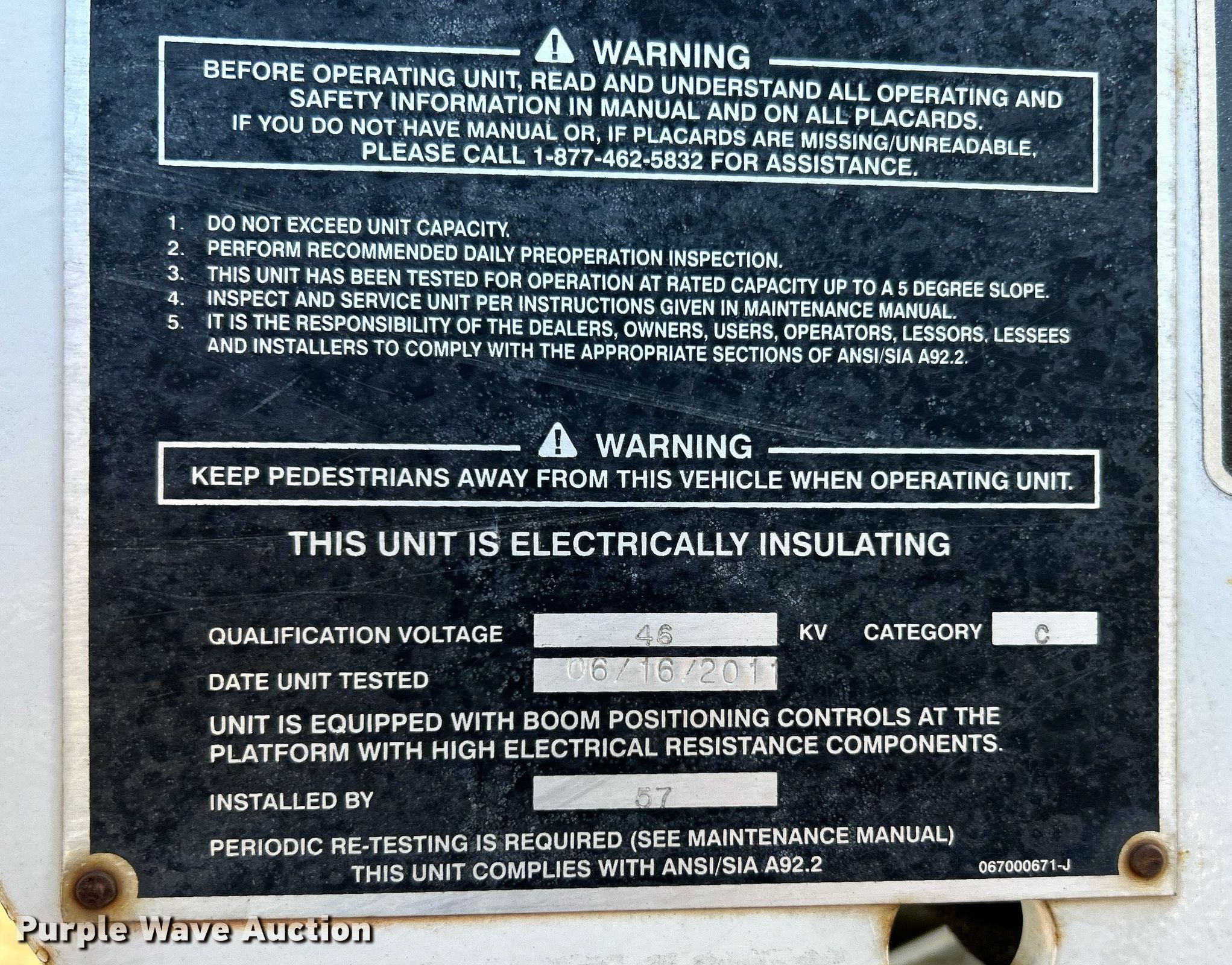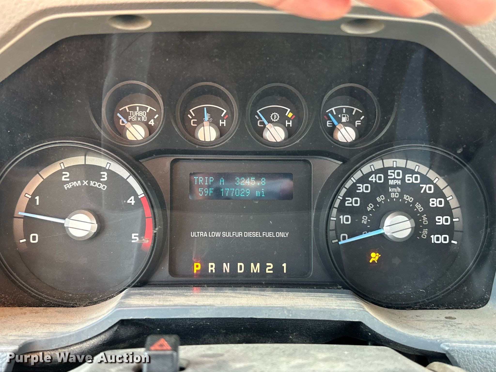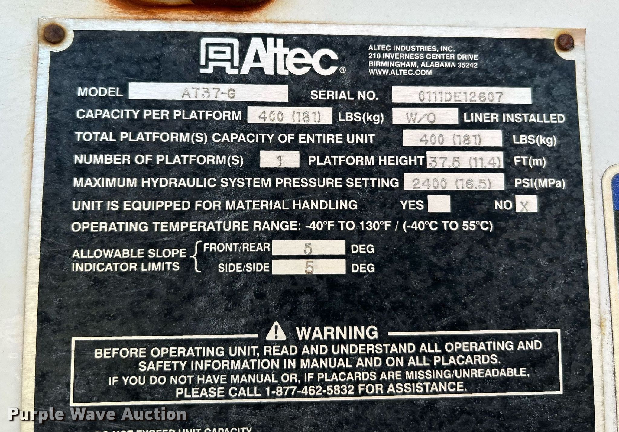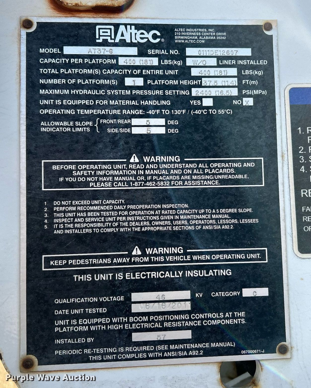 2011 Ford F550 Super Duty XL bucket truck. Miles: 177,029 on odometer, VIN: 1FDUF5GT2BEB33499. Engine Displacement: 6.7L, Cylinders: 8, Fuel type: Diesel. Transmission Automatic. Chassis Axles: Single, Suspension: Spring, Brakes: Hydraulic, PTO, GVWR: 19,500 lbs. Interior AC, Heat, Cruise control, Auxiliary controls, Brake controller. Features Bed Altec, 9' 2" L x 94" W, Boom Altec AT37-G, Serial: 0111DE12607, Maximum lift capacity: 400 lbs, Maximum lift height: 37.5', Boom type: Articulating, Insulated, Telescopic, Man basket, Boom controls Ground, Platform/ basket.. Tires Size: 245/70R19.5. Notes Dash warning indicator: Airbag, Windshield chipped or cracked, Possible AC issues, may need charged, Decals will be removed prior to auction. Kentucky title. RLM Underground. Springfield, KY 40069