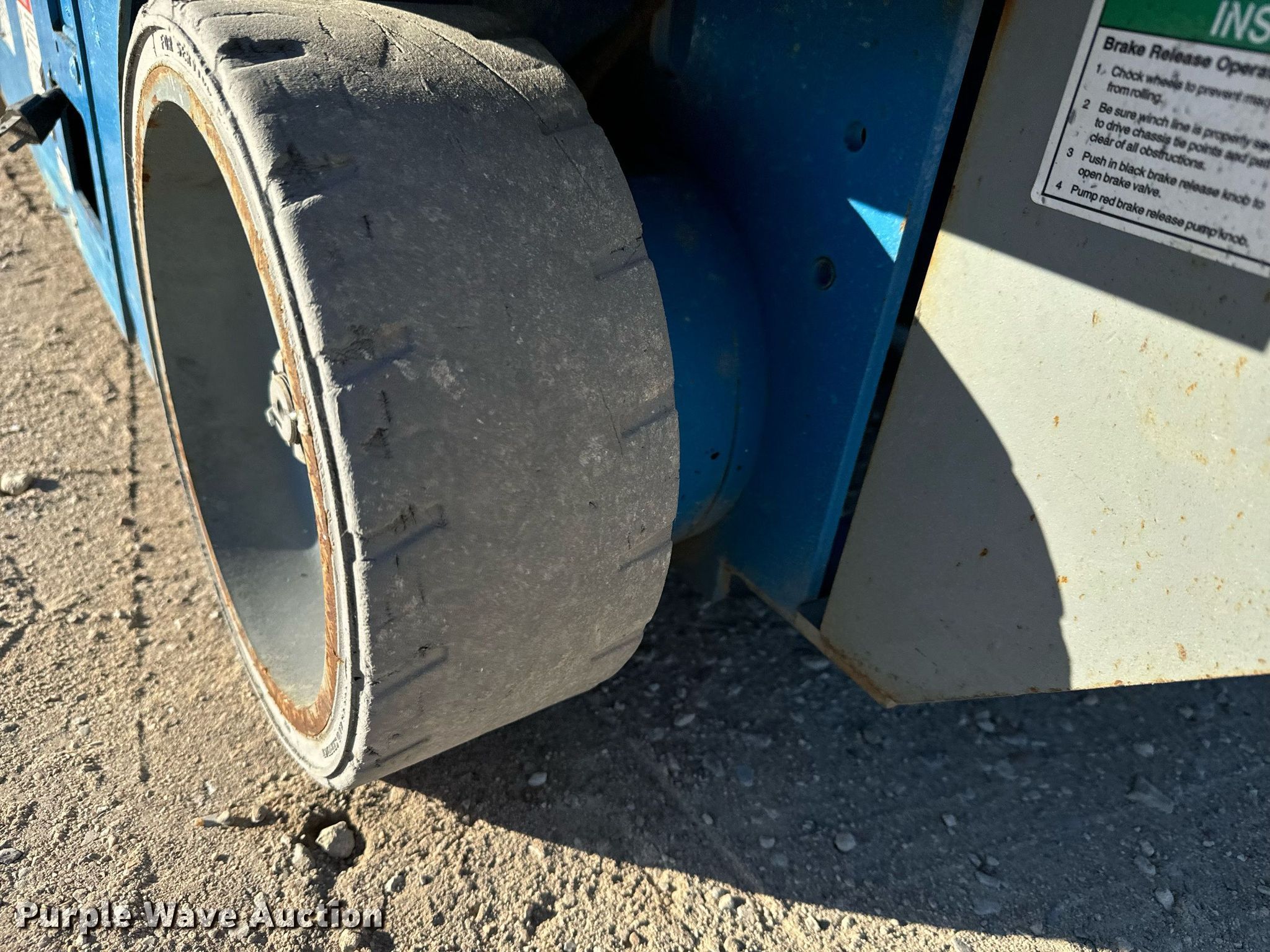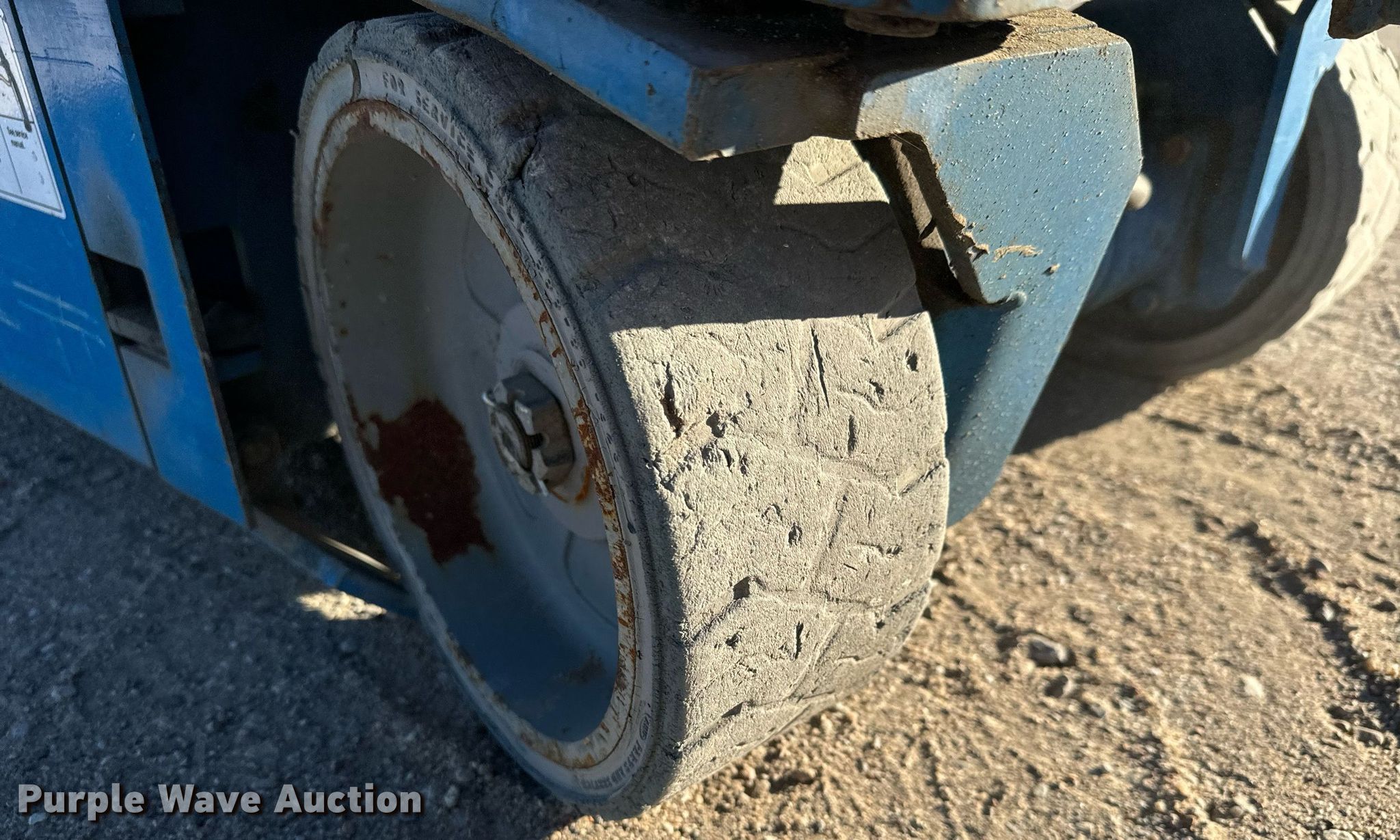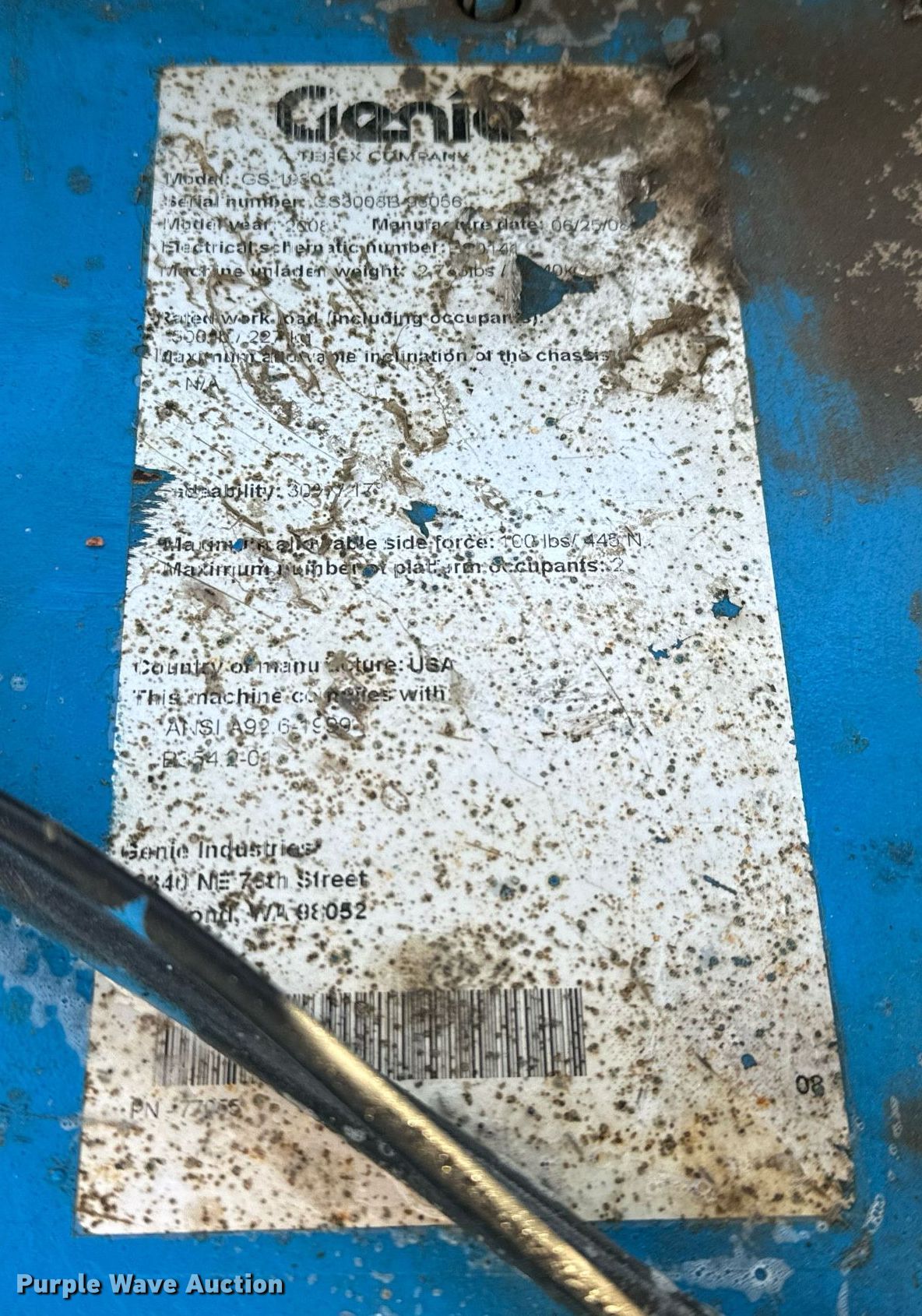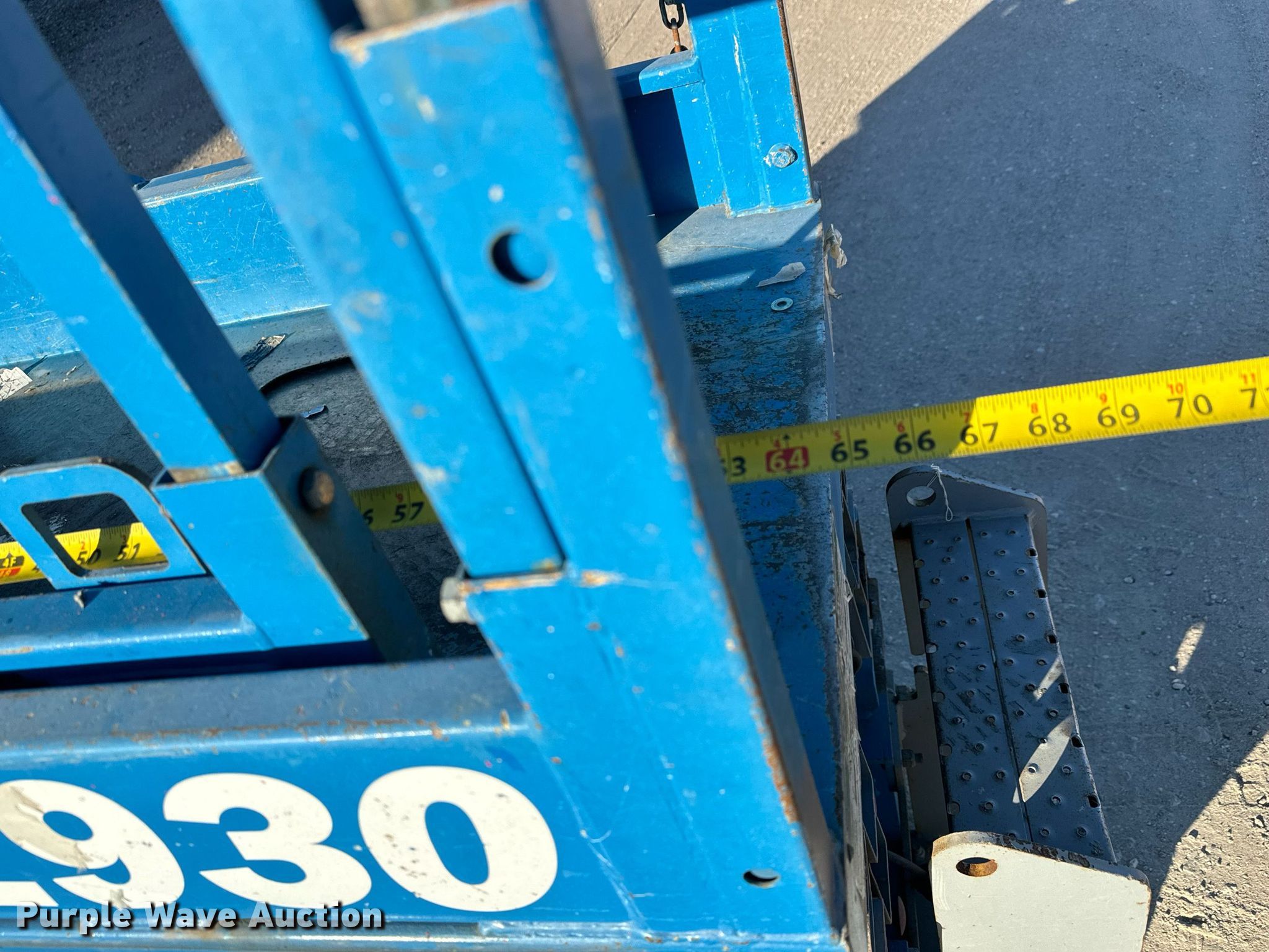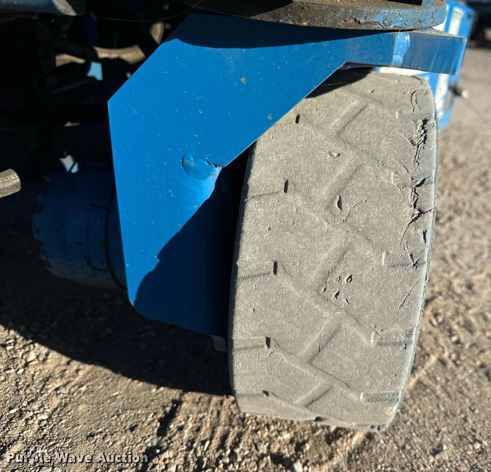 2008 Genie GS-1930 scissor lift. Hours: 173 on meter, Serial: GS3008B-98056. Electric Motor General Electric 5BCG52MA100A Serial: 123293, Volts: 12/24. Features Maximum lift capacity: 500 lbs, Maximum lift height: 19', Platform: 64" L x 29" W, AC power outlet, Controls: Platform, Ground, Platform extensions: Manual, Travel speed: 2.5 mph. Tires Tire size: 12x4.5, Solid. Notes Bent frame, only turns right. D&D Rental. Wichita, KS 67217