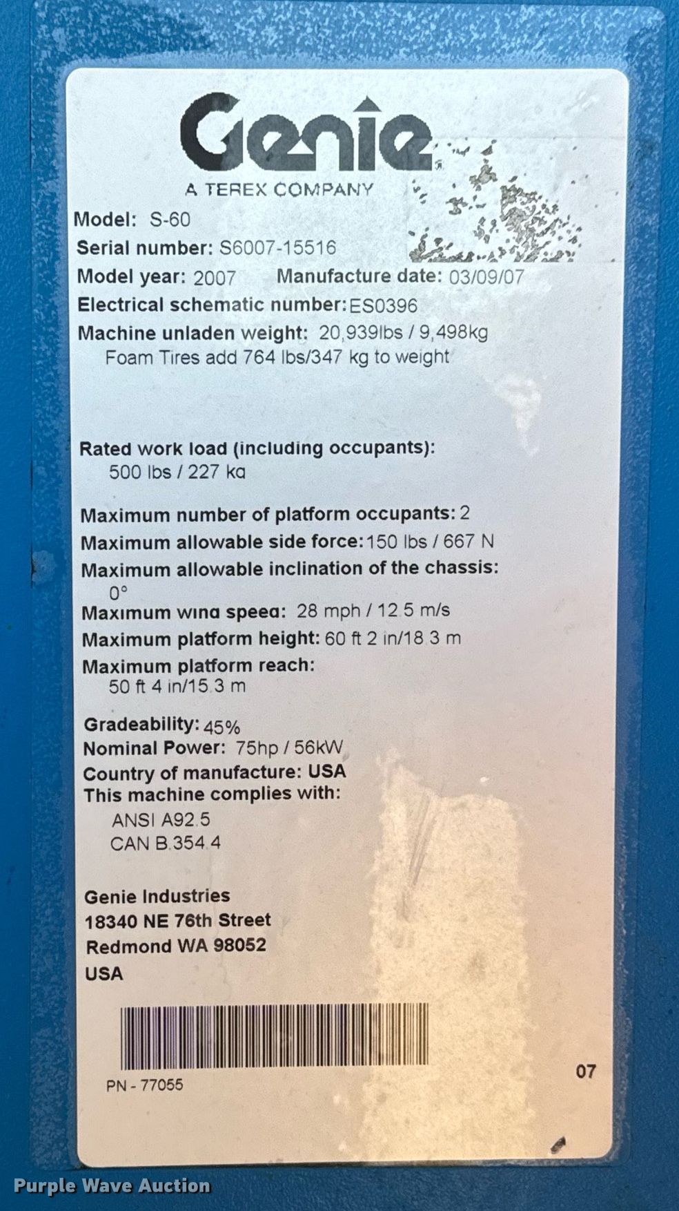 Purple Wave is selling a used Boom Lift in Kansas. This item is a 2007 Genie S60 boom lift with the following: Hours: 959 on meter, Serial: S6007-15516