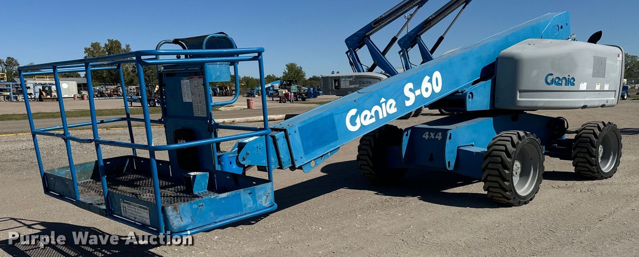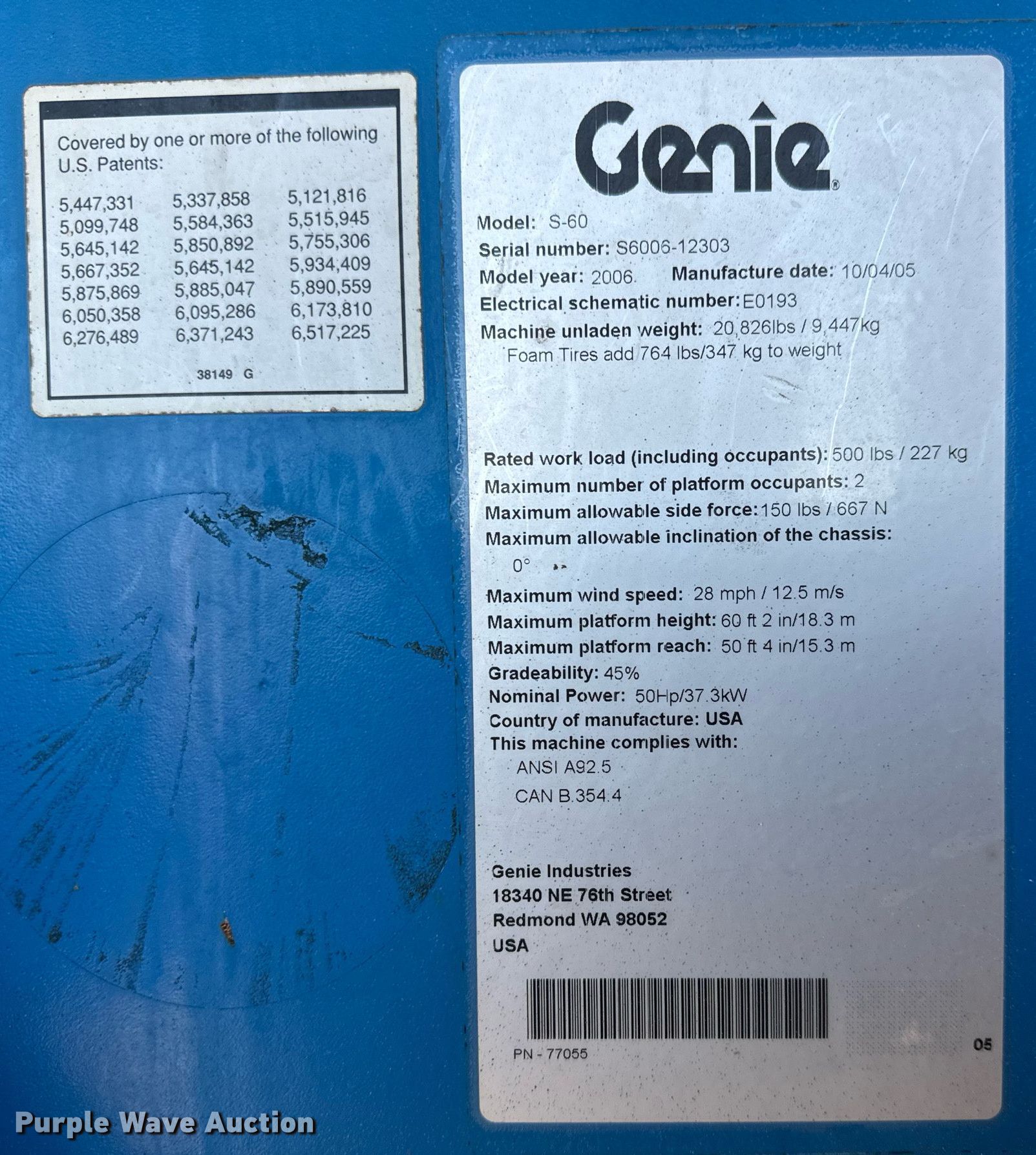 Purple Wave is selling a used Boom Lift in Kansas. This item is a 2006 Genie S60 boom lift with the following: Hours: 31 on meter, Actual hours unknown, Serial: S6006-12303