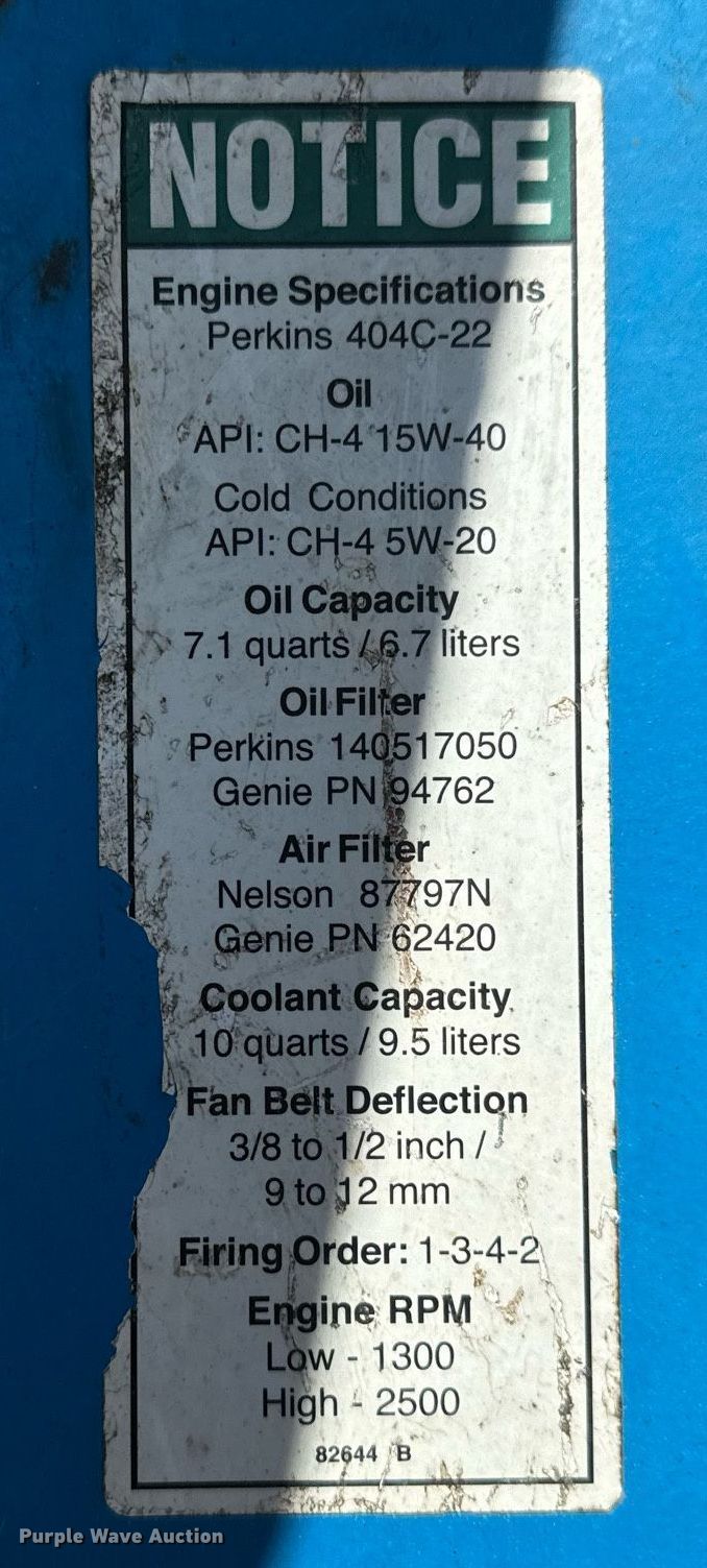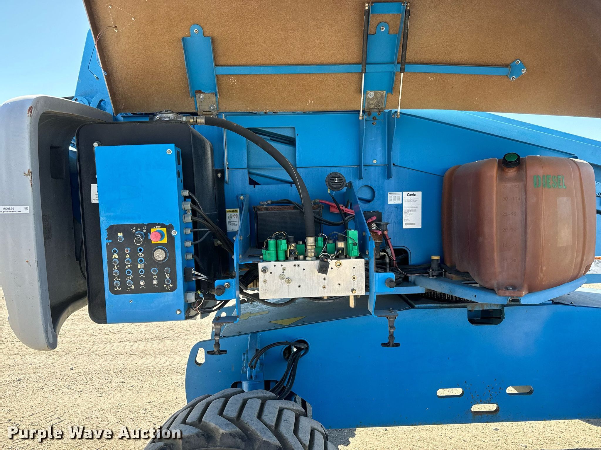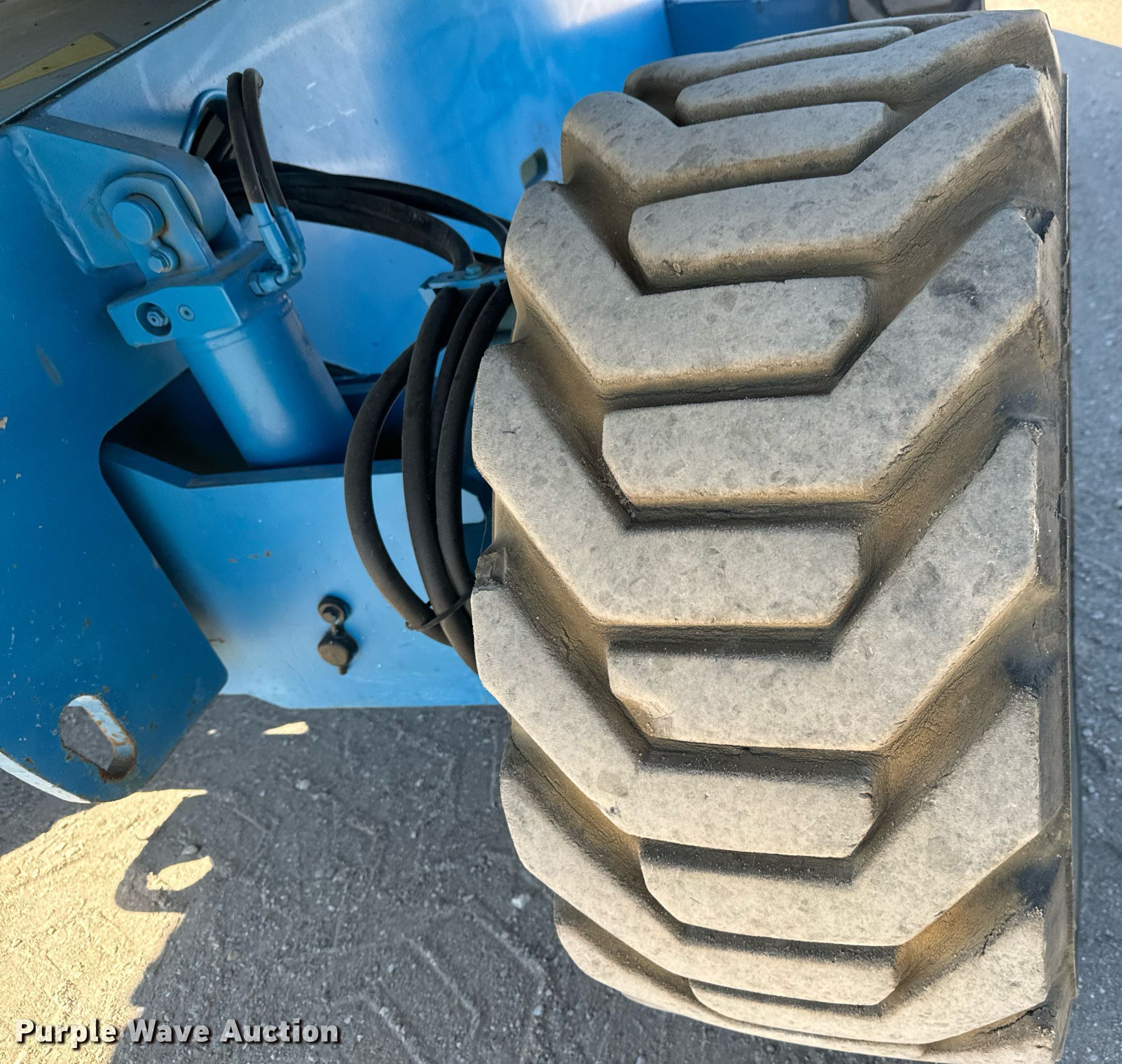 2006 Genie S60 boom lift. Hours: 31 on meter Actual hours unknown, Serial: S6006-12303. Engine Perkins 404C-22, Cylinders: 4, Fuel type: Diesel. Chassis Four wheel drive. Features Rough terrain, Boom type: Telescopic, Maximum lift capacity: 500 lbs, Maximum reach length: 50' 4", Maximum lift height: 60' 2", Hydraulic leveling, Platform: 94" L x 34" W, AC power outlet, Controls: Platform, Ground, Platform rotation: Hydraulic, Travel speed: 4 mph. Tires Tire size: 355/55D625, Foam filled. Notes Hour meter replaced. D&D Rental. Wichita, KS 67217