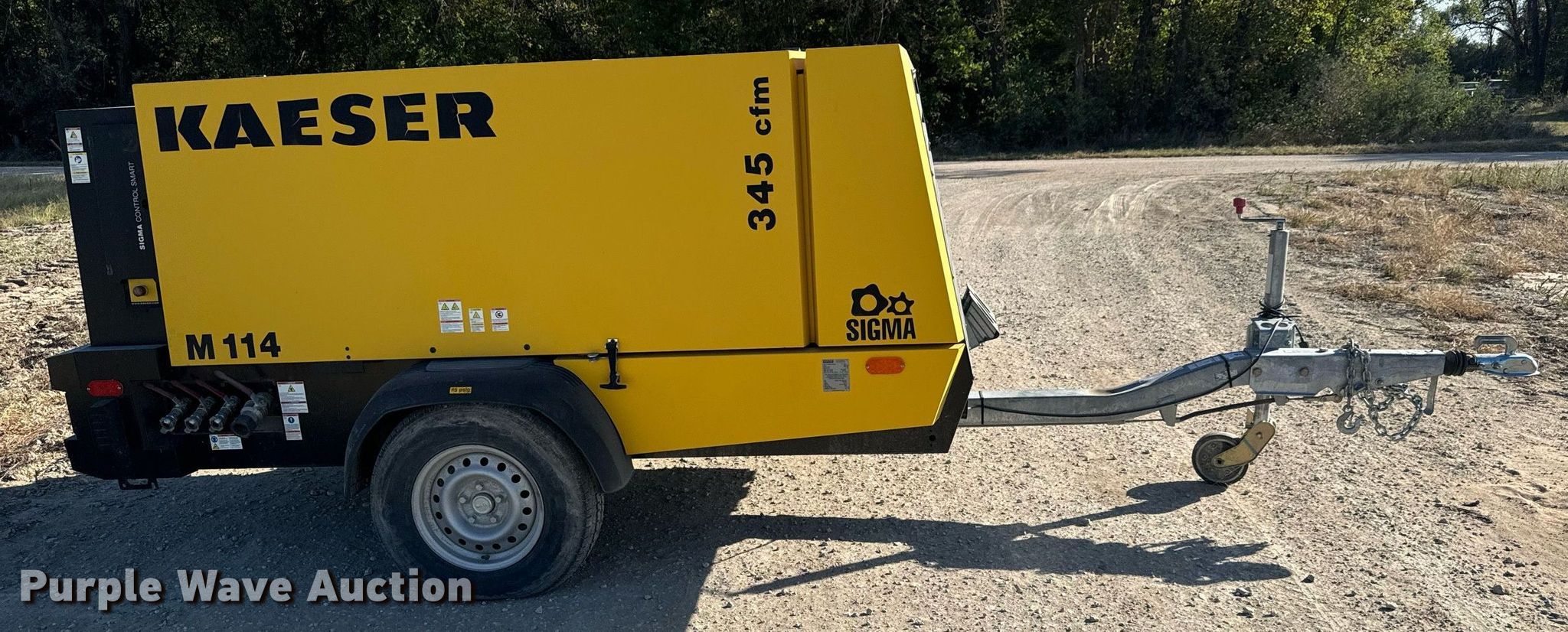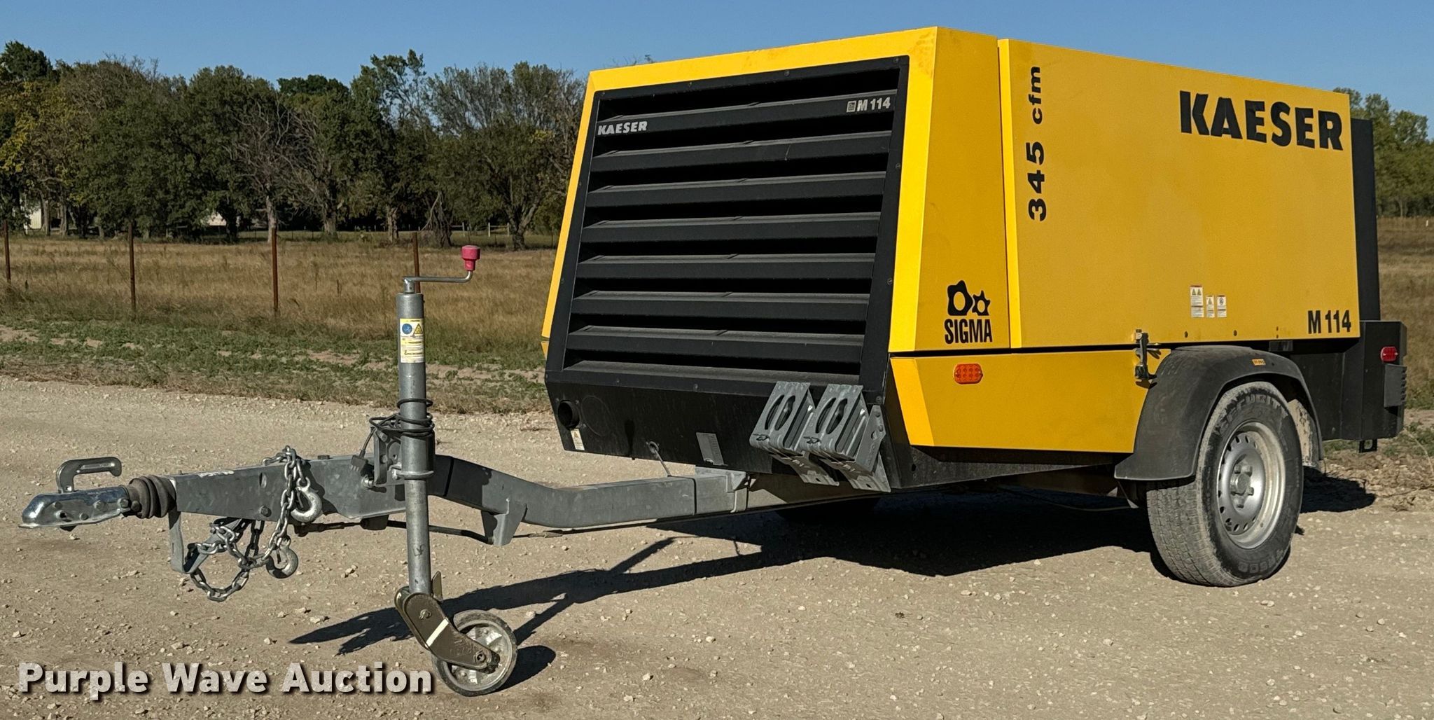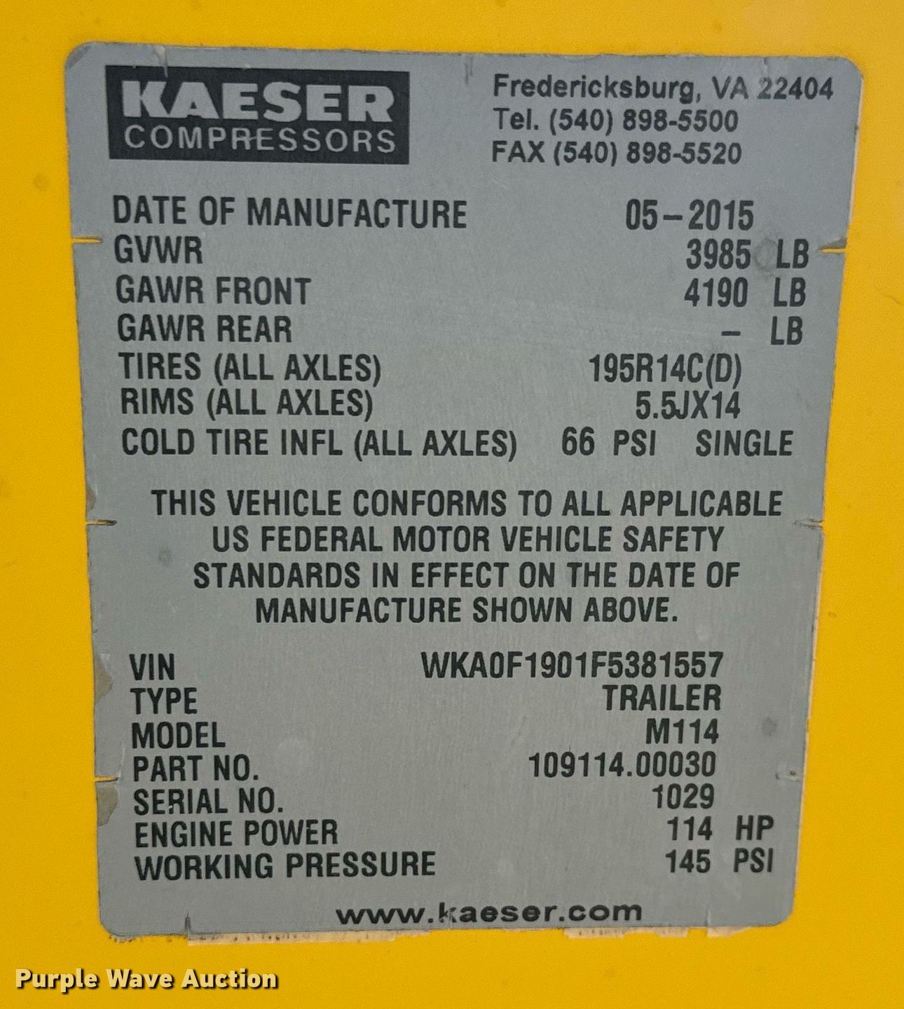2015 Kaeser M114 air compressor. Hours: 421 on meter, Serial: 1029. Engine Cylinders: 4, Fuel type: Diesel, HP: 114. Features Air compressor CFM: 375, PSI: 145. Trailer 15.5' L x 72" W, Ball hitch size: 2", Suspension: Spring, Axles: Single, Tire size: 195R14. This is worksite support equipment and will not come with a title. Transfer of ownership documentation will be a bill of sale. Valley Center, KS 67147