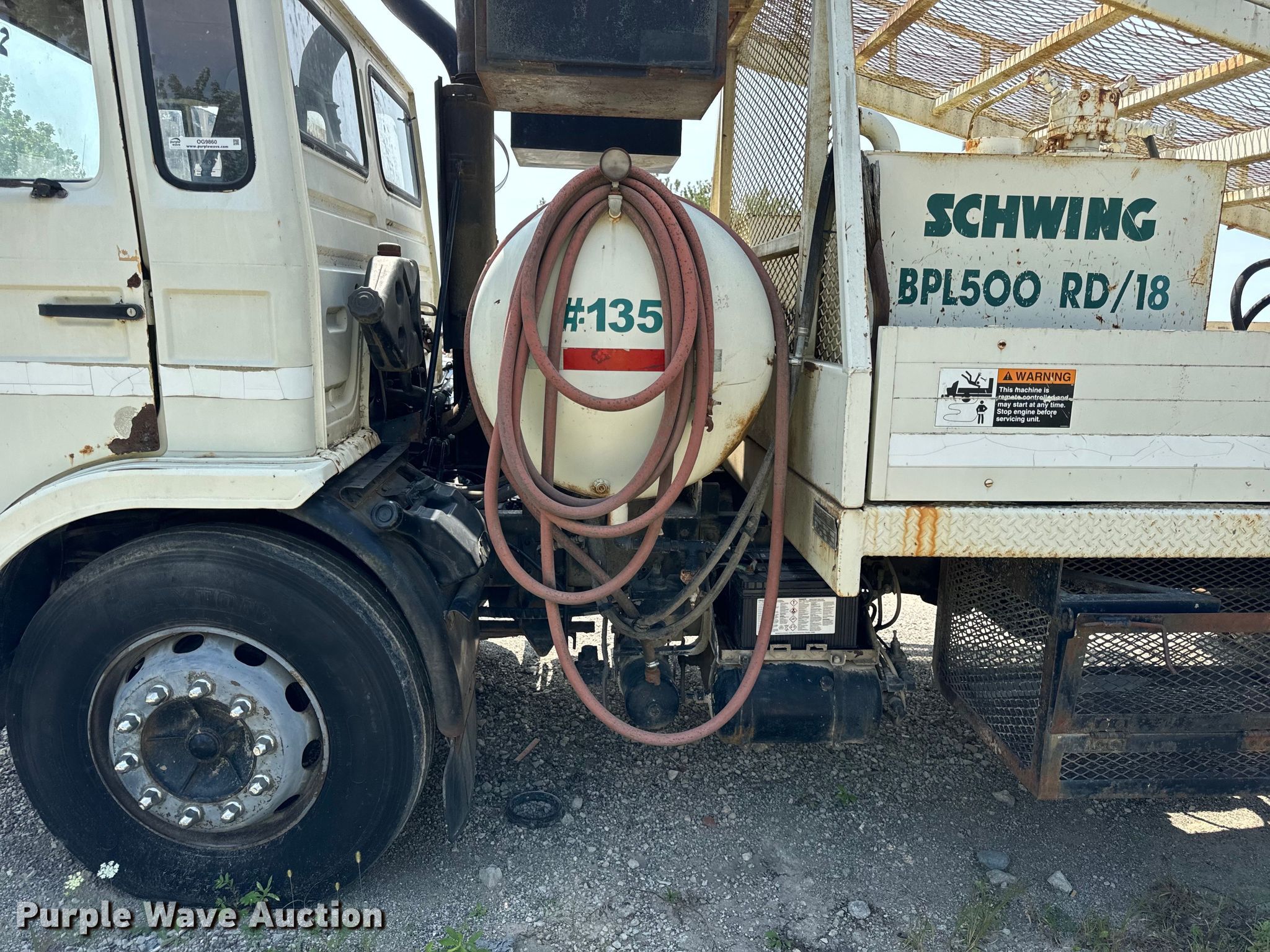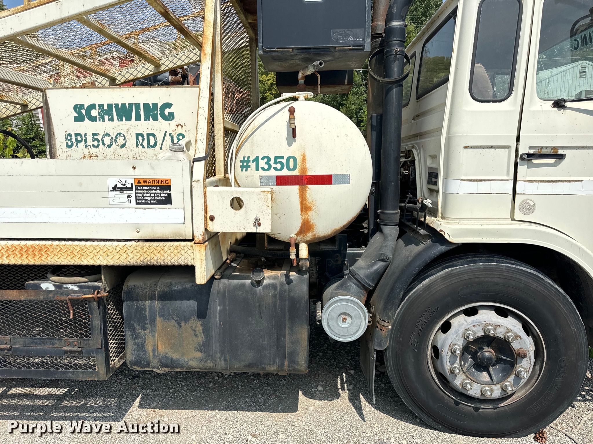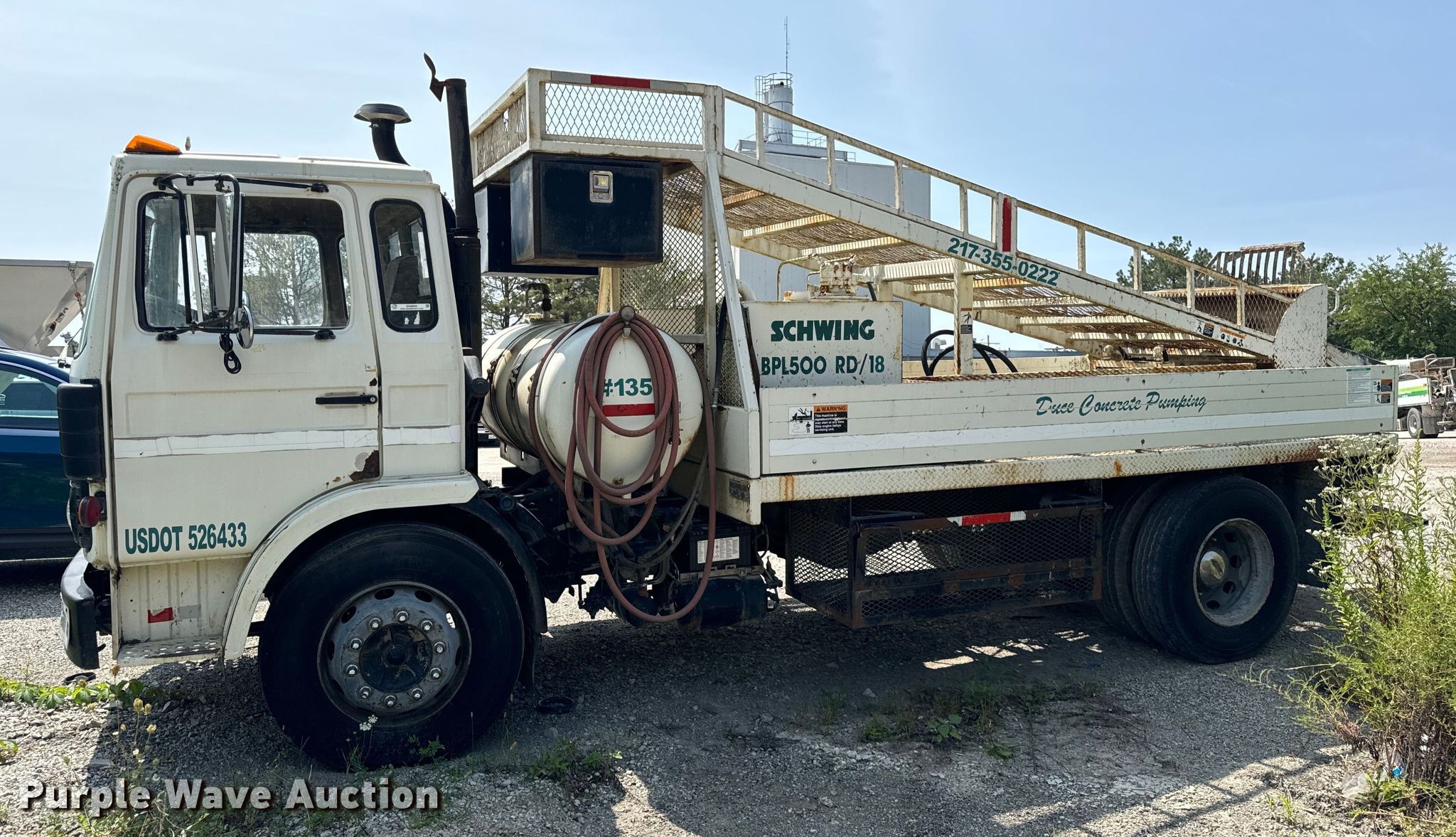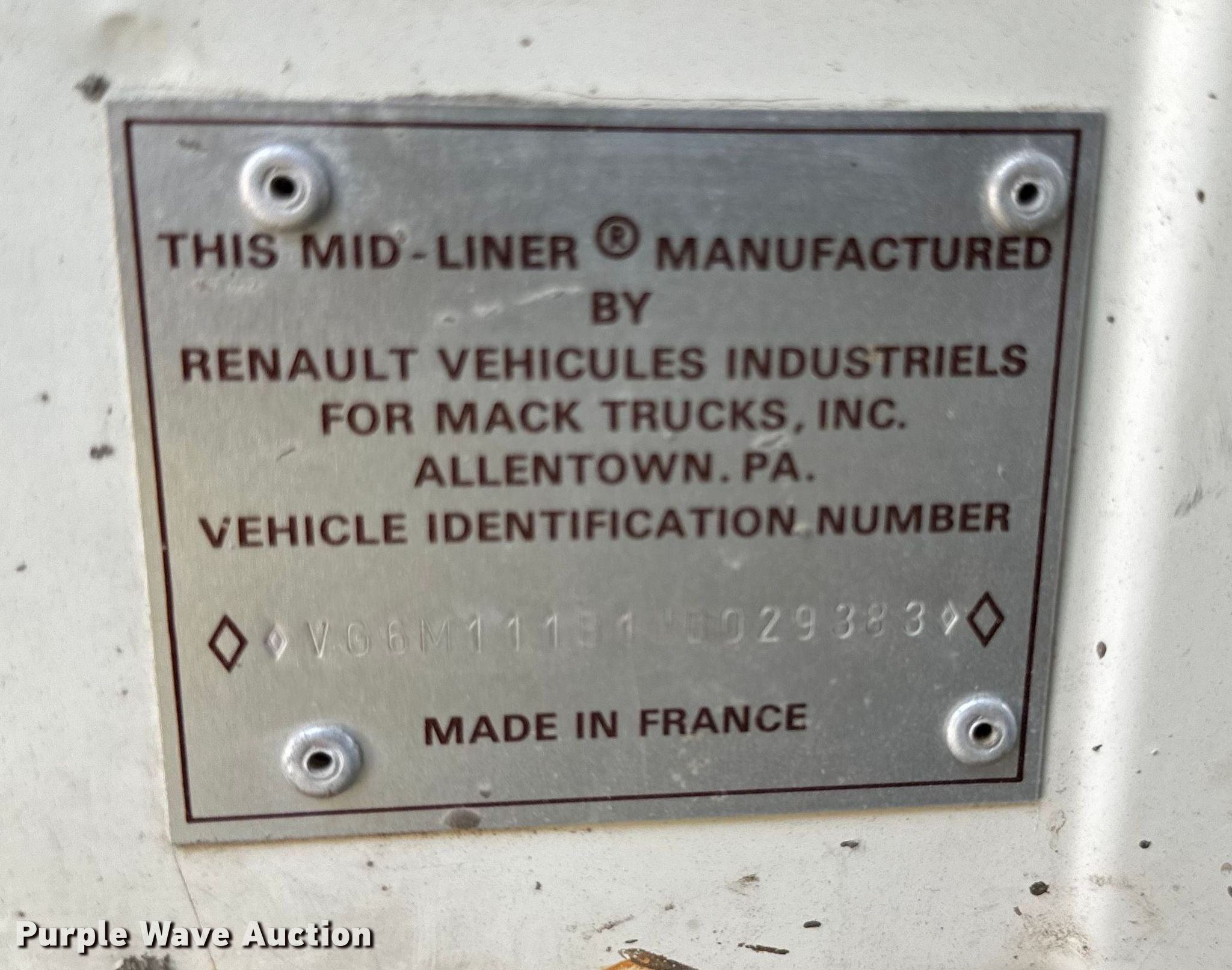 1988 Mack MS200 concrete pump truck. Miles: 251,208 on odometer, Hours: 5,313 on meter, VIN: VG6M111B1JB029383, Unit #: 1350. Engine Renault, Displacement: 5.5L, Cylinders: 6, Fuel type: Diesel. Transmission Manual. Chassis Axles: Single, Suspension: Spring, Brakes: Air. Interior Heat. Features Pump Schwing BPL500 RD-18, Serial: 171305036. Tires Size: 11R22.5. Notes Windshield chipped or cracked, Possible transmission issues, linkage issues., Possible pump electrical issues, Unit must be towed or hauled, Unknown operating condition. Illinois title. Mileage has not been verified. Exempt will be written in the odometer disclosure on the title. Duce Construction Company. Champaign, IL 61822
