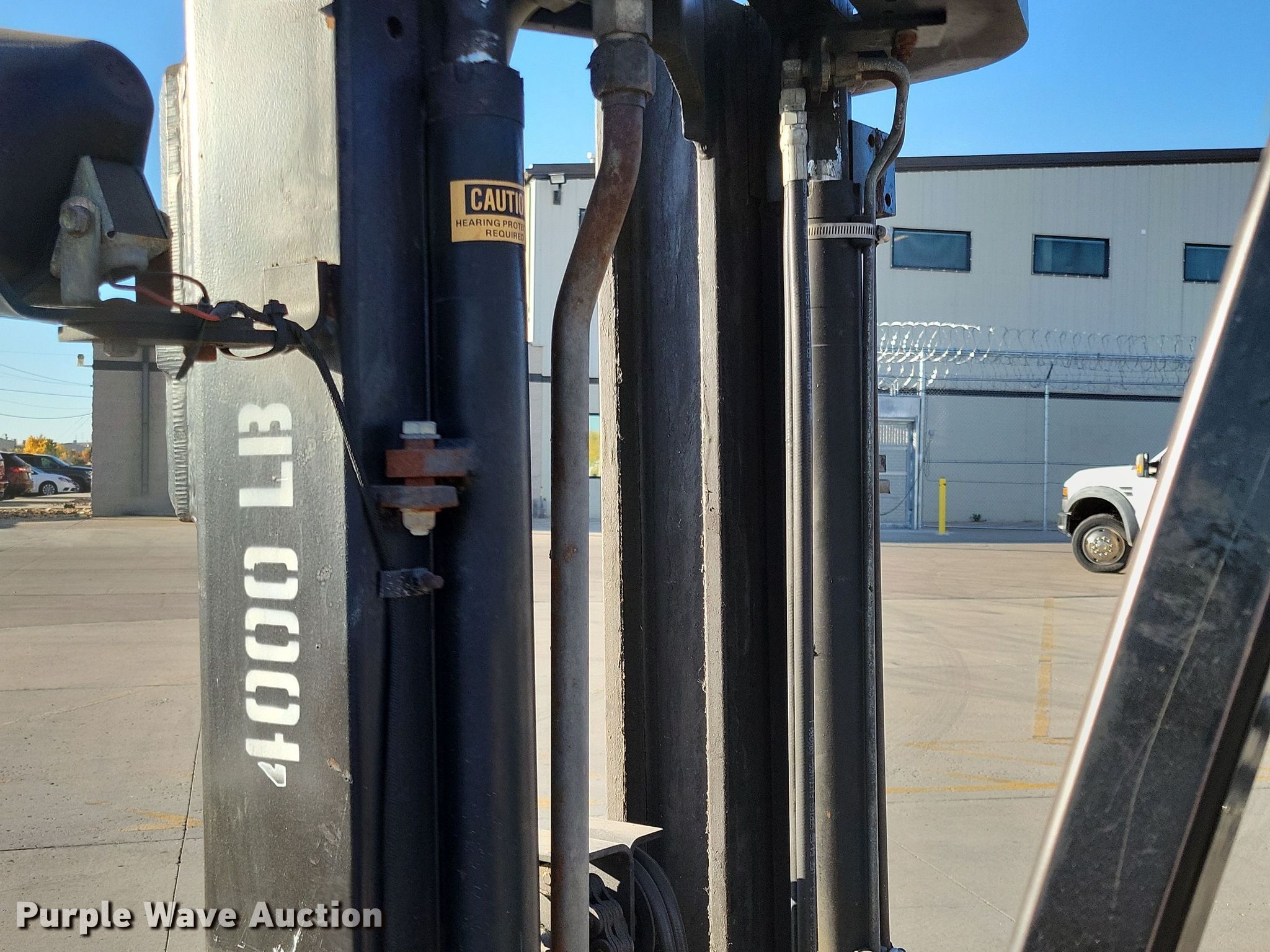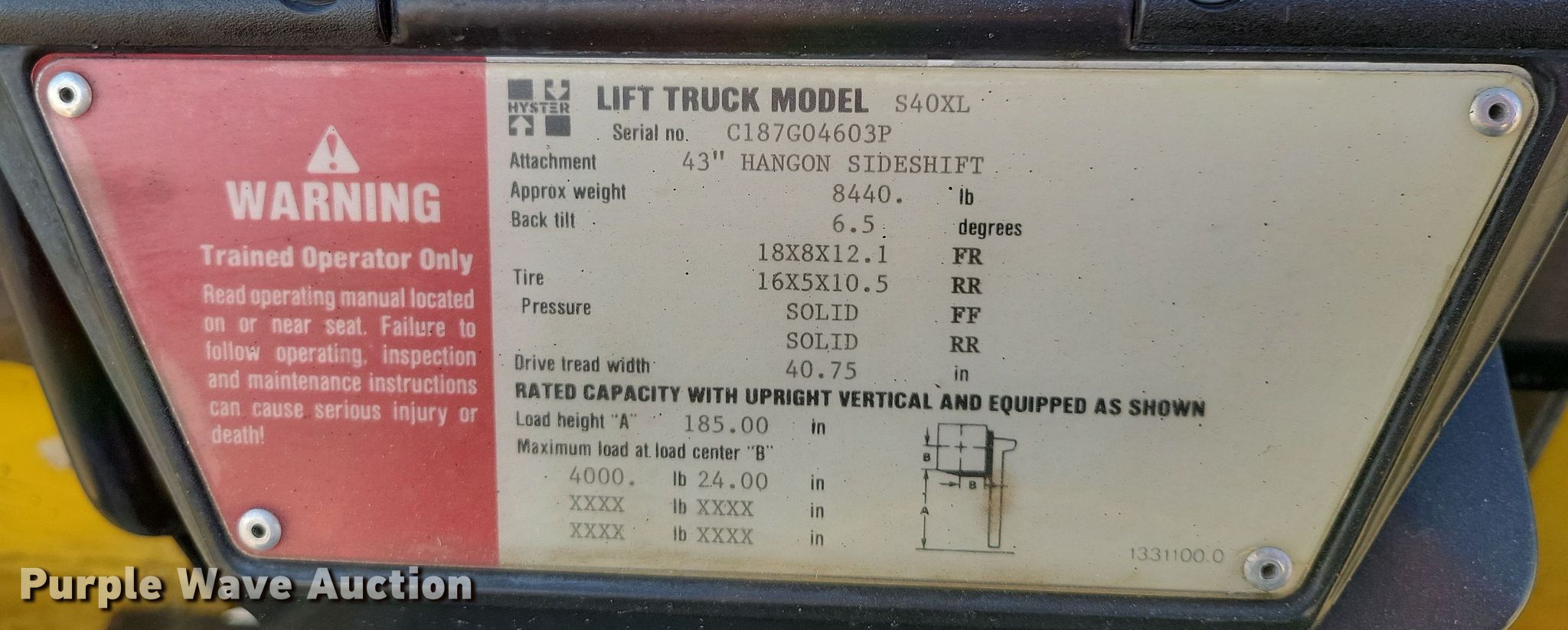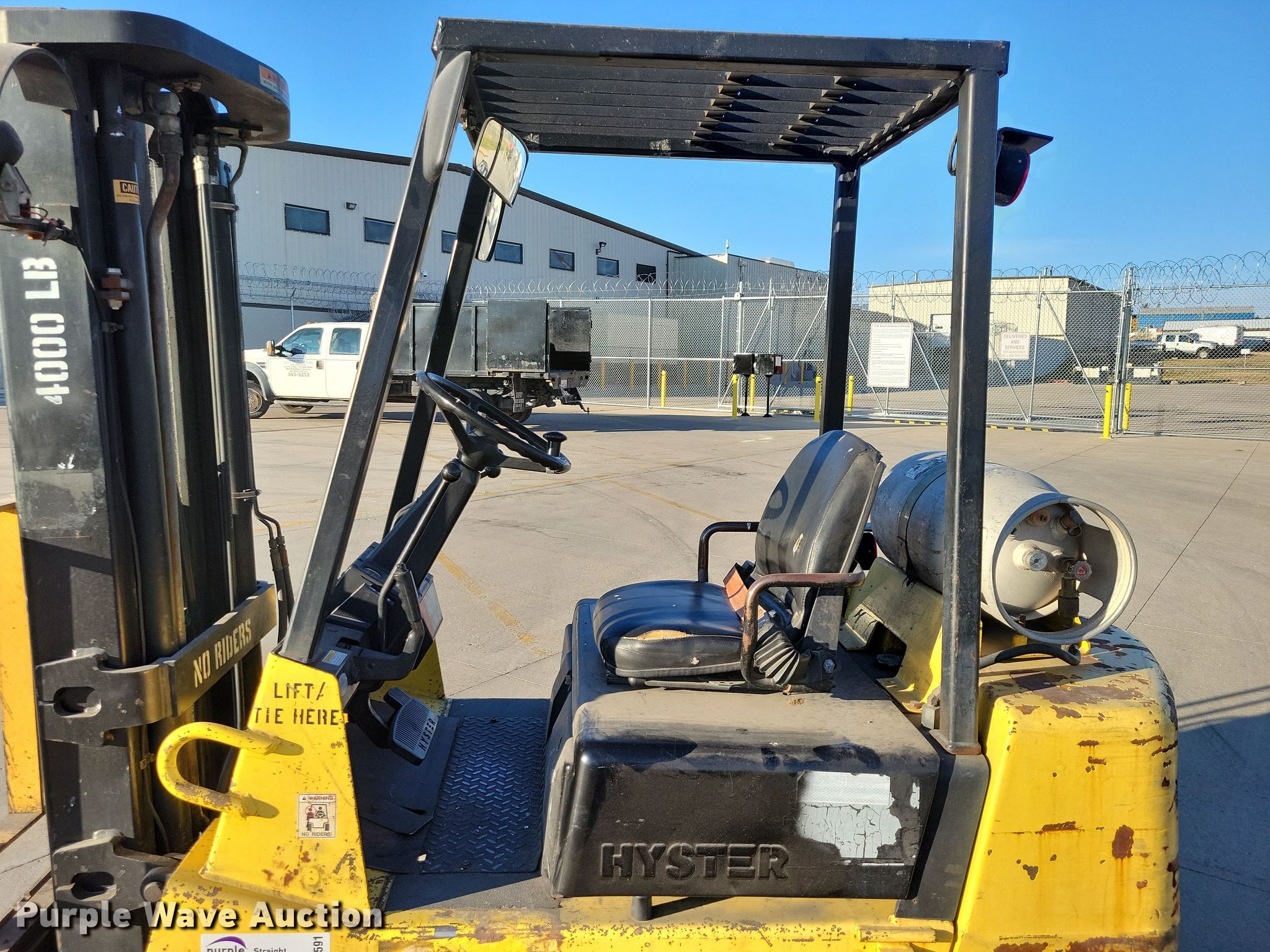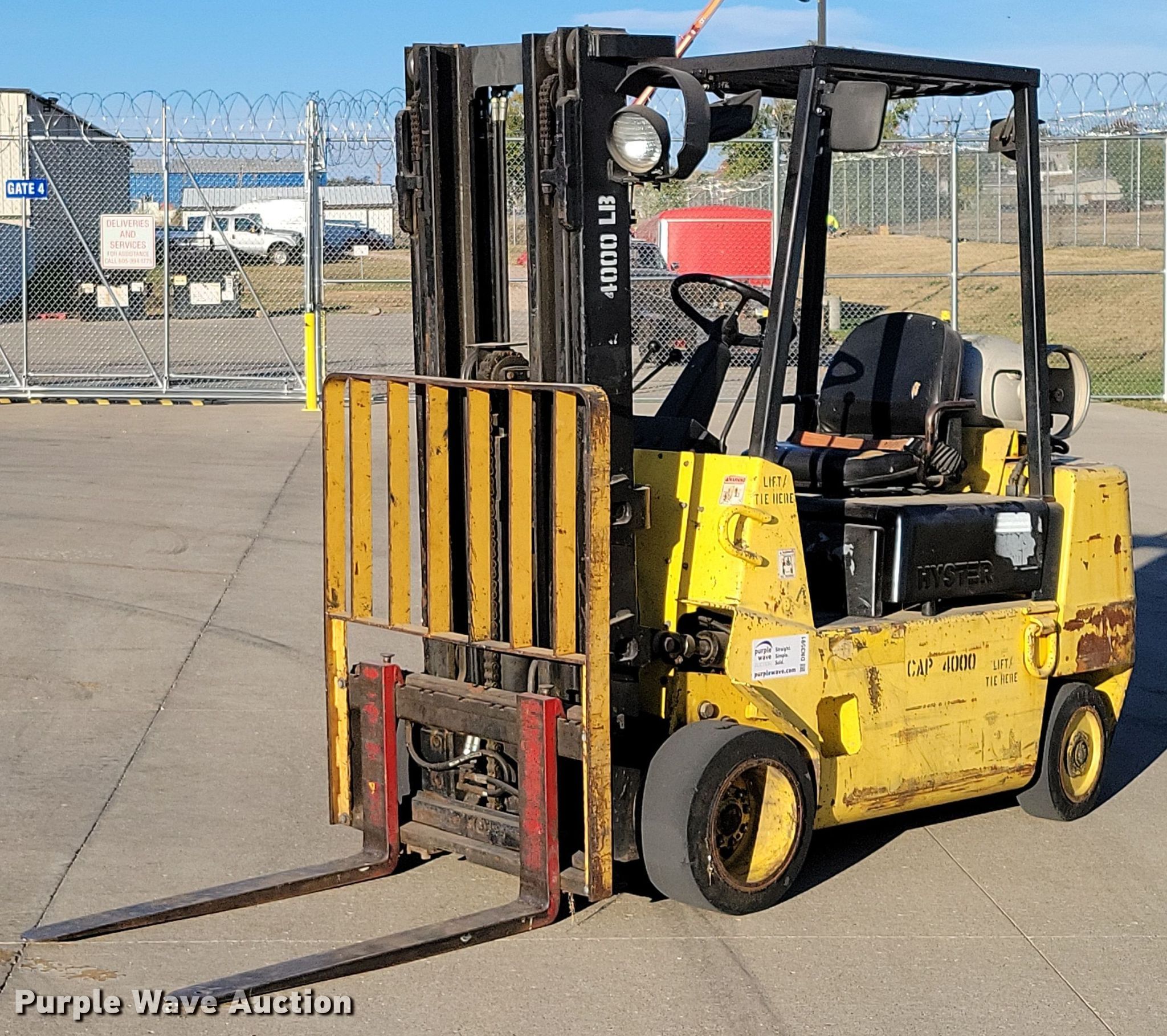 1993 Hyster S40XL-MIL forklift. Hours: 4,424 on meter, Serial: C187G04603P. Engine Cylinders: 4, Fuel type: LPG LP bottle: Not included. Transmission Powershift. Operators station Canopy. Features Maximum lift capacity: 4,000 lbs, Maximum lift height: 185", Mast stages: 3, Side shift, Mast tilt, Fork length: 40". Tires Front: 18X8X12.5, Rear: 16X5X10.5, Solid. State of South Dakota Bureau of Administration. Rapid City, SD 57703