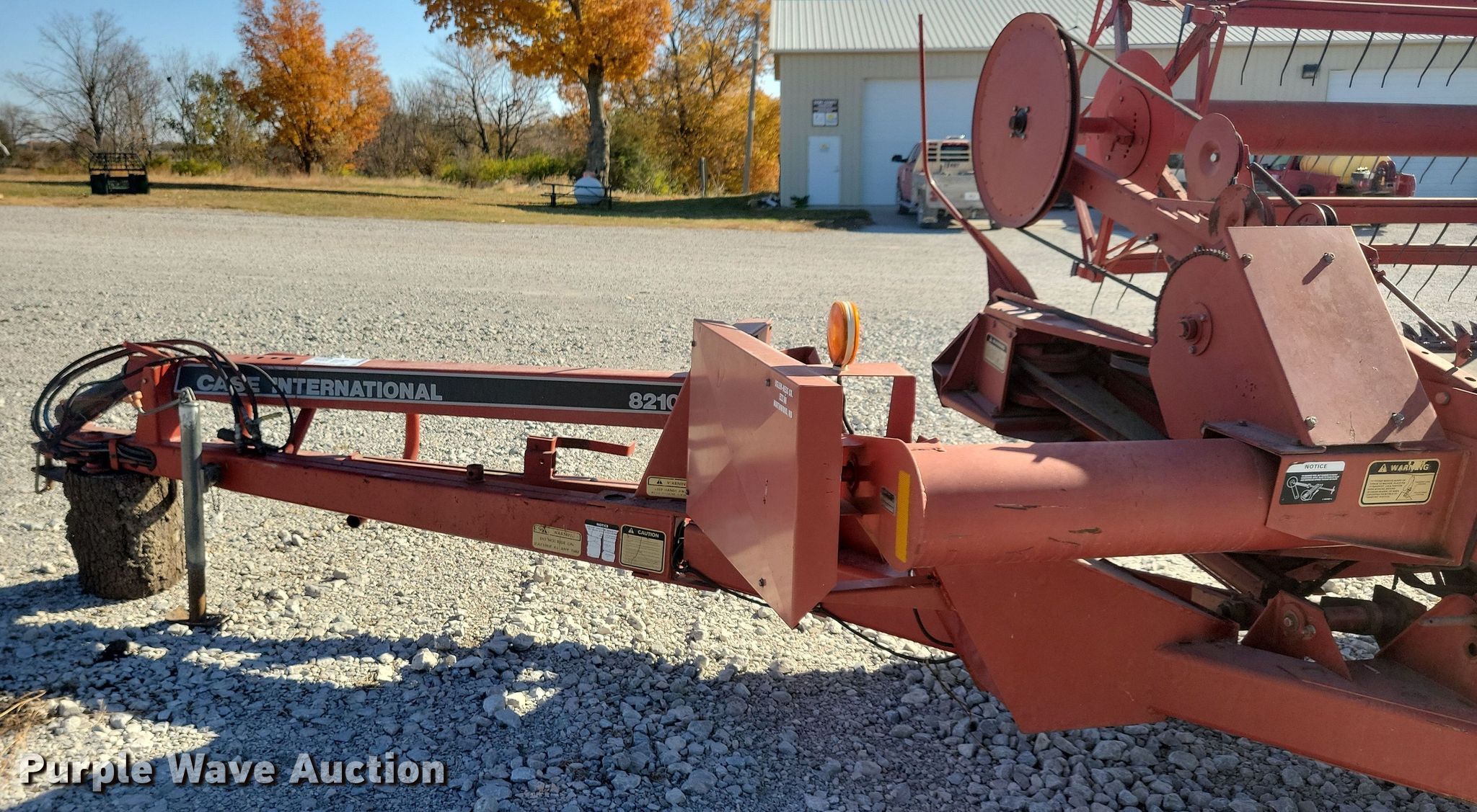 1992 Case IH 8210 swather / windrower. Serial: CFH0064015. Features Hitch Draw bar, Head Sickle, Width: 21', Hydraulic fore/aft. Tires Size: 9.5L-14SL. Notes PTO half shaft missing. Story County Conservation Board. Nevada, IA 50201