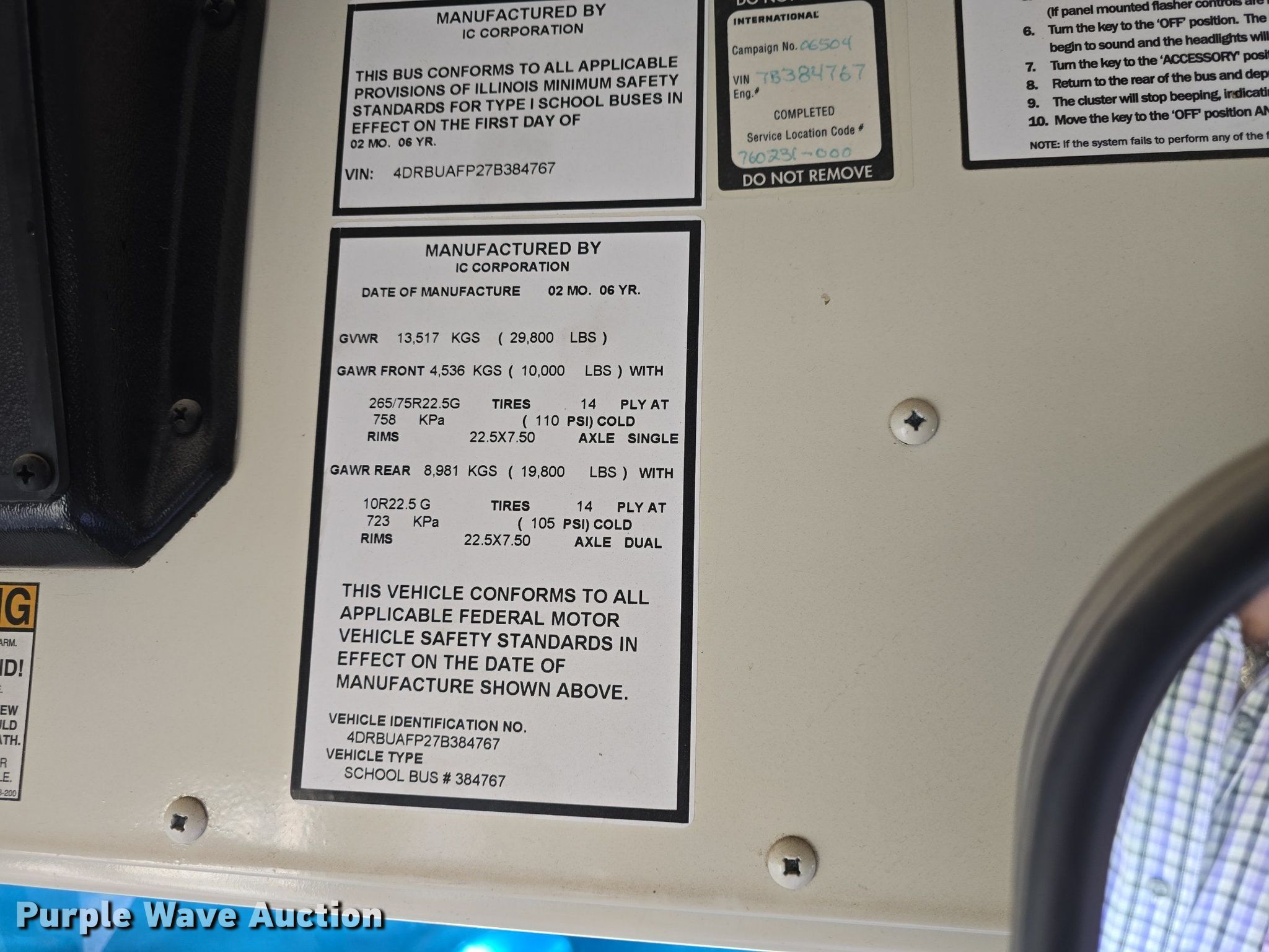 2007 IC CE200 school bus. Miles: 89,673 on odometer, Hours: 3,696 on meter, VIN: 4DRBUAFP27B384767. Engine Displacement: 6.0L, Cylinders: 8, Fuel type: Diesel. Transmission Automatic. Chassis Axles: Single, Suspension: Spring, Brakes: Hydraulic, GVWR: 29,800 lbs, Wheelbase: 216". Interior Heat, Heated mirrors, Cruise control, Electric passenger sliding door, Passengers: 53. Tires Size: 11R22.5. Notes Dead battery. Kansas title. Title distribution may be delayed up to 14 days from verification of funds. Burlingame, KS 66413