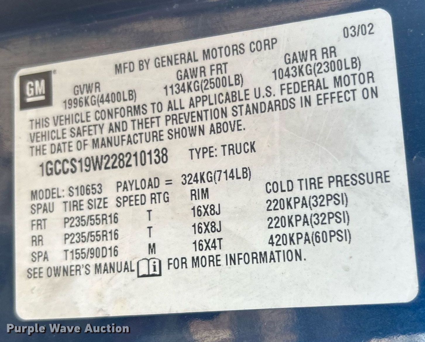 Purple Wave is selling a used Compact Pickup or Van in Oklahoma. This item is a 2002 Chevrolet S10 Ext. Cab pickup truck with the following: Miles: 184,318 on odometer, VIN: 1GCCS19W228210138, Unit #: 626