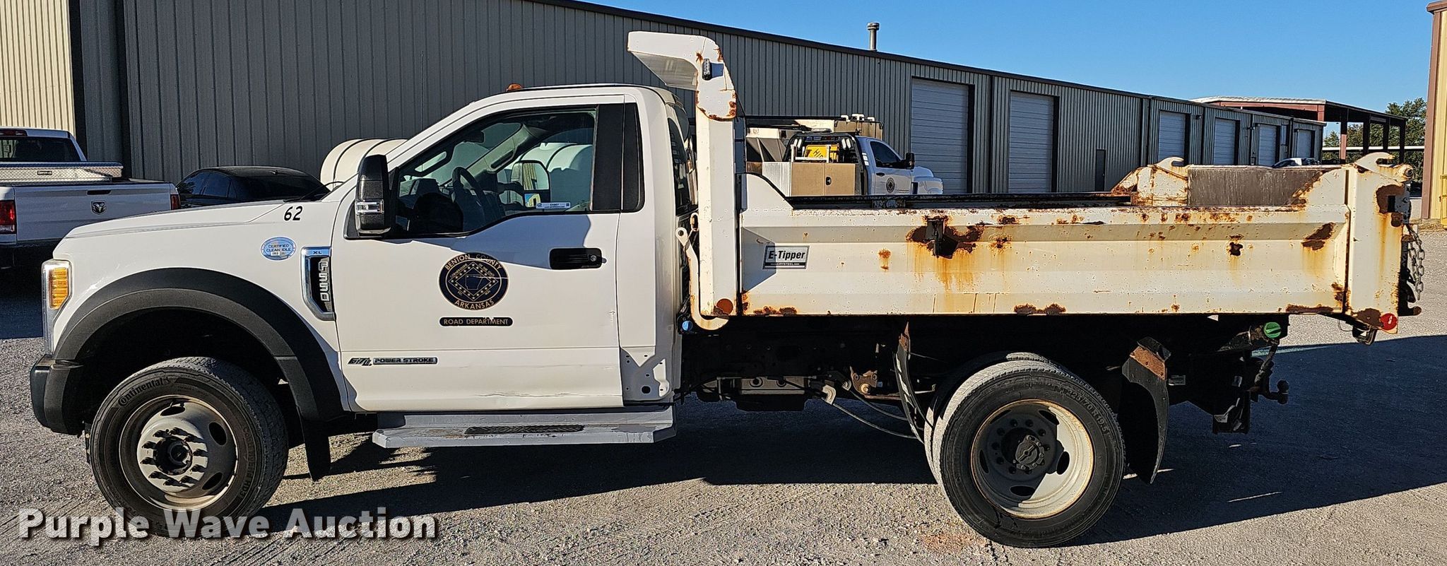 2017 Ford F550 dump truck. Miles: 122,961 on odometer, Miles or hours may vary, unit still in use, VIN: 1FDUF5HT9HED94491. Engine Displacement: 6.7L V8 OHV, Cylinders: 8, Fuel type: Diesel. Transmission Automatic. Chassis Axles: Single, Suspension: Spring, Brakes: Hydraulic. Interior AC, Heat. Features Dump bed Crystal E-Tipper, 9' 8" L x 94" W, Side height: 14", Bed type: Steel, Ram: Single, End gate: Manual. Tires Size: 225/70R19.5. Notes Receiver hitch not included, Contents not included, Wiring harness will be removed prior to auction, Driver door handle damaged Will be repaired prior to auction, Dash warning indicator: Check engine, Airbag. Arkansas title. Title distribution may be delayed up to 14 days from verification of funds. Benton County Road Dept. Bentonville, AR 72712