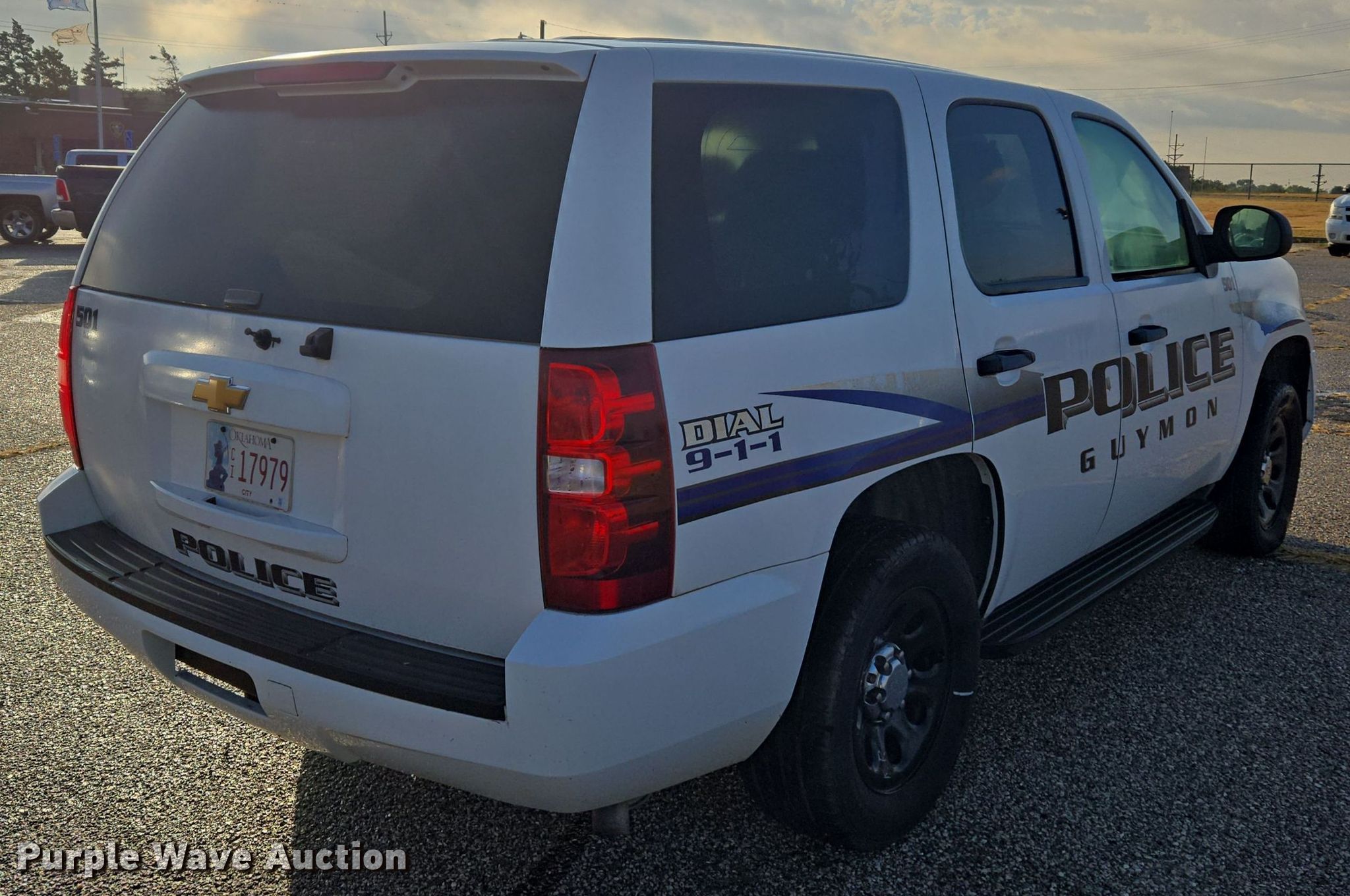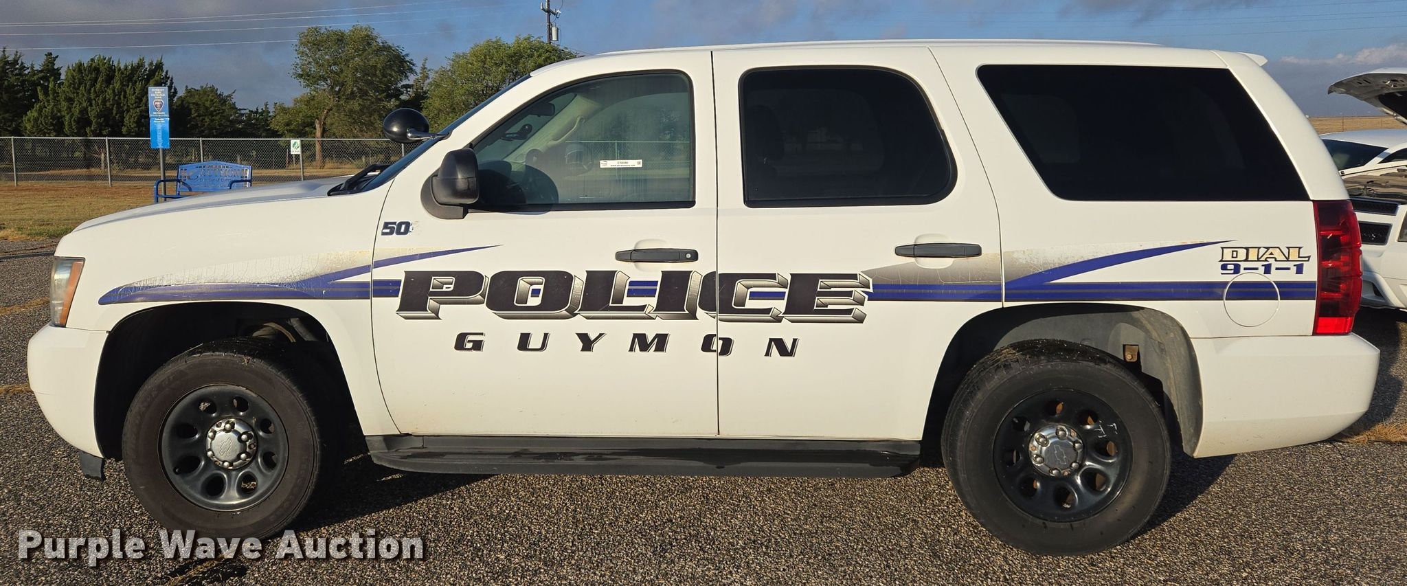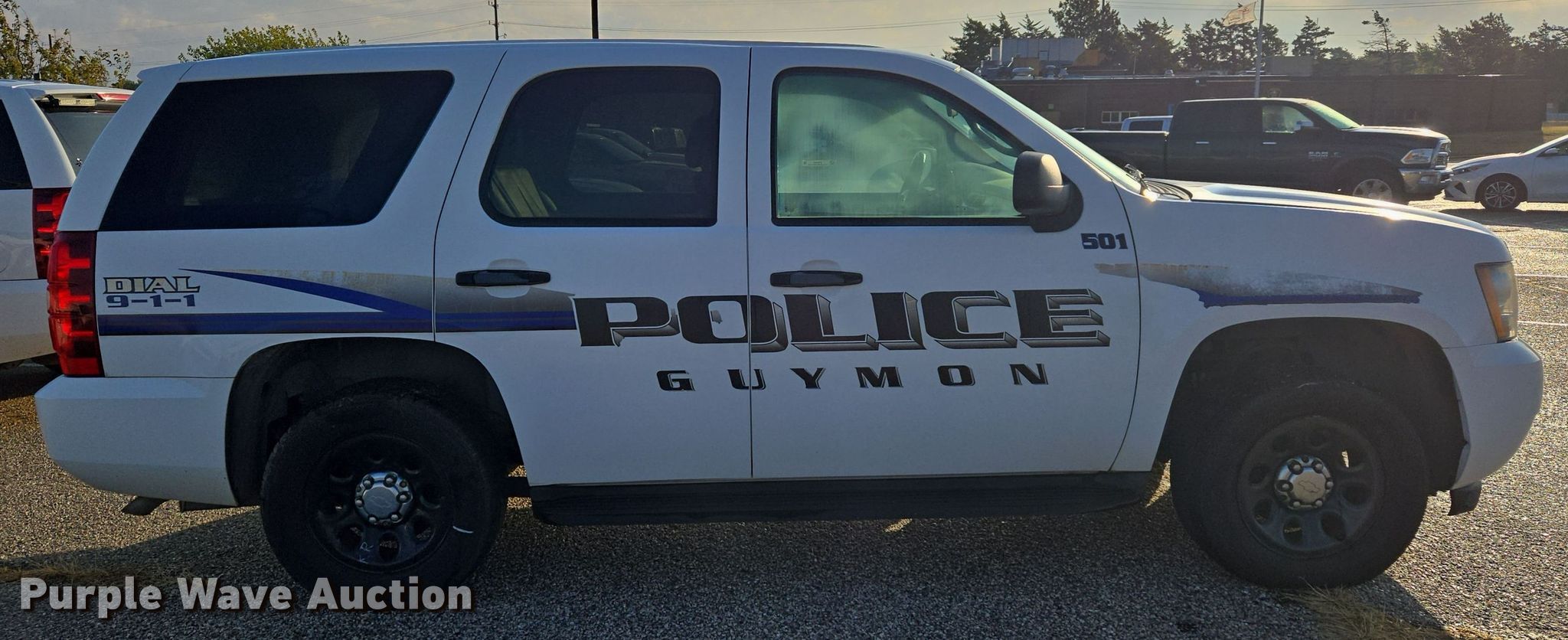 2012 Chevrolet Tahoe Police SUV. Miles: 117,389 on odometer, VIN: 1GNLC2E05CR280241, Unit #: 501. Engine Displacement: 5.3L V8 OHV, Cylinders: 8, Fuel type: Gas. Transmission Automatic. Interior AC, Heat, Seat: Power driver, Power passenger, Power windows, Power locks, Cruise control. Tires Size: 265/60R17. Notes Law enforcement equipment will be removed prior to auction, Dash warning indicator: TPMS, Airbag, Windshield chipped or cracked. Oklahoma title. Title distribution may be delayed up to 30 days from verification of funds. City of Guymon, OK. Guymon, OK 73942