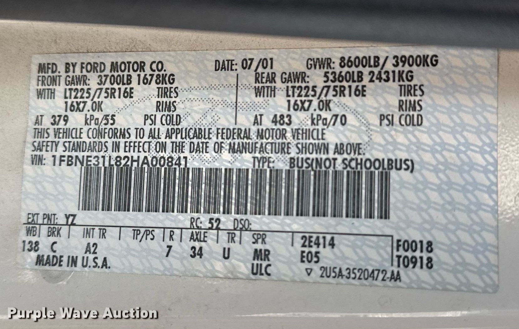 Purple Wave is selling a used Passenger Vehicle in Oklahoma. This item is a 2002 Ford E350 Super Duty XL van with the following: Miles: 90,136 on odometer, VIN: 1FBNE31L82HA00841, Unit #: 801
