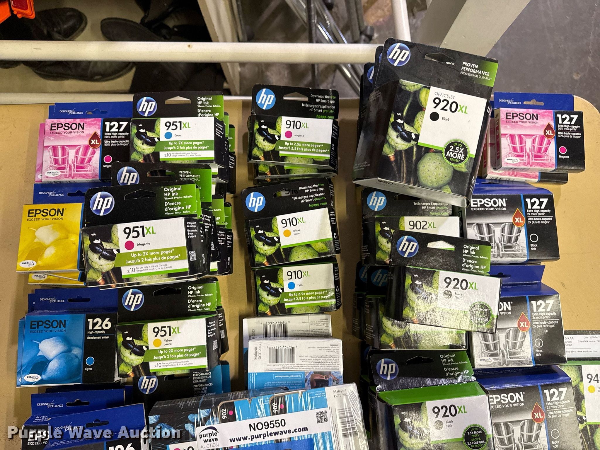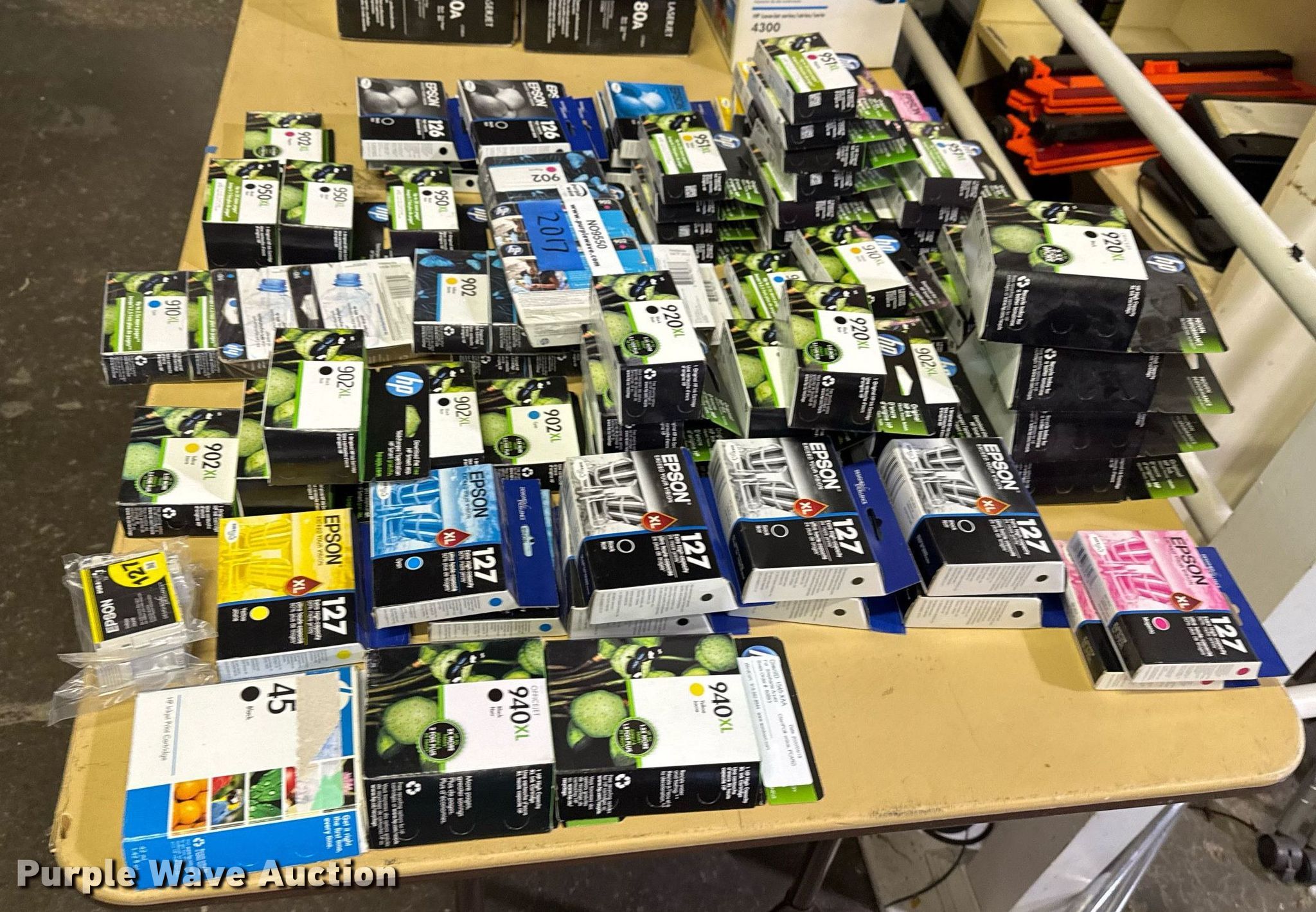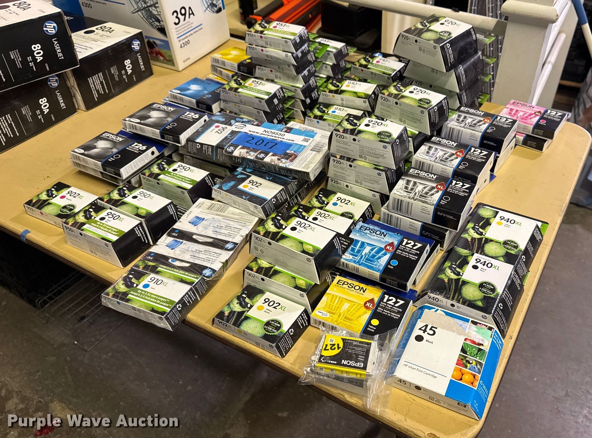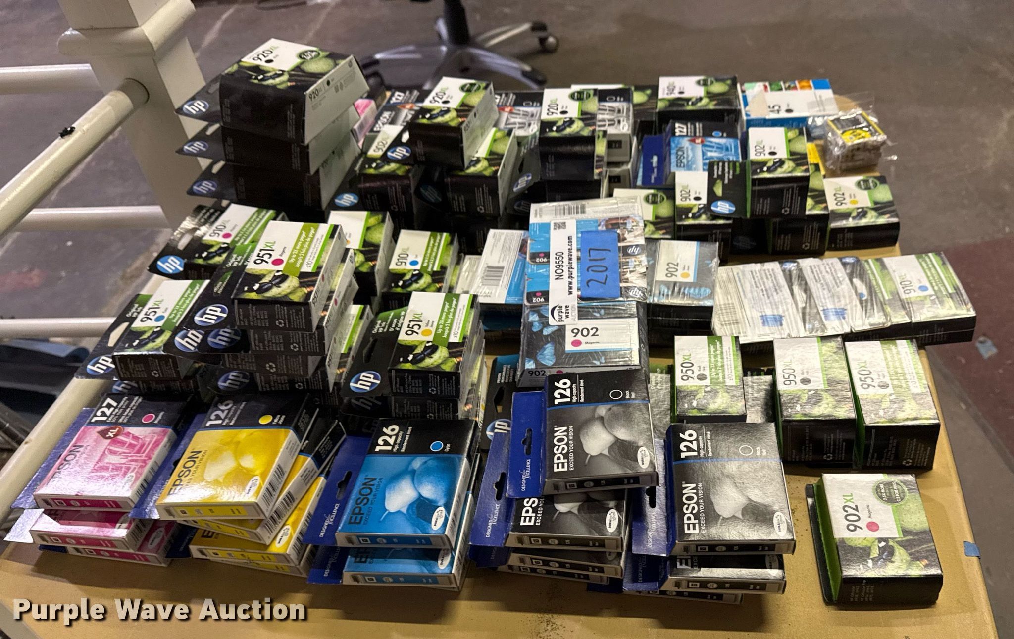Purple Wave is selling a used Office Supplies and Equip. in Oklahoma. This item is a Approximately 85 ink cartridges with the following: Unit #: 2017, Epson 126, Epson 127, HP 902XL, HP 910XL, HP 951XL, HP 940XL